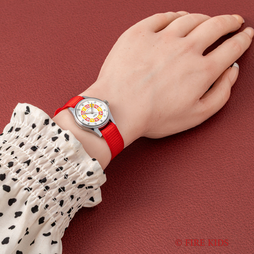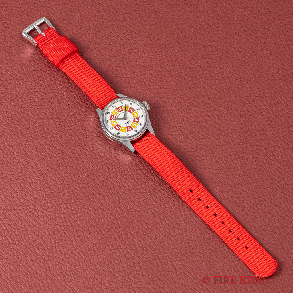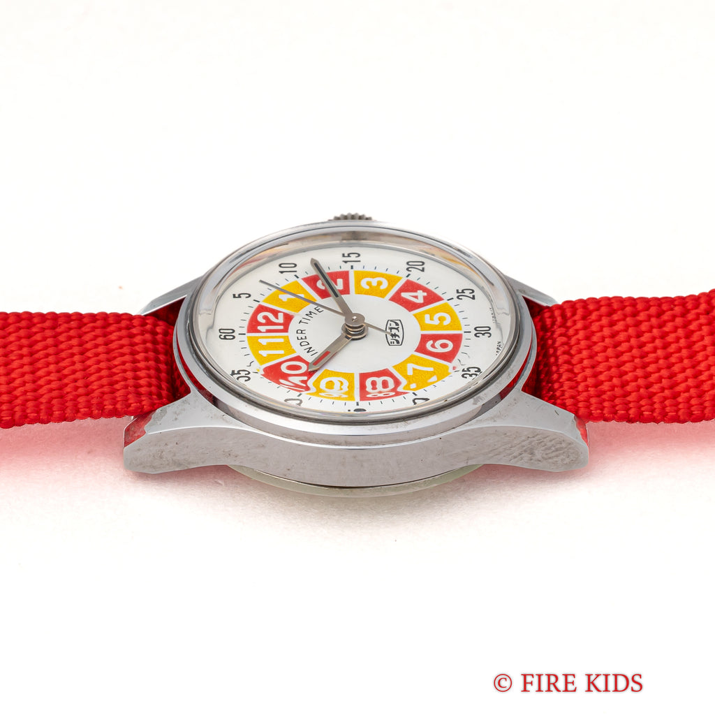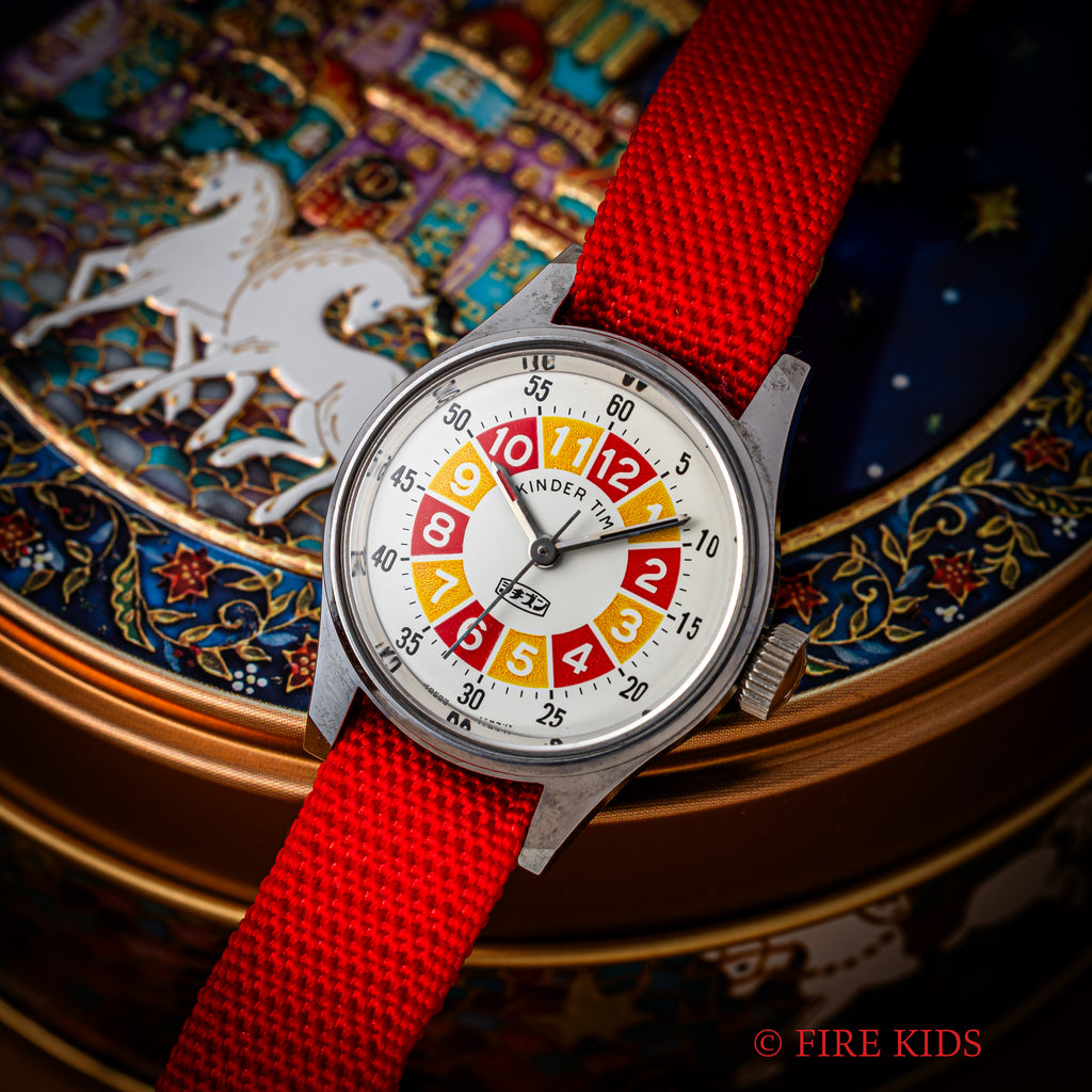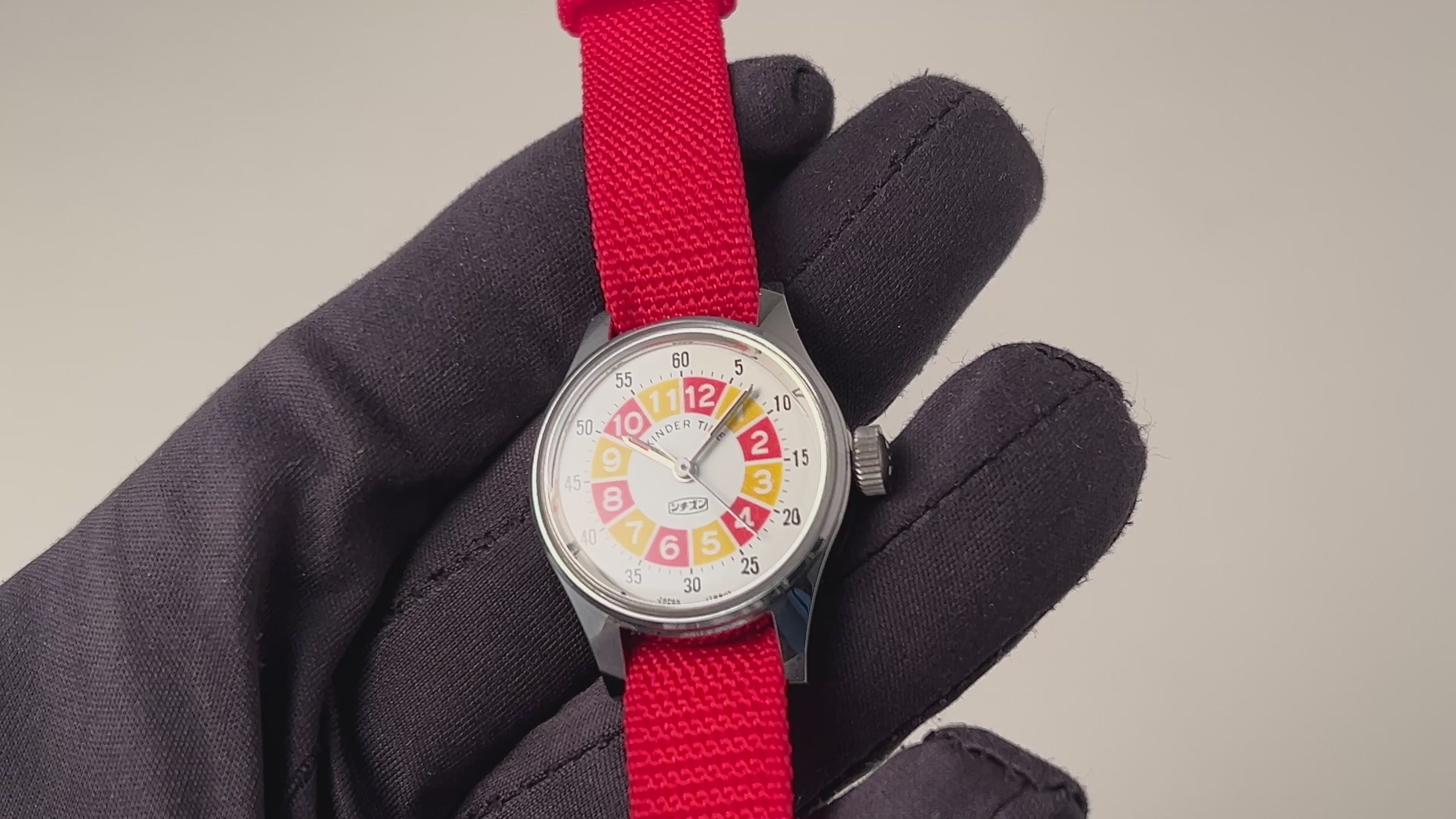 1970年代製のシチズンキンダータイム手巻きモデルです。子供達が容易に「時間・時刻」が理解出来るように文字板に特殊なデザインを採用した時計として1968年に販売されました。カタカナ表記のシチズンのプリントロゴが可愛らしい一本です。ムーブメントは手巻き7石の機械を搭載。手巻きや針回しの操作はスムースです。ケースは小傷はございますが大きなダメージはございません。ベルトはナイロンベルトに純正尾錠が取り付けてあります。