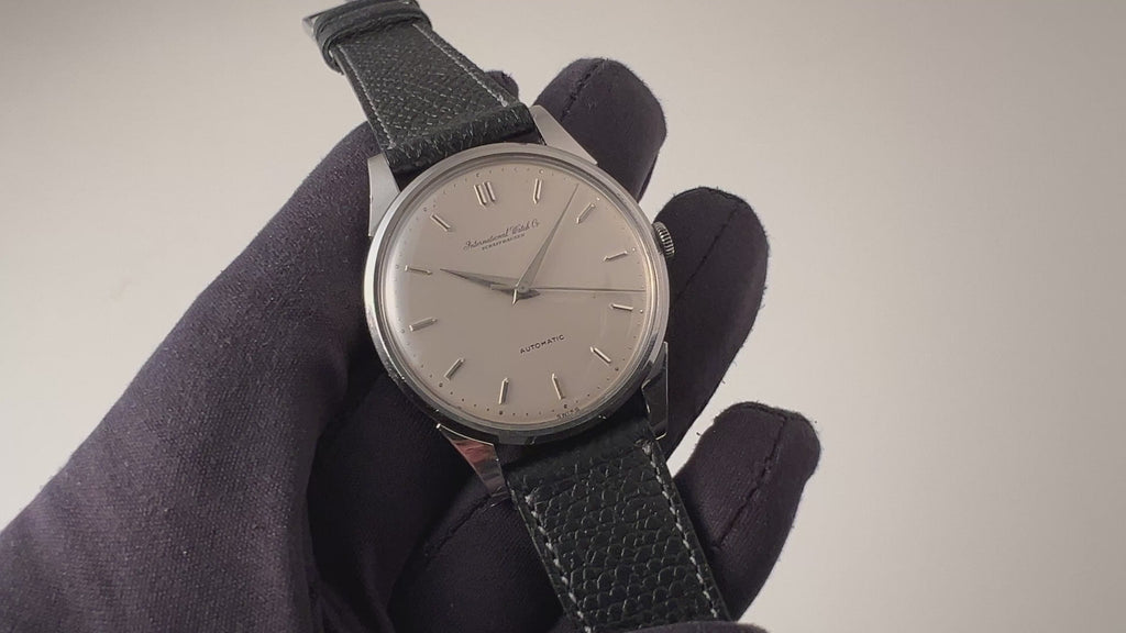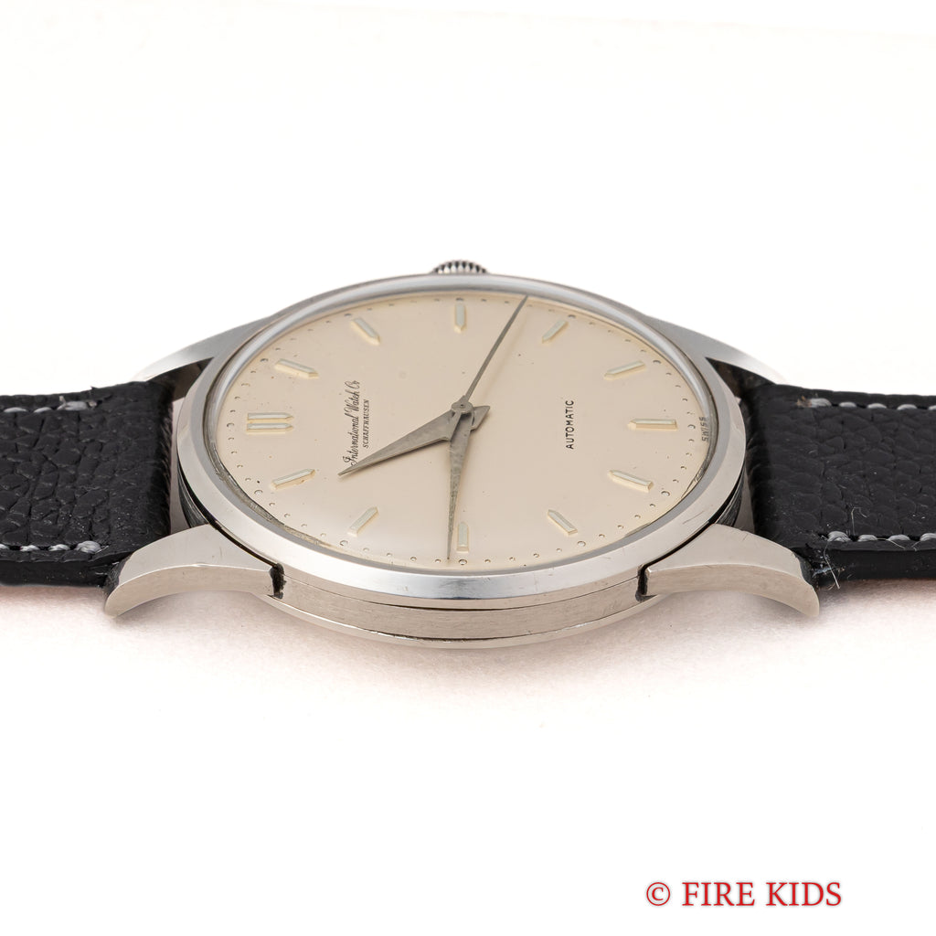 インターナショナルウォッチカンパニー プラチナケース 1960年製(昭和35年製)ペラトン式自動巻 Cal.853の入荷になります。スイス製ではありませんがプラチナ製のケースです。文字盤はIWCでは珍しい艶感のあるアイボリーダイヤルになっています。文字盤はシミ等無く綺麗です。ケースは小傷が見られますが大きなダメージはありません。手巻きや針回しの操作はスムースです。ムーブメントはペラトン式自動巻のCal.853を搭載しています。ベルトは社外のカーフが取り付けられています。こちらの時計は分解掃除済みです。