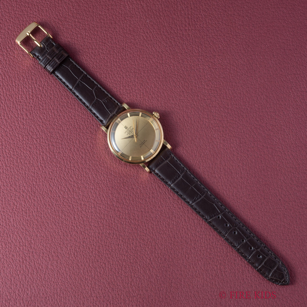 ユニバーサル・ジュネーブ 18金無垢ポールルーター デラックス 1950年代製 自動巻 Cal.138SS の入荷になります。ユニバーサル・ジュネーブの名作ポールルーターの初期型18金無垢ケース、タキシードダイヤルです。バンパー式オートマチックの独特の4分の3回転ローターの感触が楽しめます。文字盤はシミ等無く綺麗です。ケースは小傷が見られますが大きなダメージはありません。ムーブメントはCal.138SSを搭載しています。ベルトはファイアーキッズオリジナルのクロコダイル革ベルトが取り付けられています。こちらの時計は分解掃除済みです。