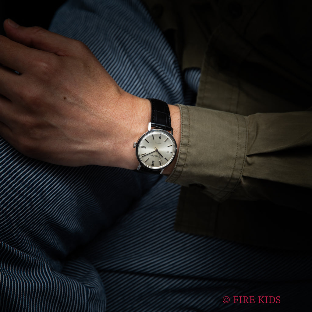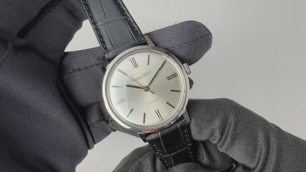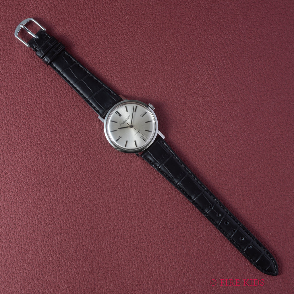 インターナショナルウォッチカンパニーの1964年製 飛びローマンダイヤルです。人気の筆記体の表記の文字盤で、幅約35mmとやや大きめのラウンドケースモデルでリューズは高い防水性を意味するお魚リューズです。シンプルながらも植字のバーインデックスとプリントのローマンインデックスを組み合わせた上品なデザインです。ムーブメントはペラトン式巻き上げのCal.854を搭載しています。文字盤は大きなダメージのない綺麗な状態です。ケースは全体に小キズがありますが、オリジナルのシェイプを保っています。ベルトはファイアーキッズオリジナルのクロコダイル革ベルトを合わせています。