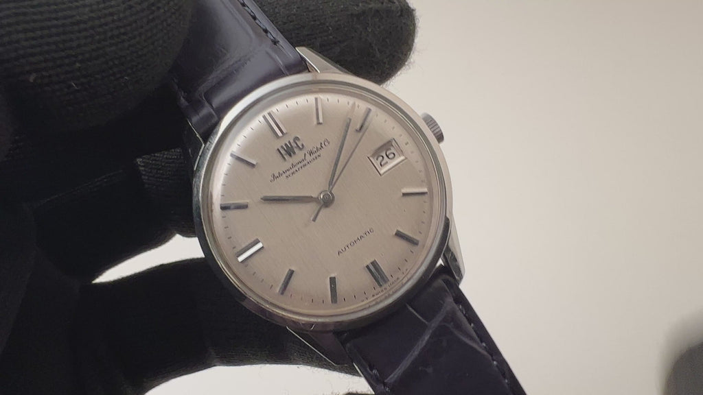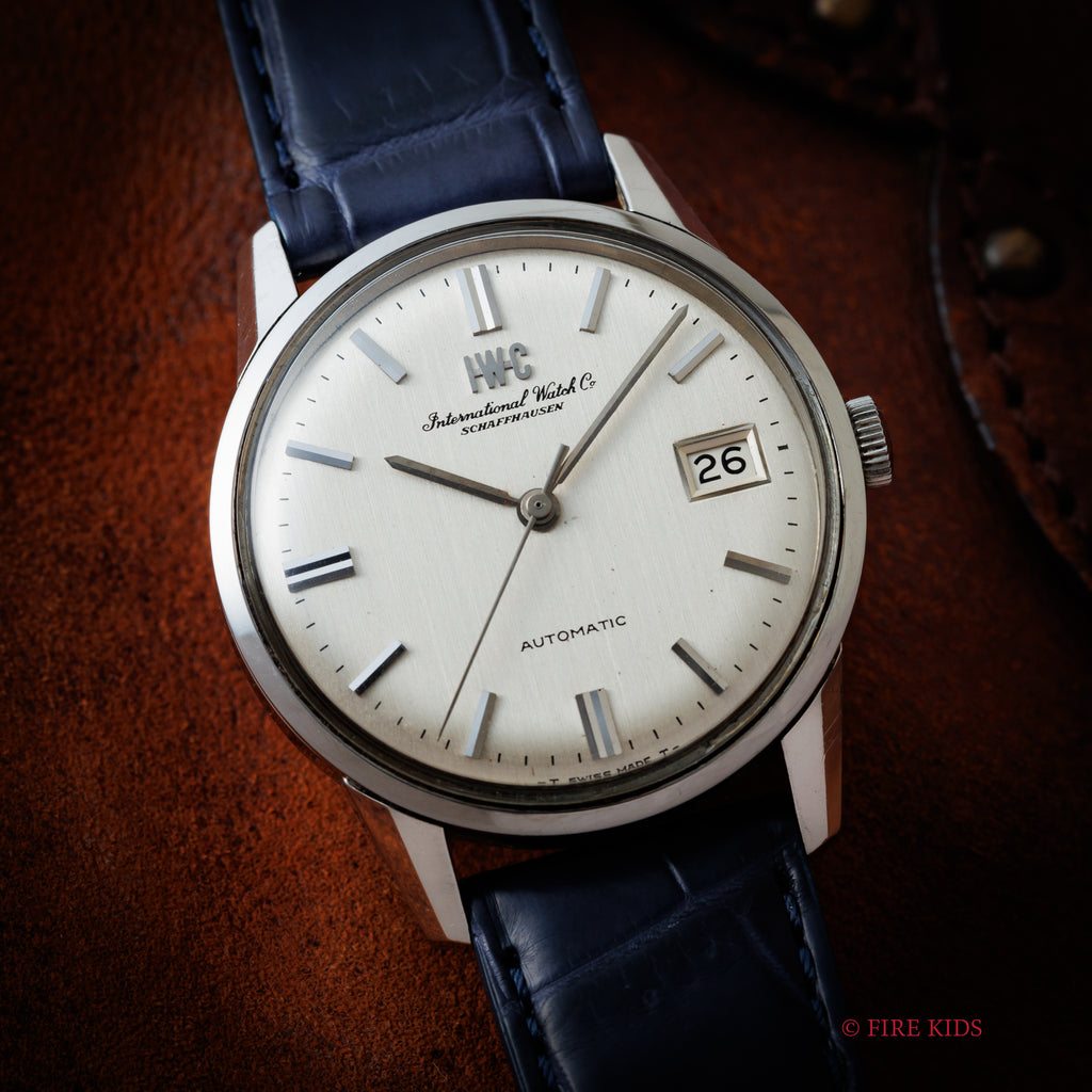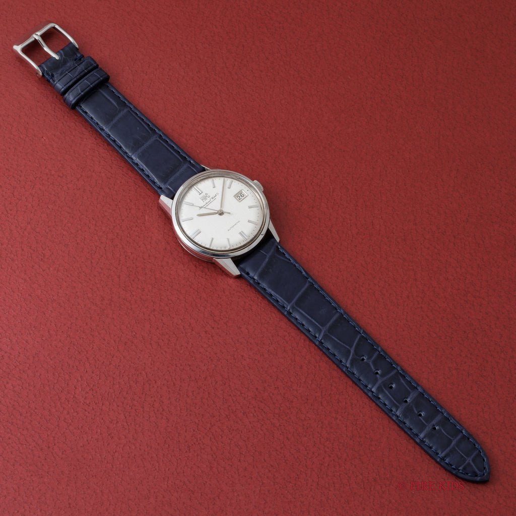インターナショナルウオッチカンパニーの1968年製自動巻きラウンドケースです。IWCとインターナショナルウォッチカンパニーの筆記体の両方に表記されている人気モデルです。ペラトン式自動巻きの完成形Cal.8541搭載でオールドインターらしいシンプルで質実剛健なモデルです。シンプルだからこそ造りの良さが感じられます。シルバー文字は大きなダメージのない良いコンディションです。ケースは小傷がありますが、過度な仕上げを感じない状態です。ベルトはファイアーキッズオリジナルのクロコダイル革ベルトが取り付けられています。