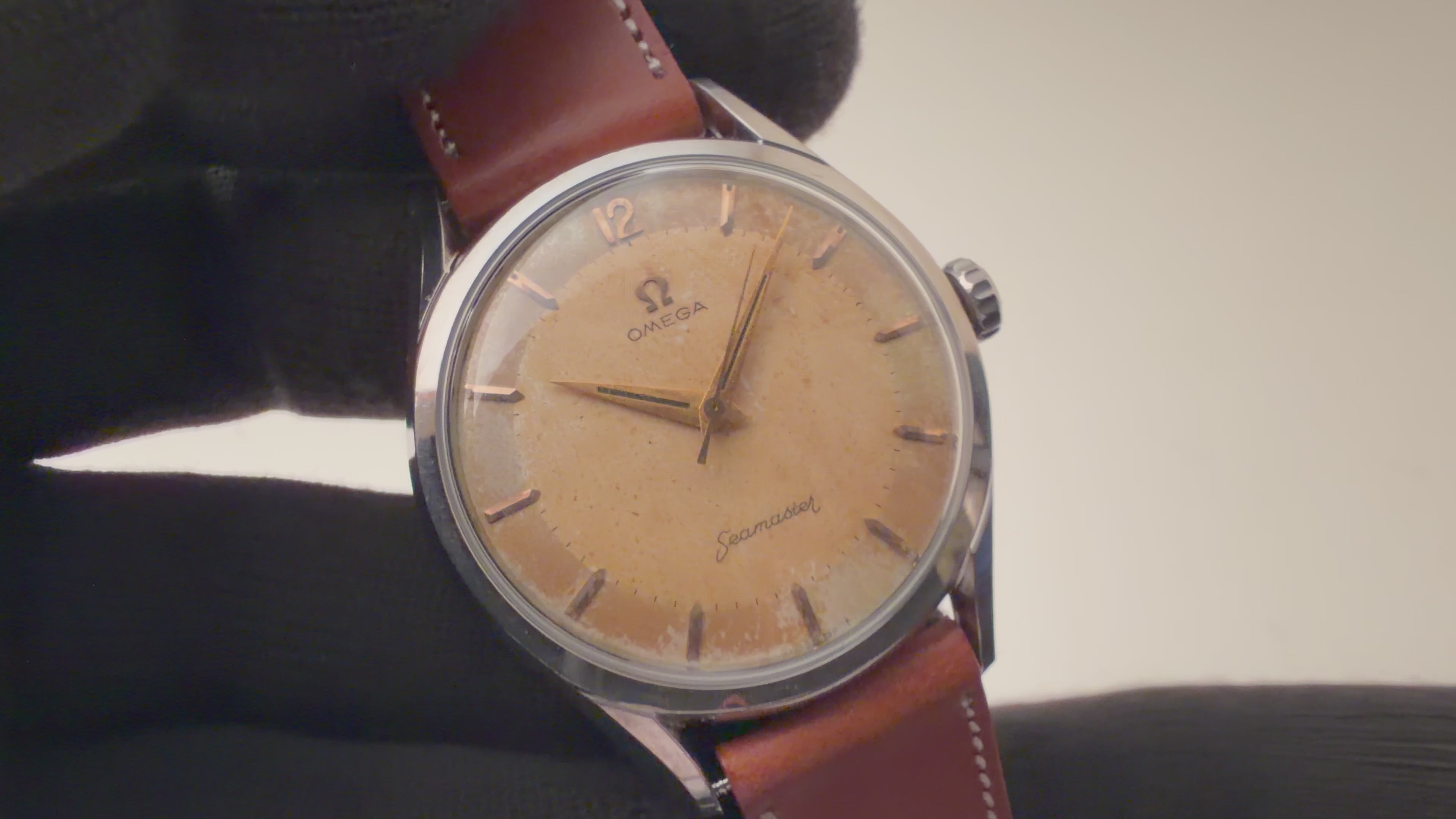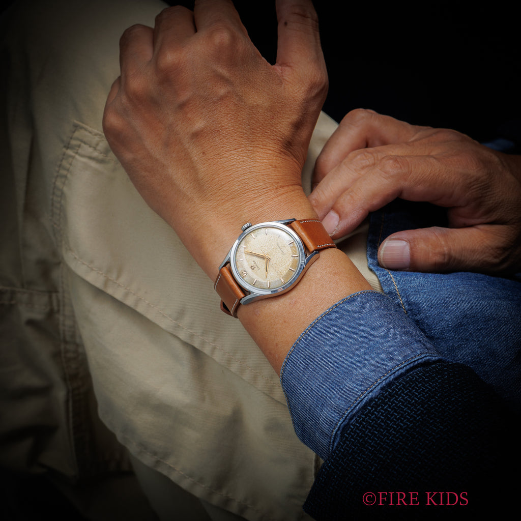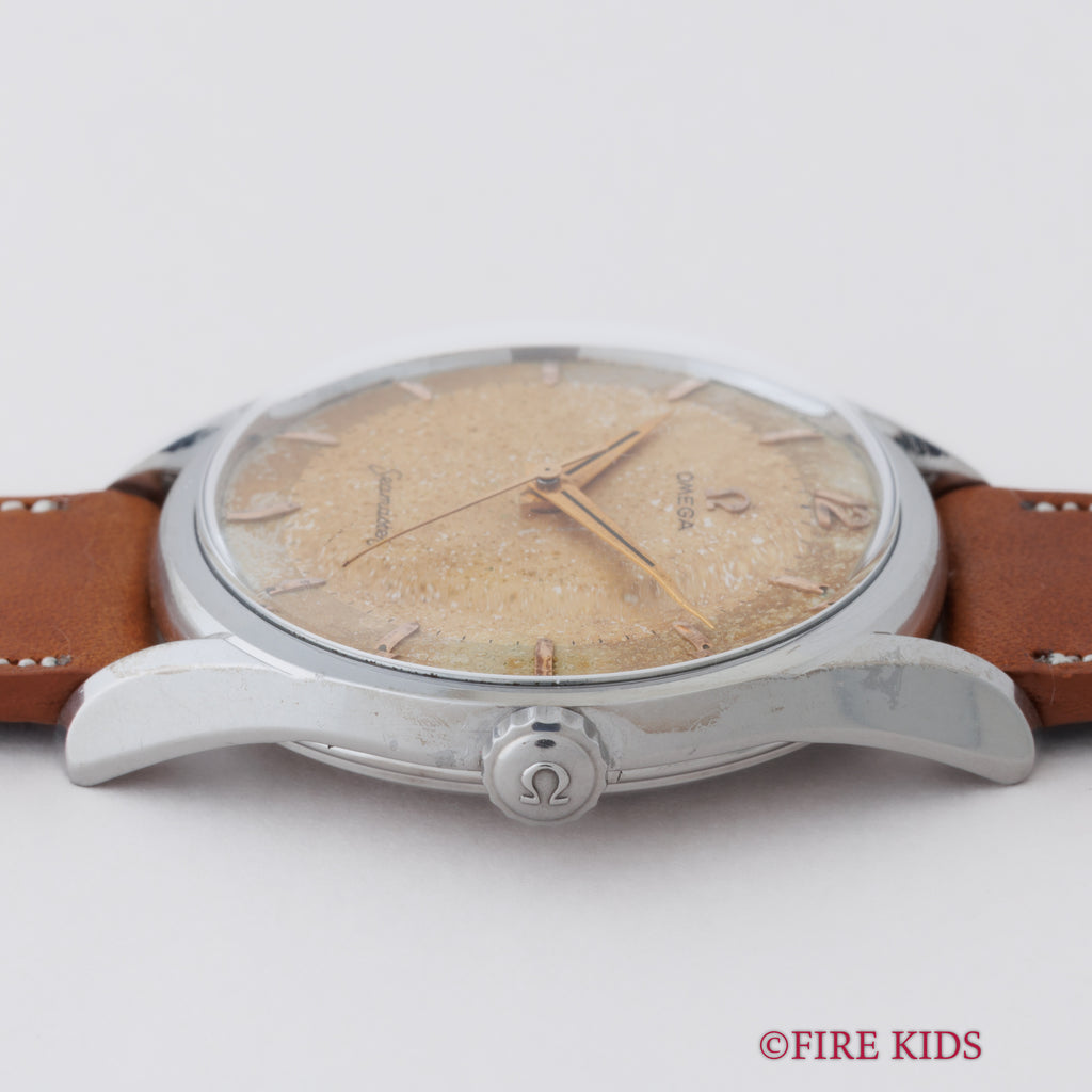 オメガ 30mmキャリバー 2トーン パティーナダイヤル 1956年製 手巻 Cal.284の入荷になります。文字盤が全体的に変色したパティーナダイヤルは唯一無二な一点物です。クサビインデックス、ドーフィンハンドと50年代らしいヴィンテージ感があります。ケースはややツイストしたラグがお洒落なスナップバックの仕様で小キズは見られますが大きなダメージはありません。ムーブメントは30㎜キャリバーシリーズのCal.284を搭載しています。ベルトはファイアーキッズオリジナルのイタリアンレザーのブッテーロ(裏面ラバー)が取り付けられています。こちらは分解掃除済みになります。