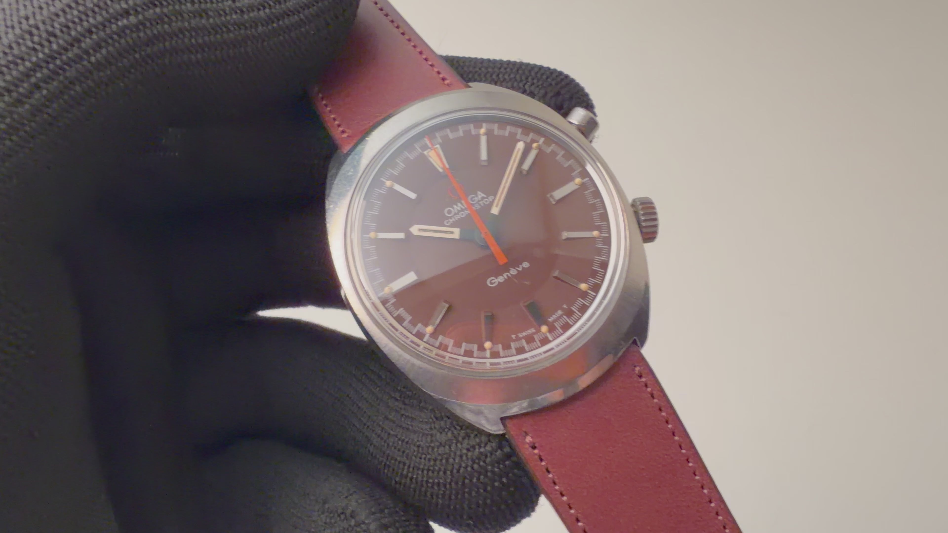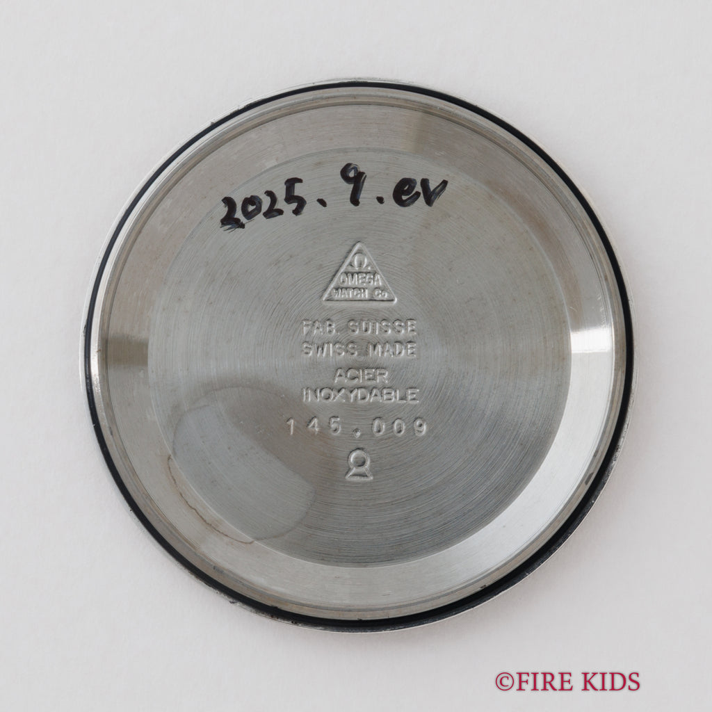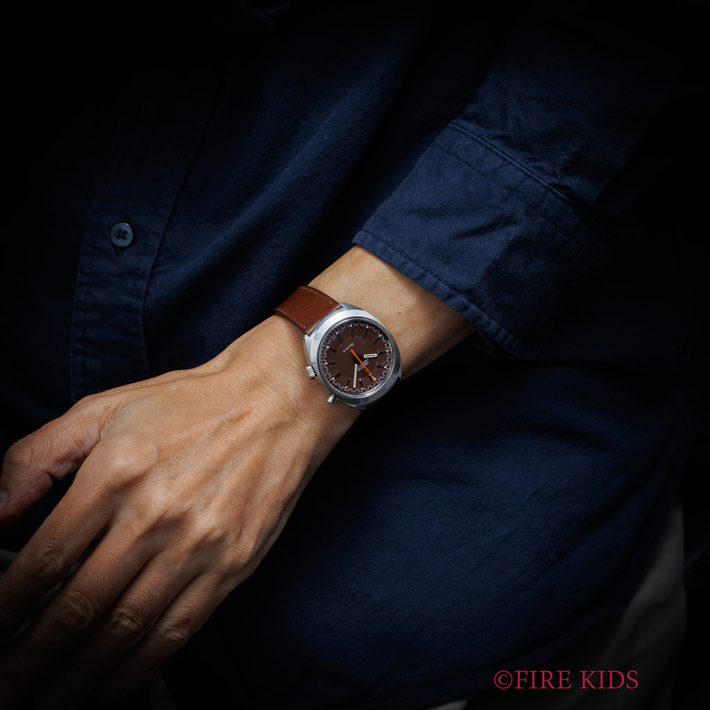 オメガ クロノストップ 1968年製 Ref.145.009 手巻 Cal.865 希少ブラウンダイヤルの入荷になります。オメガならではの70年代デザインと手の込んだ機械式ワンプッシュクロノ搭載の魅力あふれる一本です。2トーンのグレーダイアルは気になるダメージもなく、オレンジの針が良いアクセントになっています。ムーブメントはCal.865を搭載、簡易式ワンプッシュクロノグラフで、プッシャーを1回押すとオレンジの針がスタート、もう1回押すとリセットされます。手巻きの操作感はスムースです。ベルトはファイアーキッズオリジナルのイタリアンレザーのブッテーロ(裏面ラバー)が取り付けられています。こちらの時計は分解掃除済みです。
