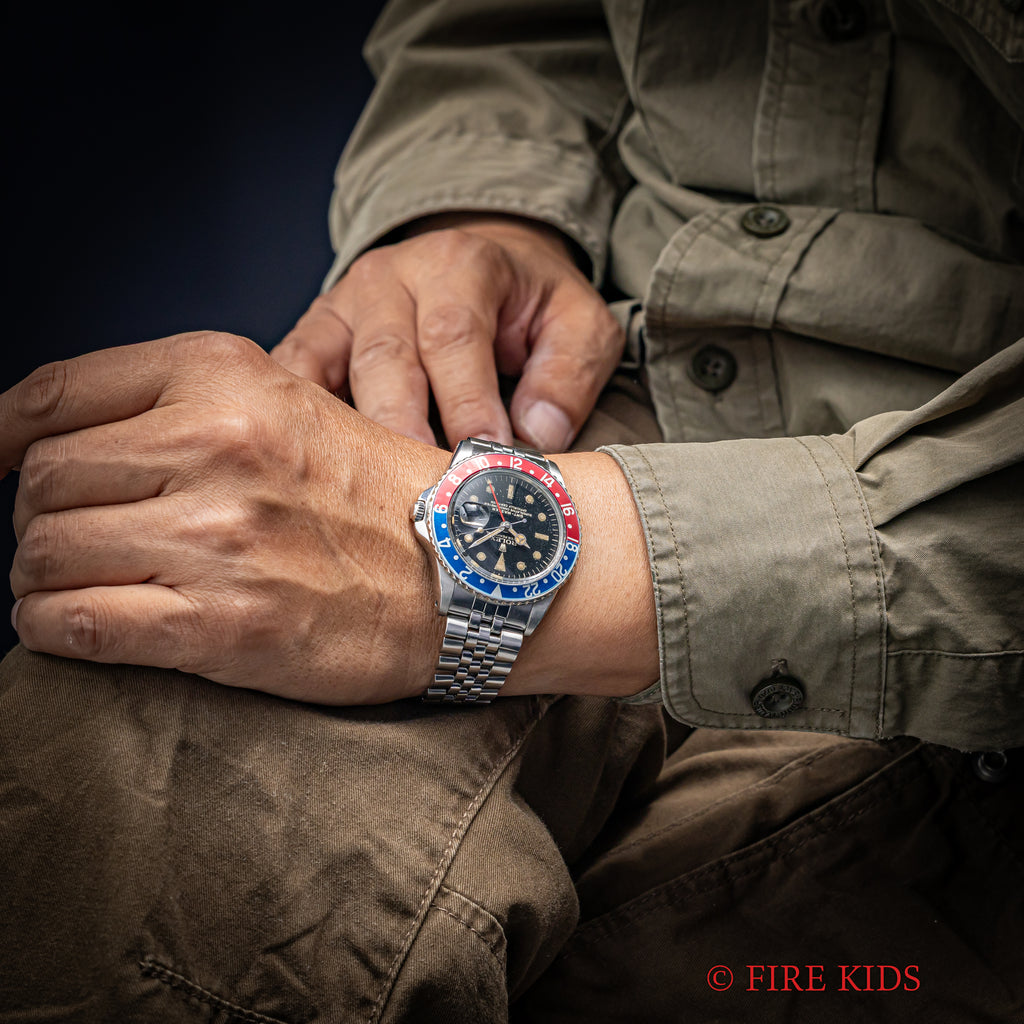 ロレックス GMTマスター 1963年製 Ref.1675 ラジアルミラーダイヤル 小針 アンダーバー PCGケースの入荷になります。人気のミラーダイヤルでも珍しい夜光が若干中央に寄ったラジアルダイヤル、クロノメーター表記の下にシルバーのアンダーバーと個性的なポイントがある文字盤です。ケースはリューズガードが尖ったPCGケースで特別感があります。文字盤は表面の劣化が見られますが艶感がしっかりと残った良い雰囲気になっています。ケースは小傷が見られますが大きなダメージはありません。ブレスは63年製のジュビリーブレスが取り付けられています。