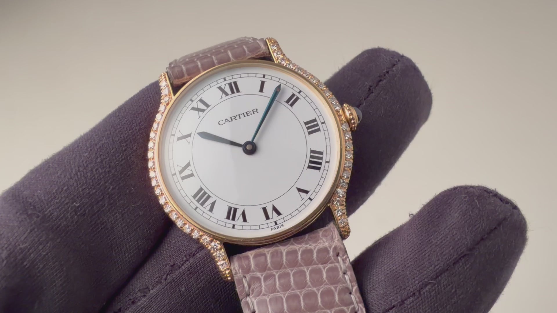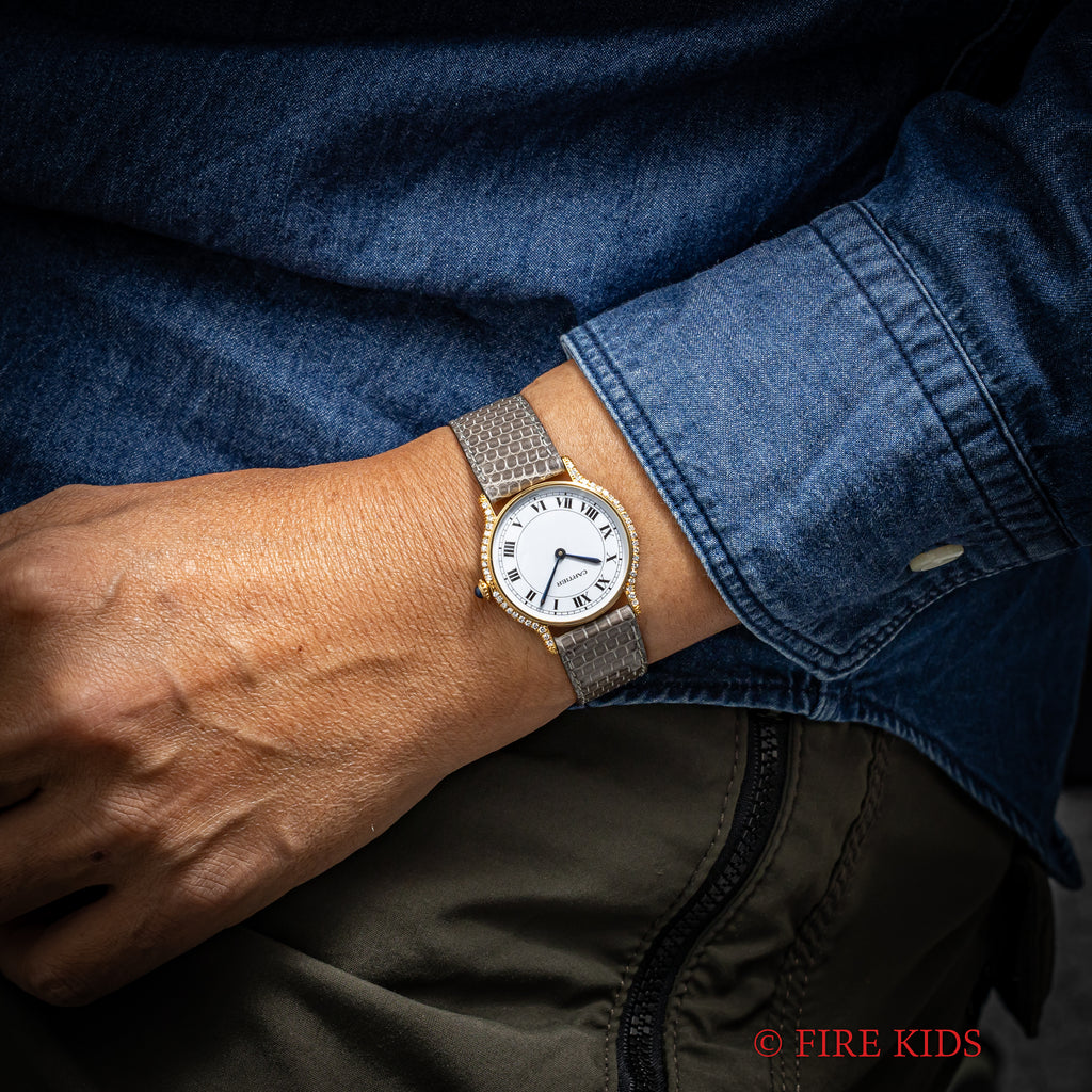 カルティエの1980年代製リヴィエラLMサイズ フルダイヤです。メンズサイズで幅約31mmと小振りなサイズがお洒落で上品です。金無垢ケースを採用したパリ表記は製造年数も短く希少なモデルになっています。カルティエらしいローマンダイヤルのエナメル文字盤は透明感があり特別感があります。ケースは小傷がありますが大きなダメージはありません。手巻きや針回しの操作はスムースです。ベルトは社外のレザーベルトが取り付けられています。こちらは分解掃除済みになります。