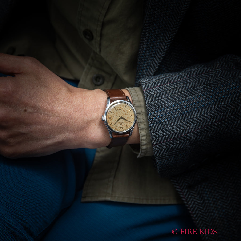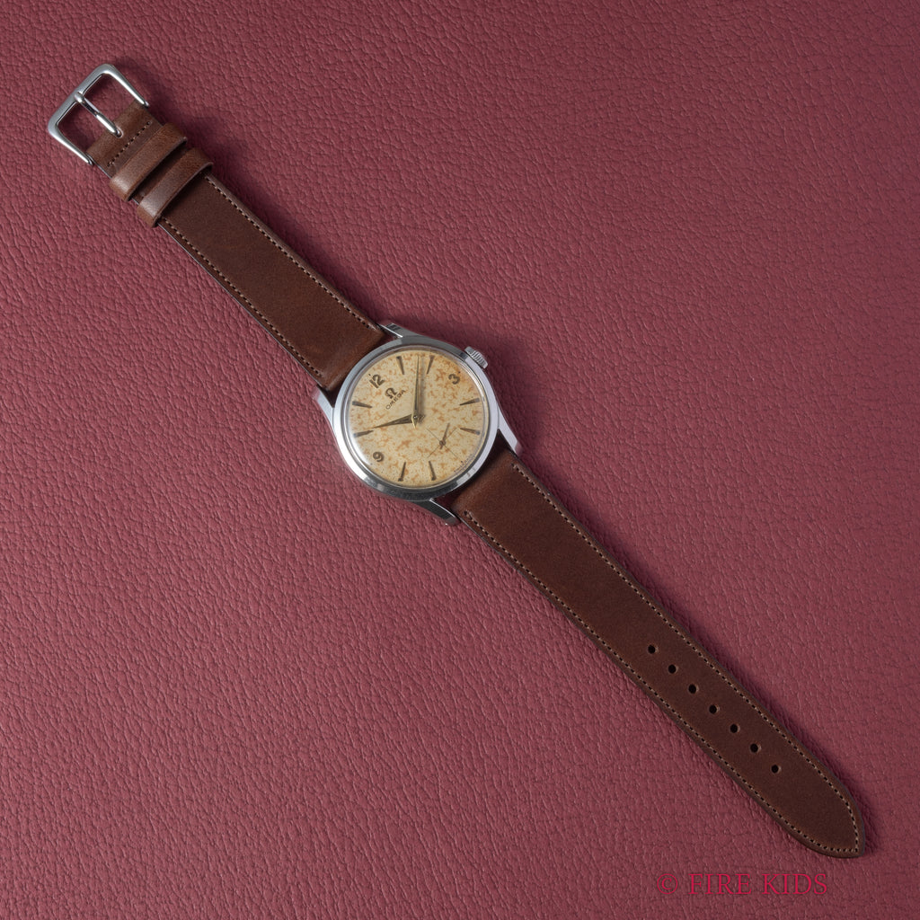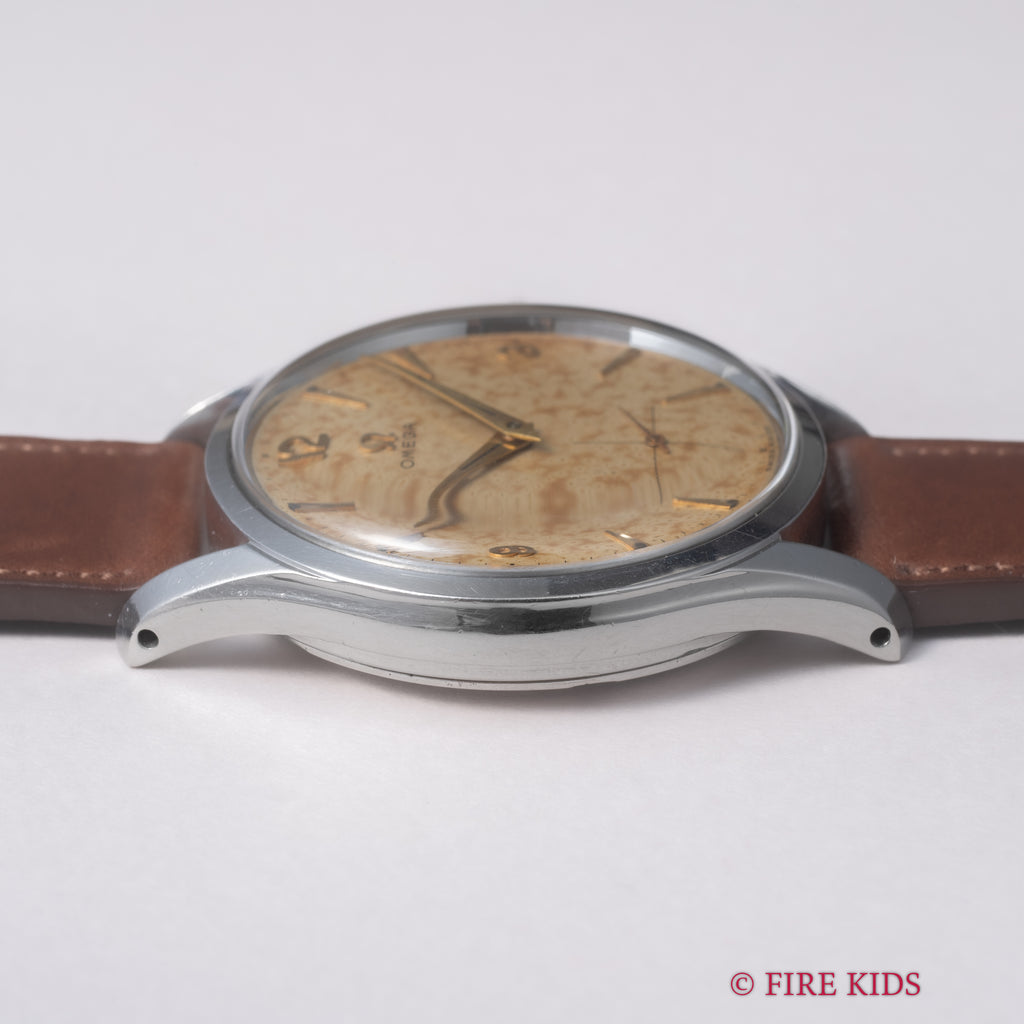 オメガ 30mmキャリバー パティーナダイヤル 1954年製 スモールセコンド手巻 Cal.266の入荷になります。文字盤が全体的に変色したパティーナダイヤルは唯一無二な一点物です。アラビア数字とクサビインデックス、ドーフィンハンド、スモールセコンドと50年代らしいヴィンテージ感があります。ケースはややツイストしたラグがお洒落なスクリューバックの防水仕様で小キスは見られますが大きなダメージはありません。ムーブメントは30㎜キャリバーシリーズのCal.266を搭載しています。ベルトはファイアーキッズオリジナルのイタリアンレザーのブッテーロ(裏面ラバー)が取り付けられています。