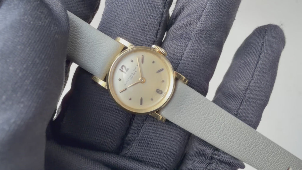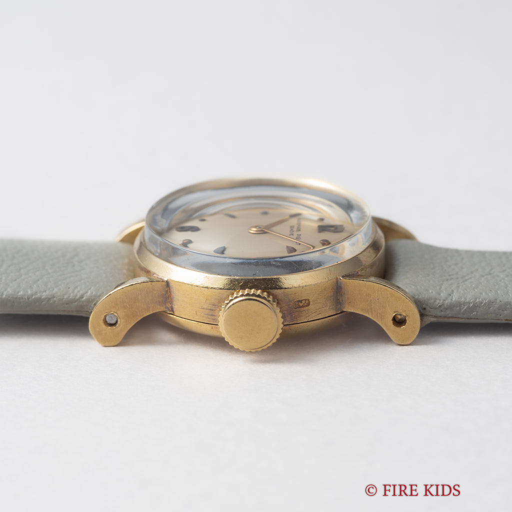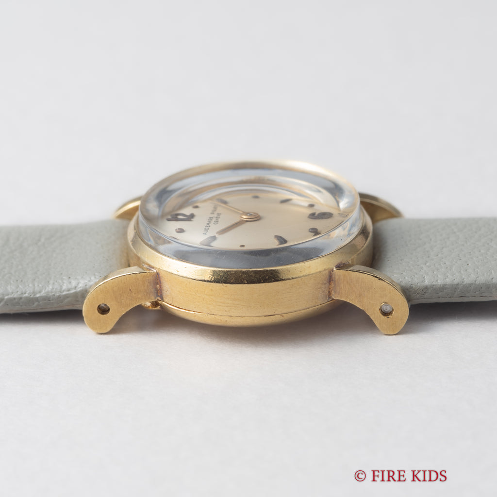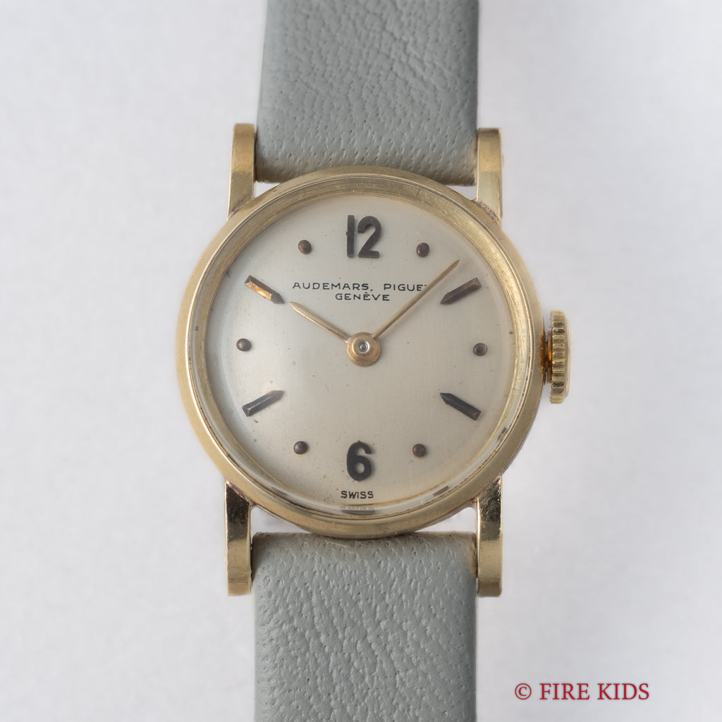 オーデマ・ピゲ レディース ラウンド 18金イエローゴールド 1950年代製 手巻きです。珍しいオーデマ・ピゲのレディースモデルです。ダイヤルはアラビアとドット、バーのインデックスが可愛らしく18金ケースとの組み合わせで高級感があります。年代なりの経年や小傷はありますが大きなダメージはありません。社外の革ベルトを合わせています。こちらは分解掃除済みです。