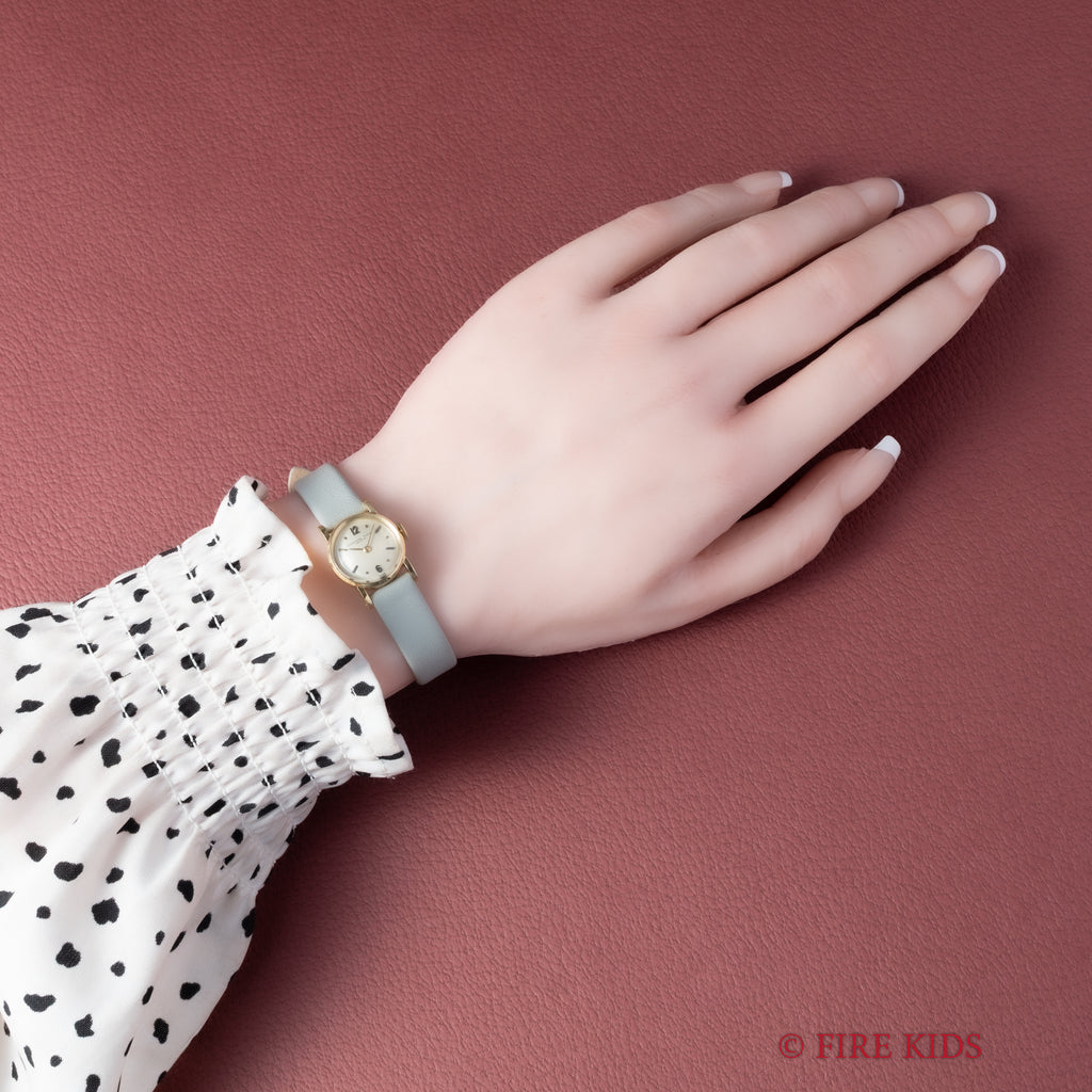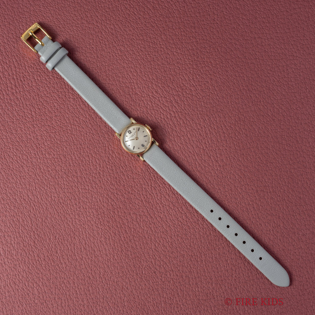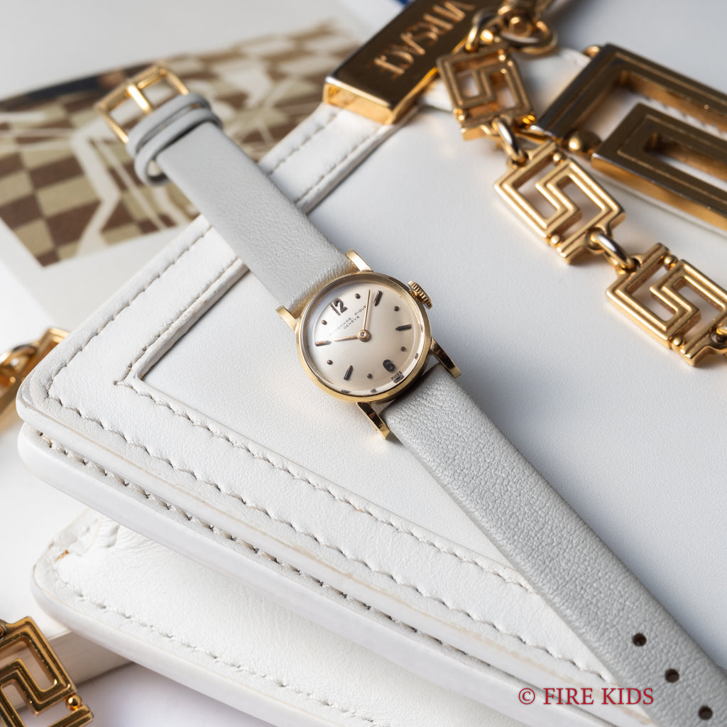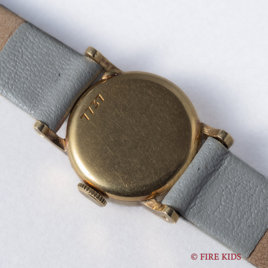 オーデマ・ピゲ レディース ラウンド 18金イエローゴールド 1950年代製 手巻きです。珍しいオーデマ・ピゲのレディースモデルです。ダイヤルはアラビアとドット、バーのインデックスが可愛らしく18金ケースとの組み合わせで高級感があります。年代なりの経年や小傷はありますが大きなダメージはありません。社外の革ベルトを合わせています。こちらは分解掃除済みです。