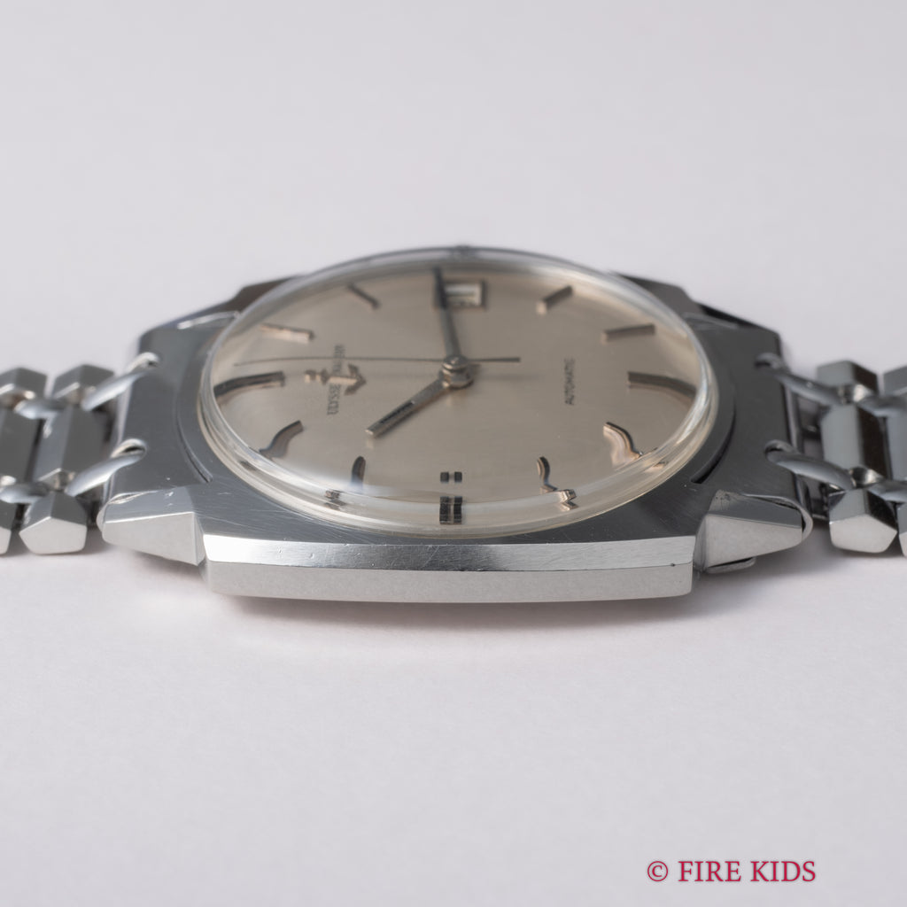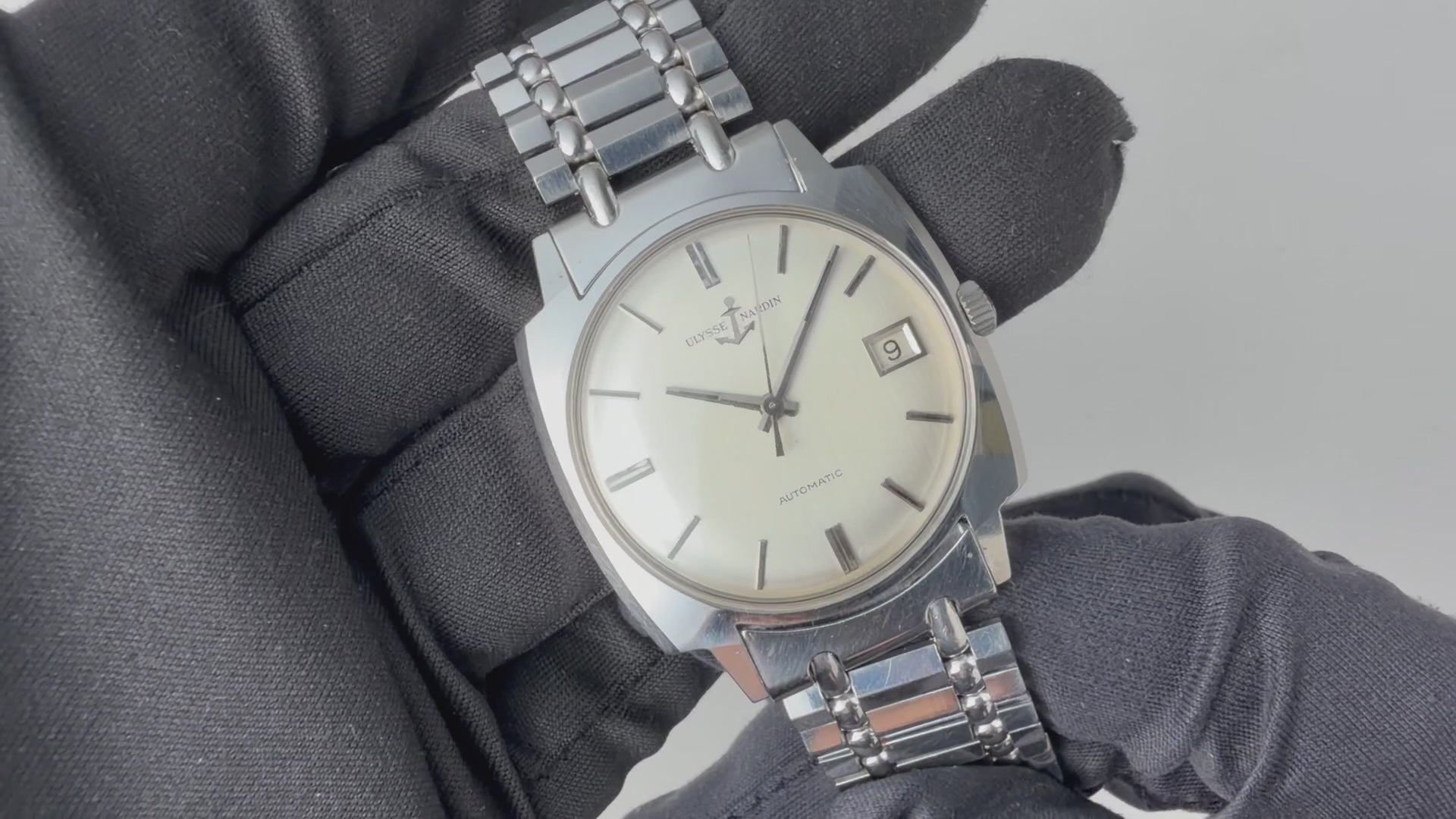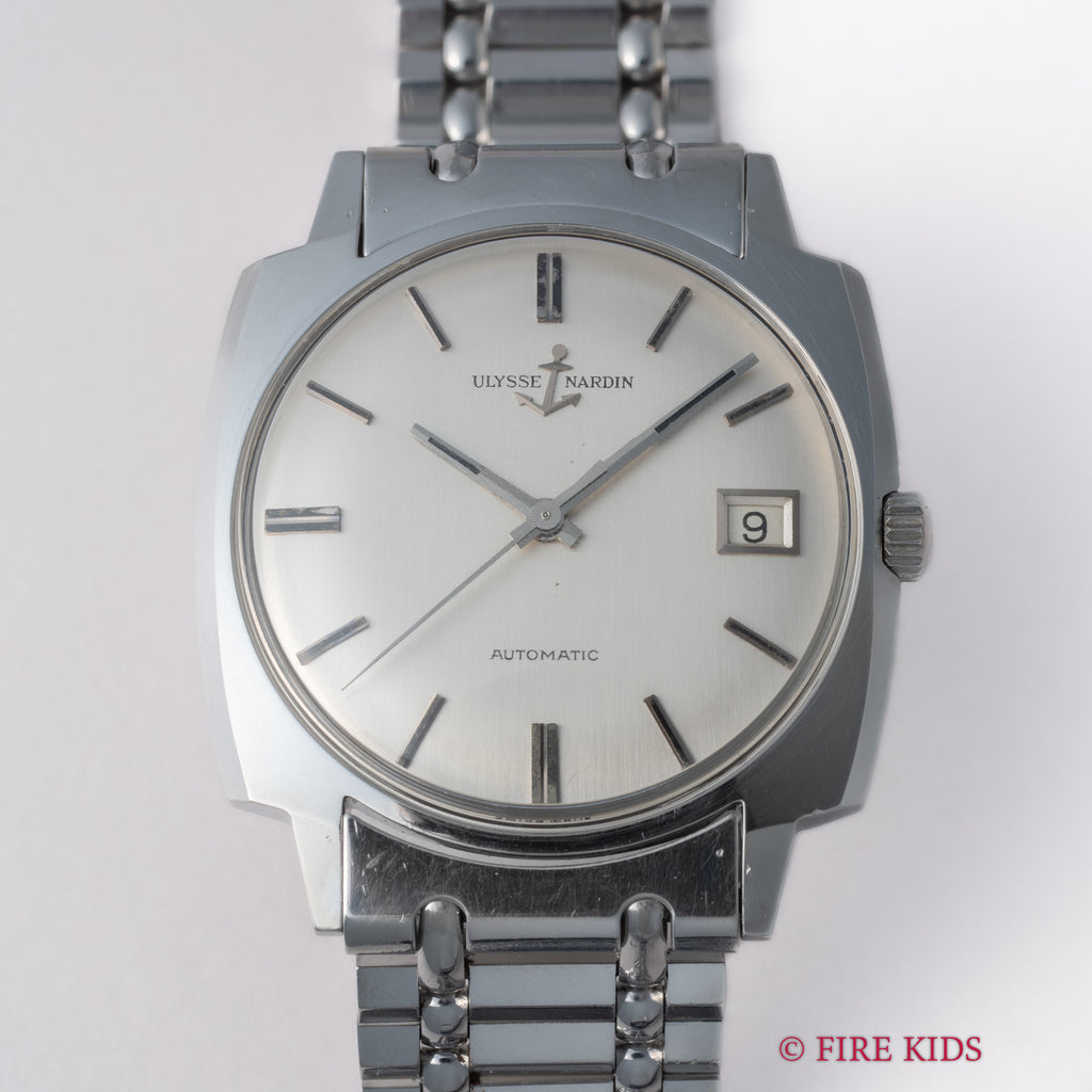 スイスの名門ユリスナルダン オートマチック1970年代製です。シンプルなクッションケースにシルバーダイヤルはヴィンテージ感ある品のある腕時計です。ダイヤルにはごくわずかな経年変化はありますが概ねキレイです。ケースも年代なりの経年や小傷、磨きはありますが大きなダメージはありません。ムーブメントはCal.N11HBです。手巻きや針回しはスムーズです。貴重な純正ステンレスブレス付です。こちらは分解掃除済です。