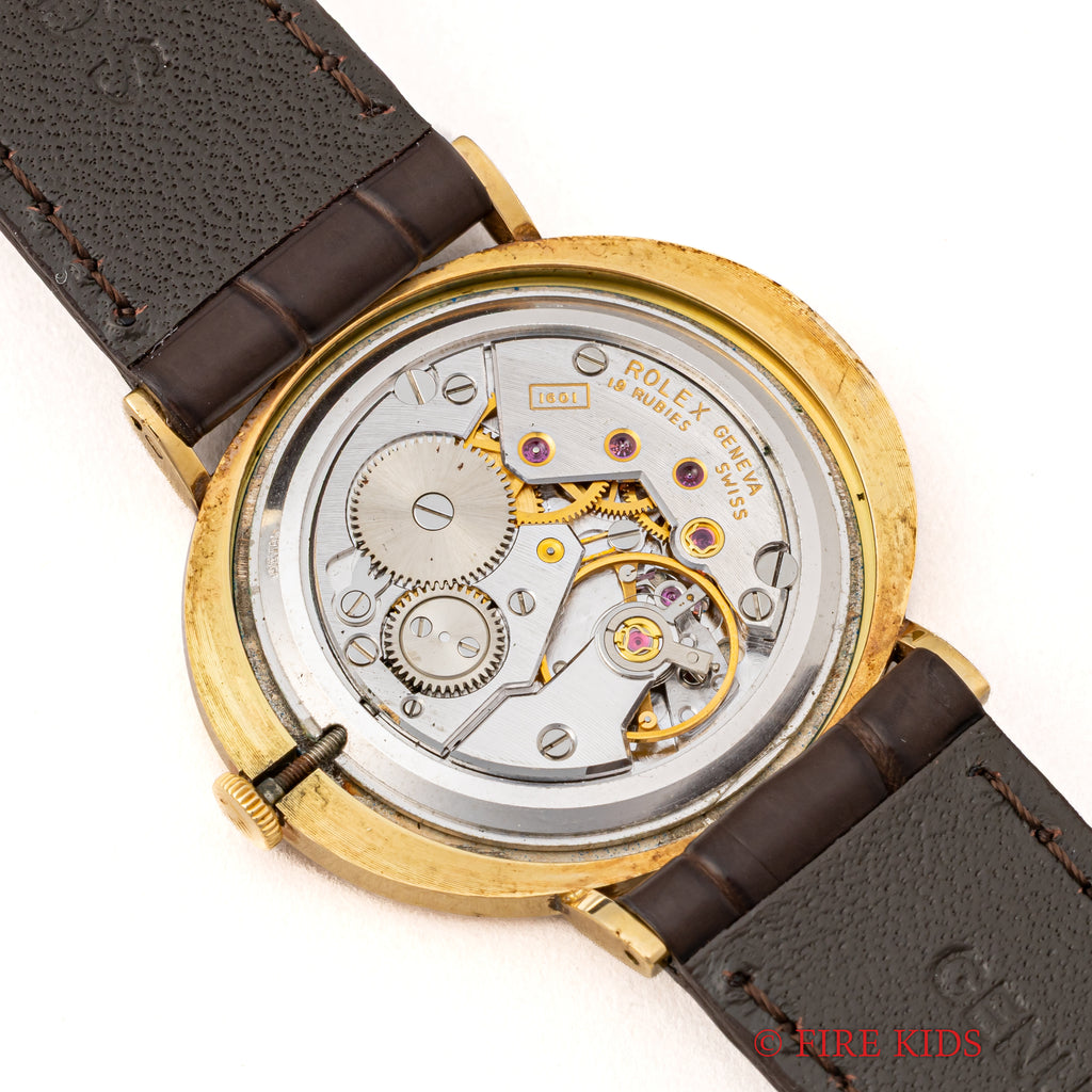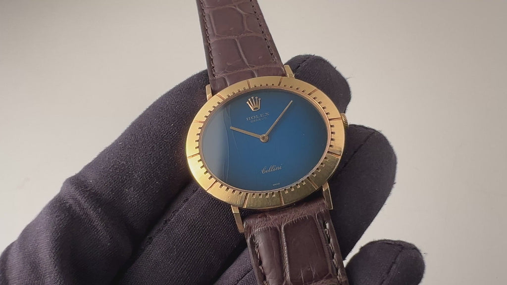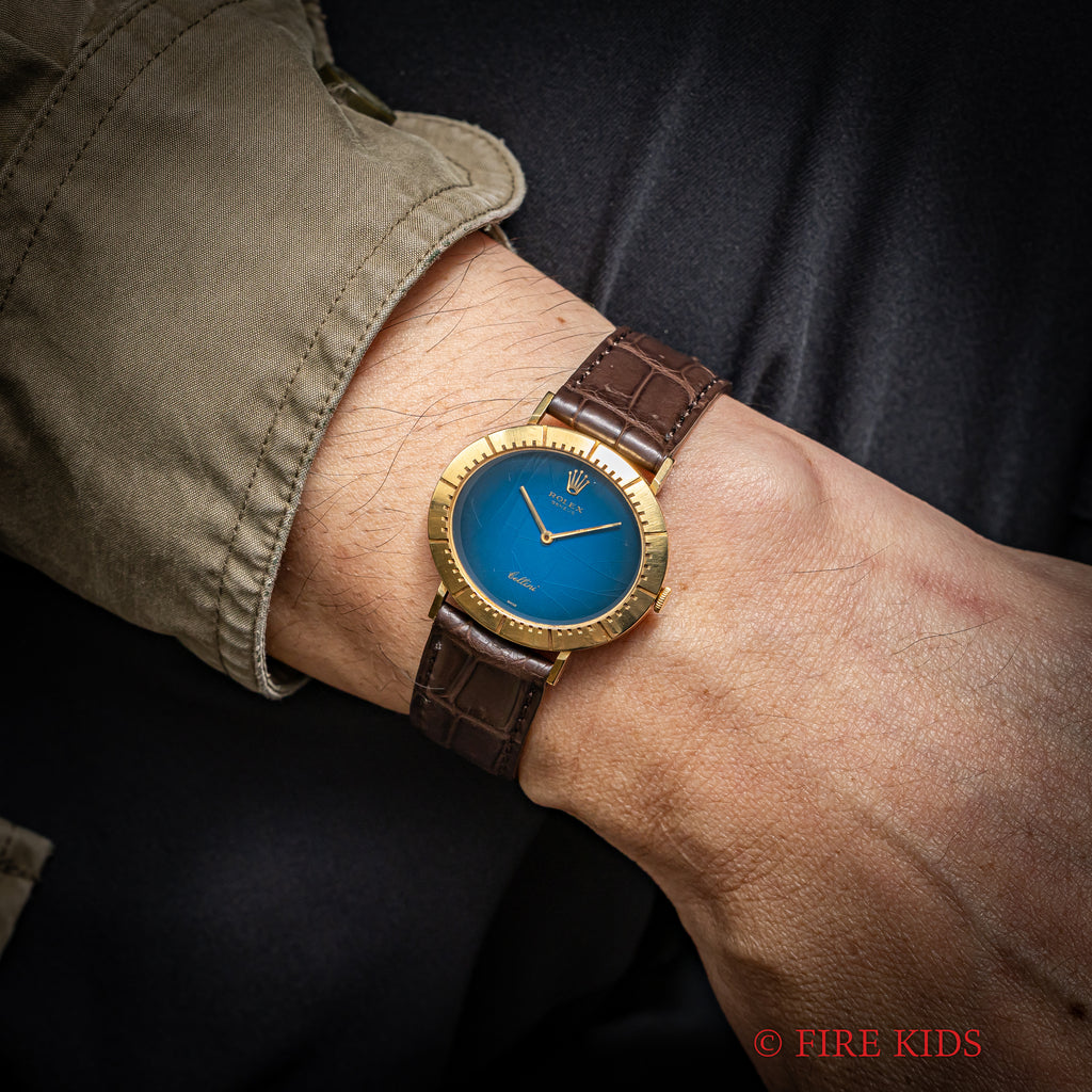 ロレックス チェリーニ 18金無垢イエローゴールド 1973年製 オーバル型 手巻き Ref.4083です。高級感のあるイエローゴールドケースにブルーグラデーションダイヤルの組み合わせです。ケースは小傷はありますが、磨きの少ない良いコンディションで、ベゼル部分にインデックスを表す掘り込みが施されている凝った作りです。ムーブメントは薄型Cal.1601を搭載しており、手巻きと針回しの操作はスムーズです。ベルトはファイアーキッズオリジナルのクロコダイル革ベルトを合わせています。
