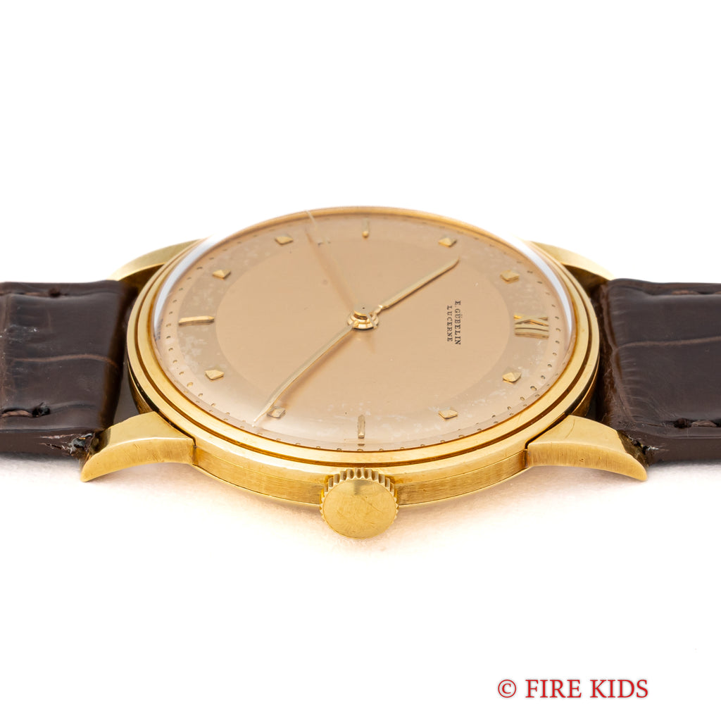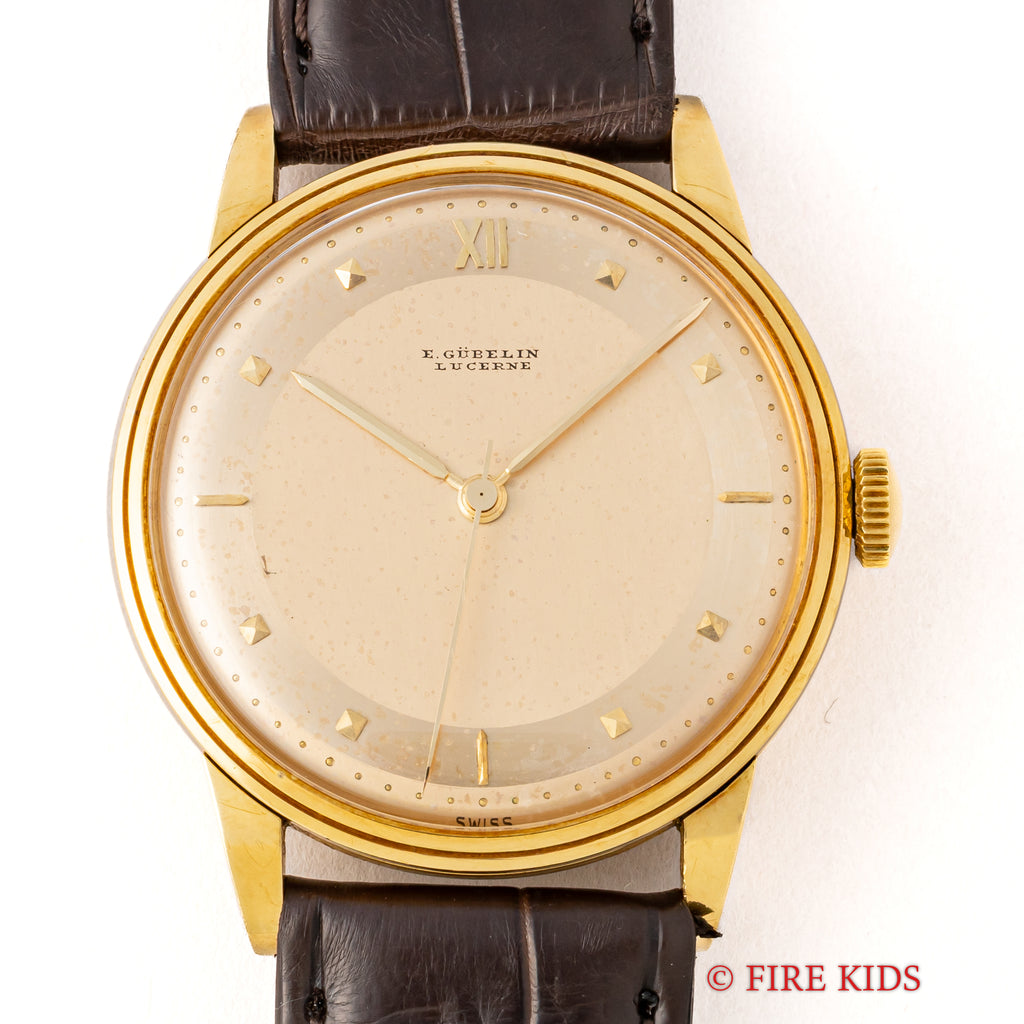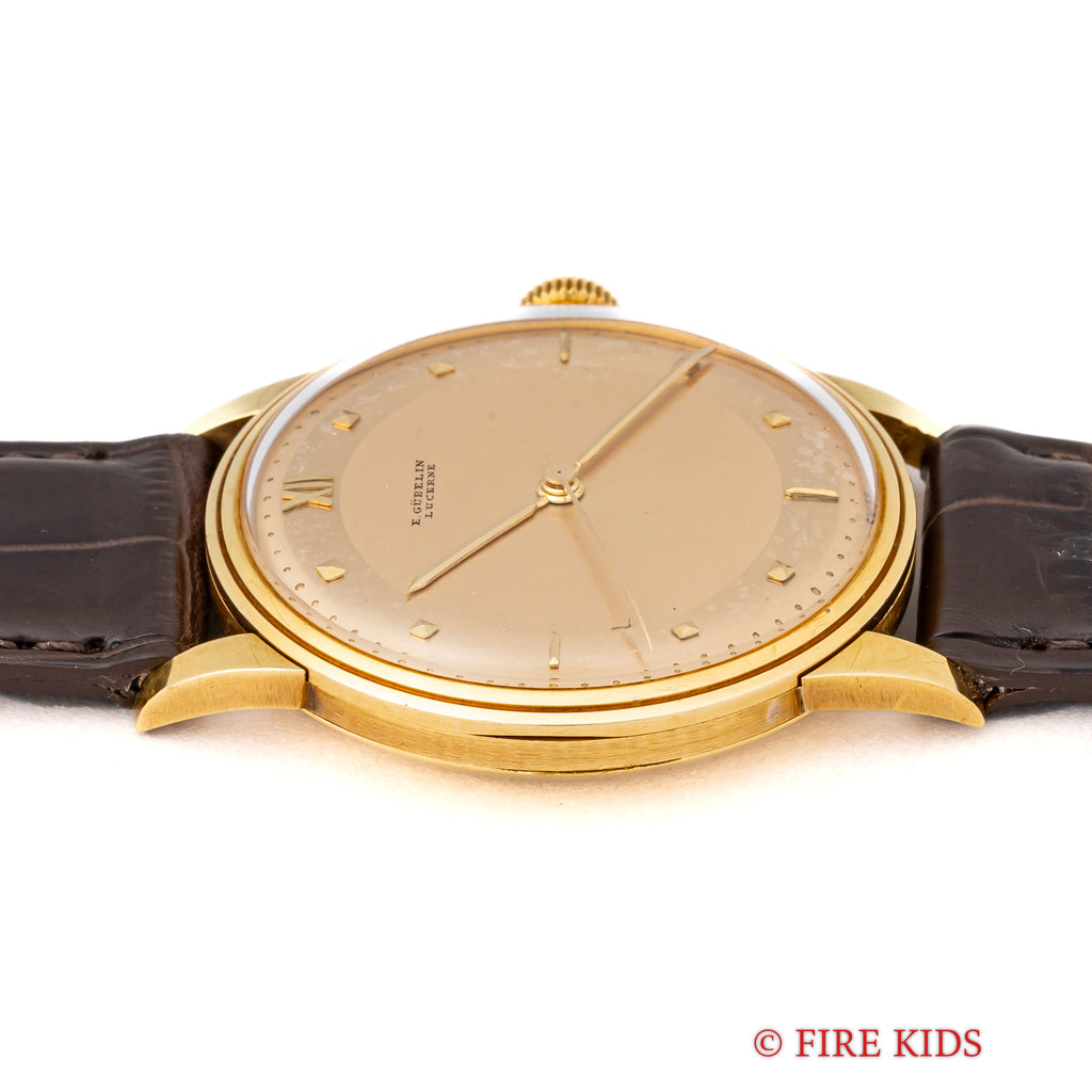 ギュブラン 1950年代製 18金イエローゴールド 手巻き ラウンドケースです。2トーンダイヤルはピラミッド型のインデックスとバー、12時位置のみローマ数字の洒落た良いデザインです。18金イエローゴールドケースは重量感もしっかりあり高級感があります。ベルトはファイアーキッズオリジナルのクロコダイル革ベルトを合わせています。手巻きや針回しはスムーズです。