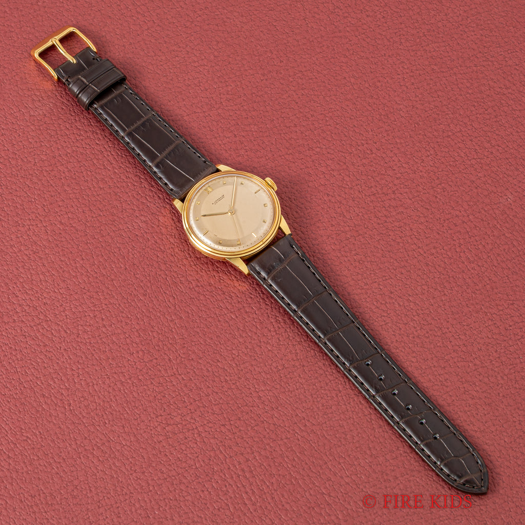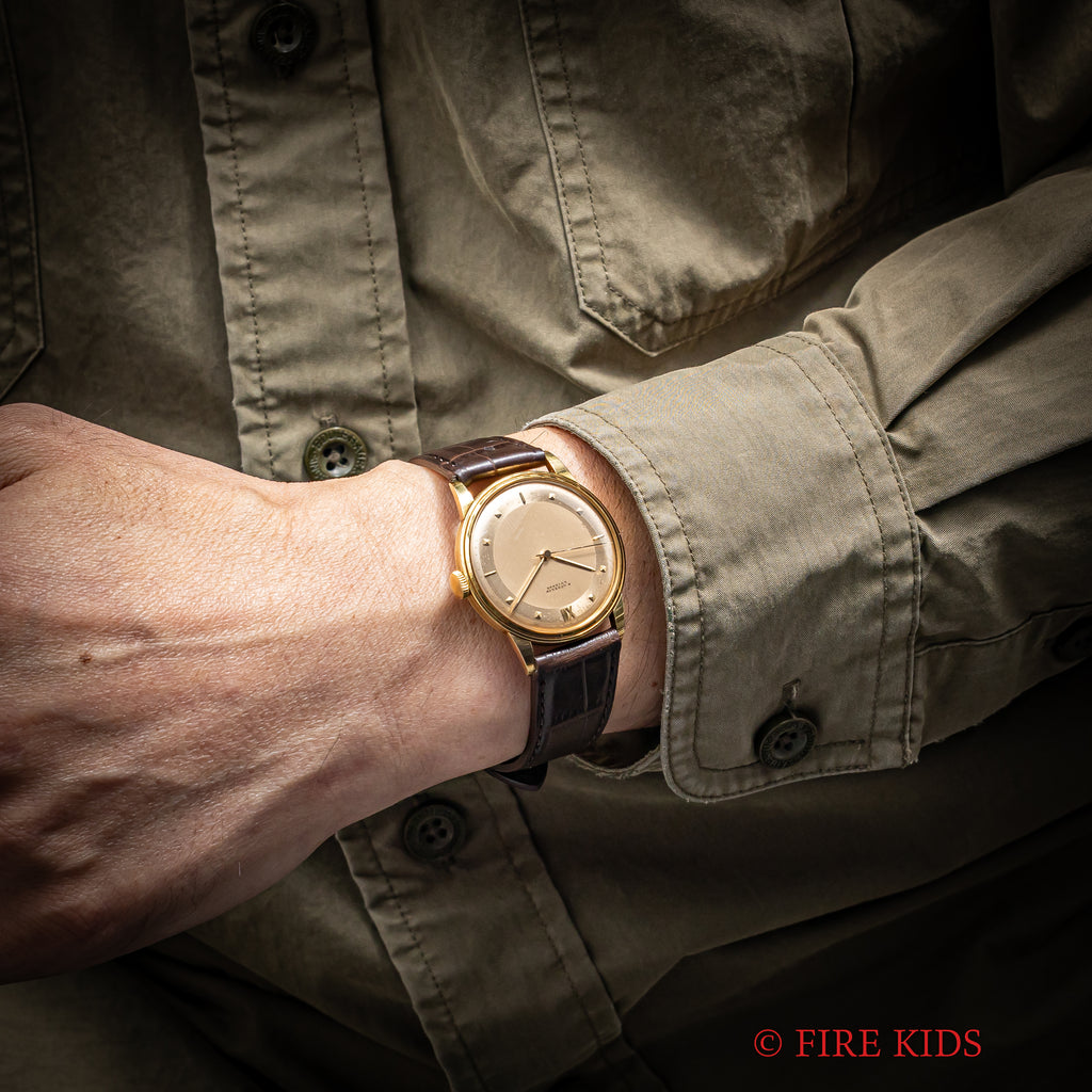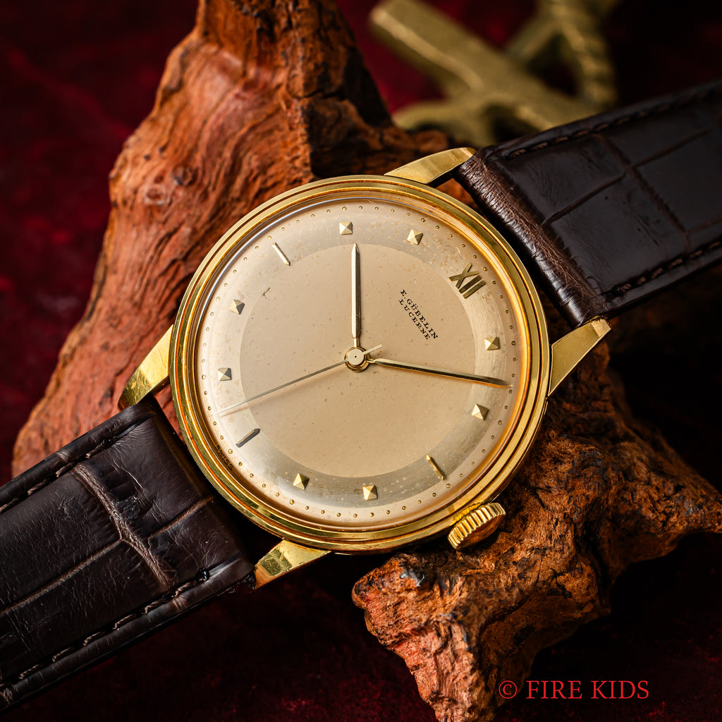 ギュブラン 1950年代製 18金イエローゴールド 手巻き ラウンドケースです。2トーンダイヤルはピラミッド型のインデックスとバー、12時位置のみローマ数字の洒落た良いデザインです。18金イエローゴールドケースは重量感もしっかりあり高級感があります。ベルトはファイアーキッズオリジナルのクロコダイル革ベルトを合わせています。手巻きや針回しはスムーズです。