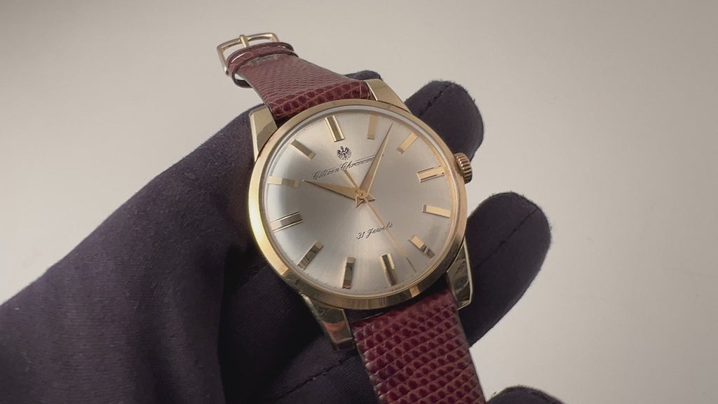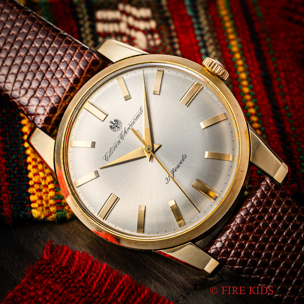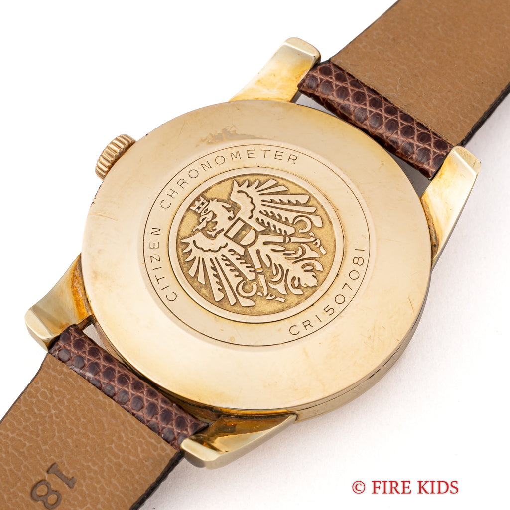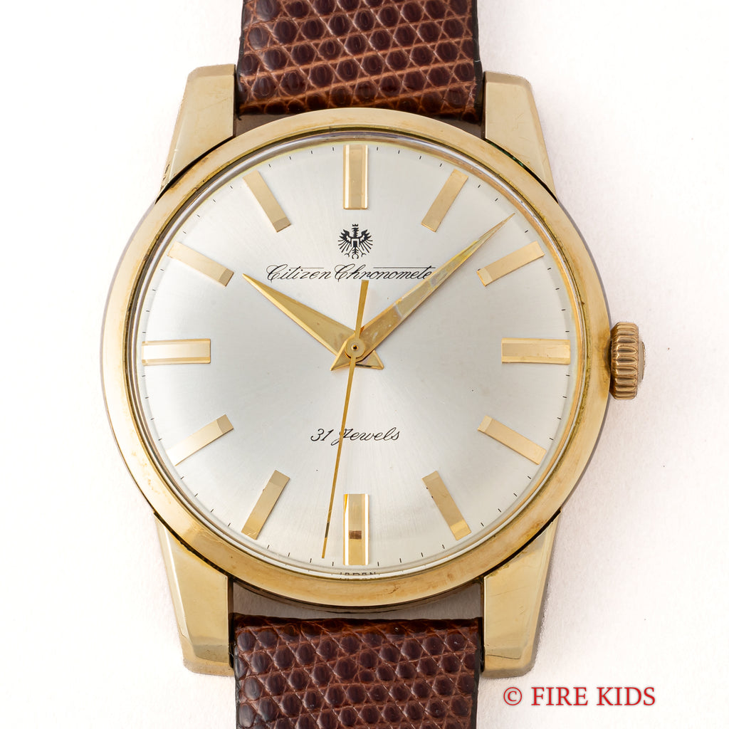 シチズン クロノメーター 1963年製 Ref.CR1507081 14金張り 手巻き 31石の入荷になります。 国産腕時計最高峰の一つと言われているシチズンの名機です。 1962年から1966年までの約4年間のみ製造されたモデルで、採算を度外視して造られた為に短命になったと言われています。珍しい14金張りケースで非常に美しい外観と精度を重視した大型ムーブメントは惚れ惚れとします。ケースは小傷が見られますが大きなダメージや腐食は見られません。メダリオンも綺麗に残っています。ベルトは社外の革ベルトを合わせています。