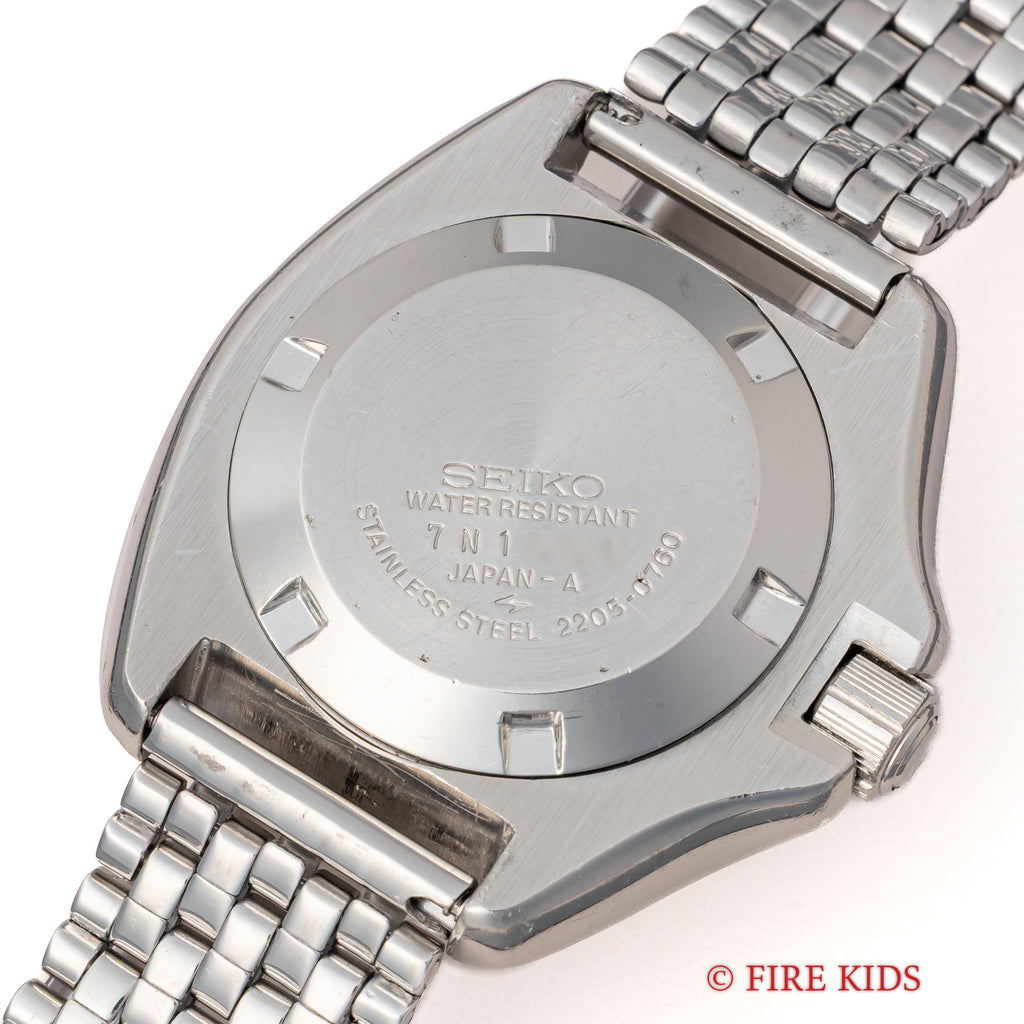 1977年製のセイコーダイバー 150m ボーイズサイズ 自動巻きモデルです。ケース径約33mmの収まりの良いサイズ感で男女ともご使用しただけます。鮮やかなオレンジ色のダイヤルが特徴的な一本です。ムーブメントは自動巻きのCal.2205Aを搭載しています。ベゼルは経年が見られますがケース、ガラスは小傷程度で大きなダメージはありません。リューズのねじ込み、手巻きや針回しの操作はスムースです。ブレスは社外のステンレスブレスが取り付けられています。こちらは分解掃除済みになります。