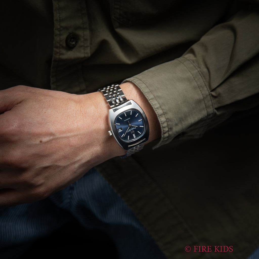 IWC TVスクリーン 1974年製 ブルーダイヤル ペラトン式自動巻Cal.8541B 純正ブレス付きの入荷になります。現存している多くはシルバー系の文字盤で、その理由はカラー文字盤は長く時間が経過したことによる変化、且つ剥がれやダメージが強く目立つためです。今回のように全体的に良好な状態は今後ますます探しにくくなるものと思われます。ブレスも純正のステンレスブレスです。ムーブメントは代表的なペラトン式自動巻Cal.8541Bを搭載しています。