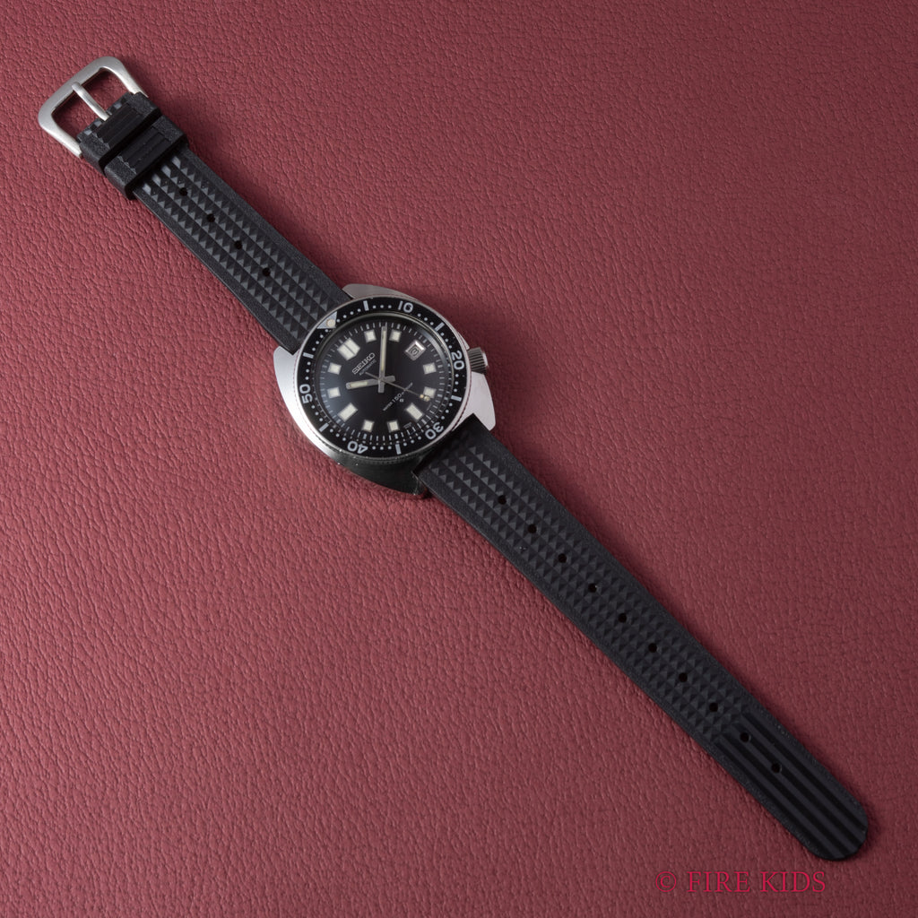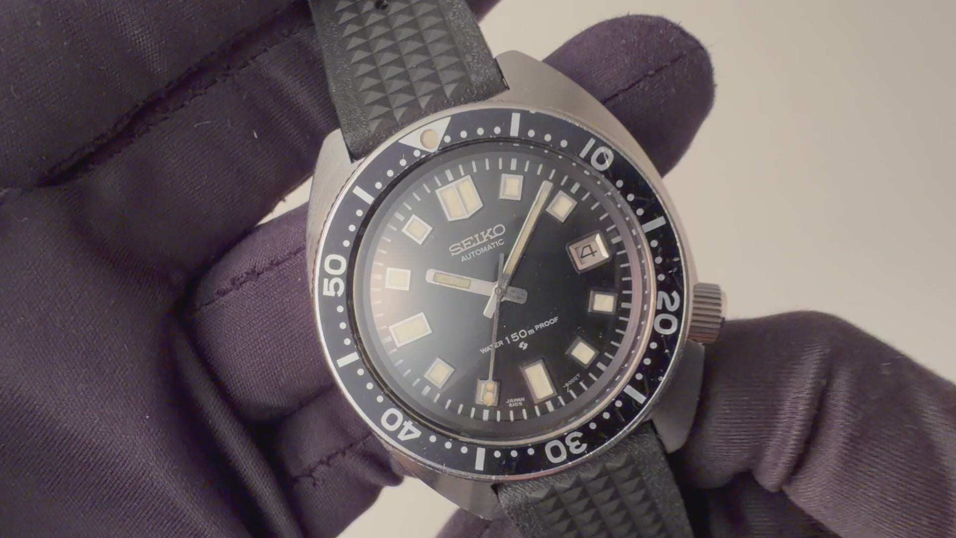 セイコー 150mダイバーセカンドモデル前期型 1969年製 Ref.6105-8000 自動巻の入荷になります。セカンドダイバーは後期型(Ref.6105-8110)のウエムラダイバーが有名ですがこちらは生産数の少ない前期型です。リュウズガードとリュウズロックがついていないのと、ケースのサイズも前期の方が3mmほど小さいのが特徴です。ムーブメントは手巻き無し自動巻きのみのCal.6105Aを搭載。カレンダーの早送り機能付きで巻き上げ効率の良いマジックレバー式自動巻きになります。ケースは多少キズがございますがあまり気にならない程度です。ベルトは社外の雰囲気の合うウレタンベルトが装着されています。こちらは分解掃除済です。