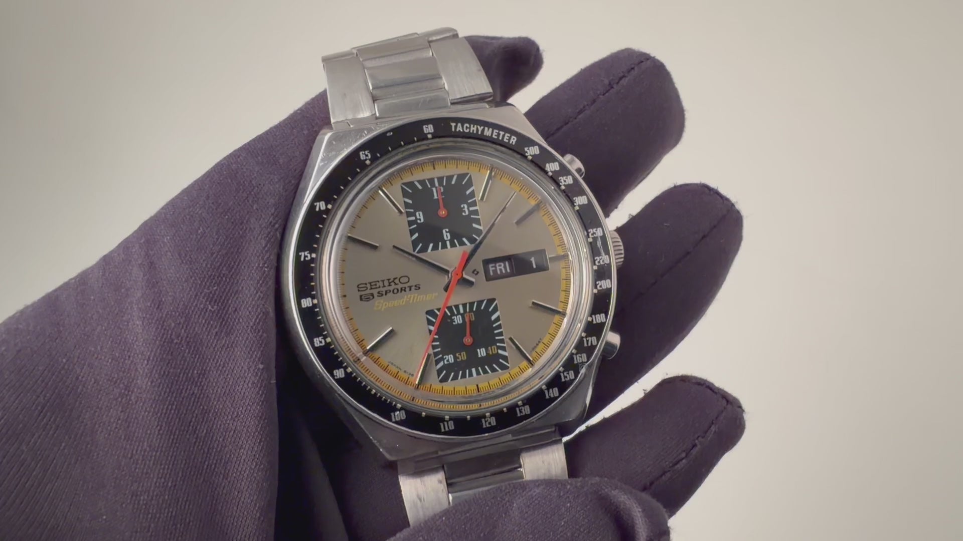 セイコー スピード タイマー 1975年製です。通称「角目」と呼ばれる縦目のインダイヤルが特徴です。インダイヤルがブラックになっており、オレンジの針が良いアクセントになっています。重厚なケースは小傷が見られますが大きなダメージはありません。ムーブメントはCal.6138Bを搭載、手巻き、巻き上げやクロノファンクションは良好です。ベルトはオリジナルステンレスブレスが付いています。こちらは分解掃除済です。