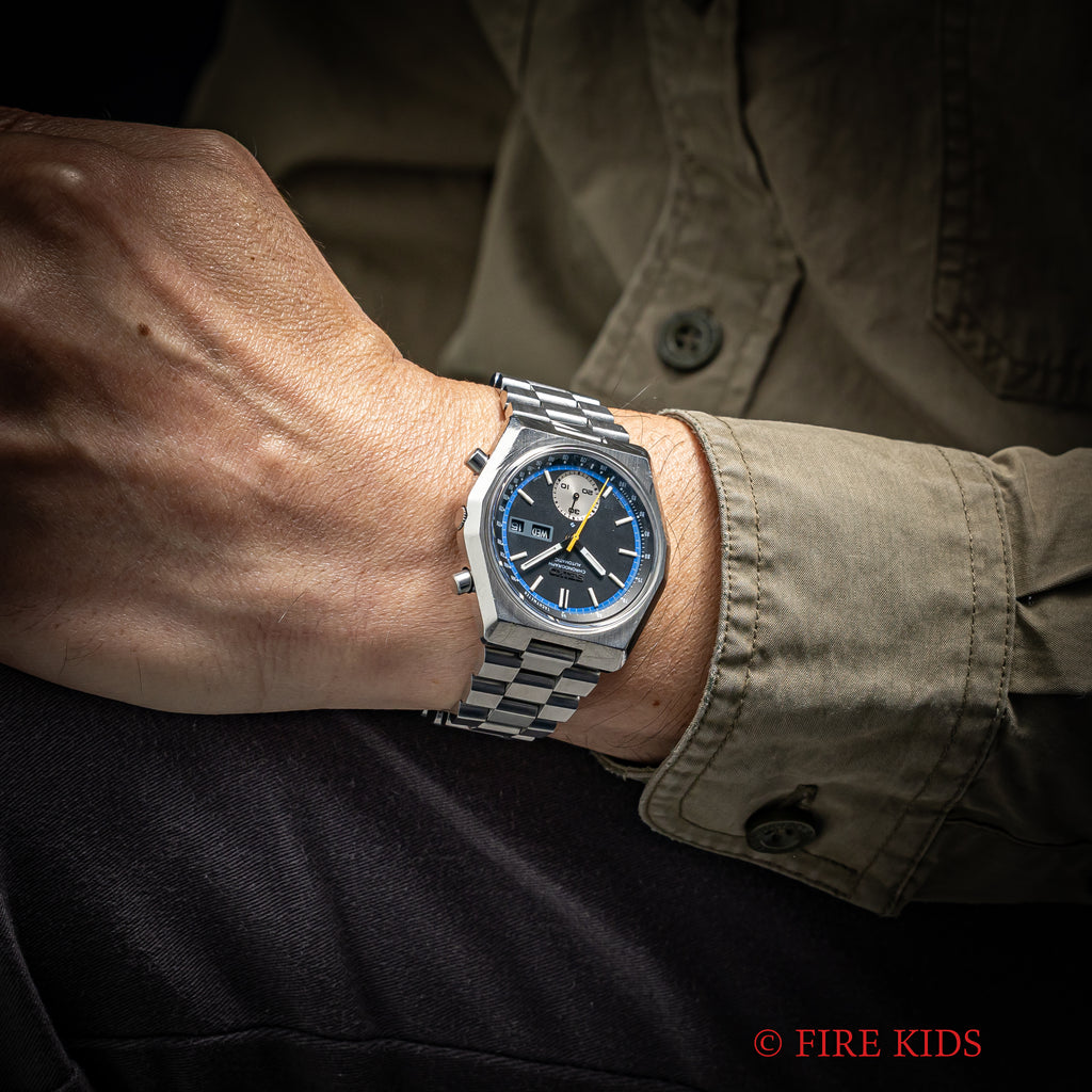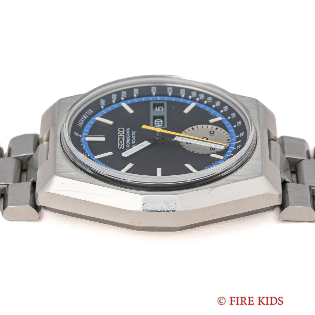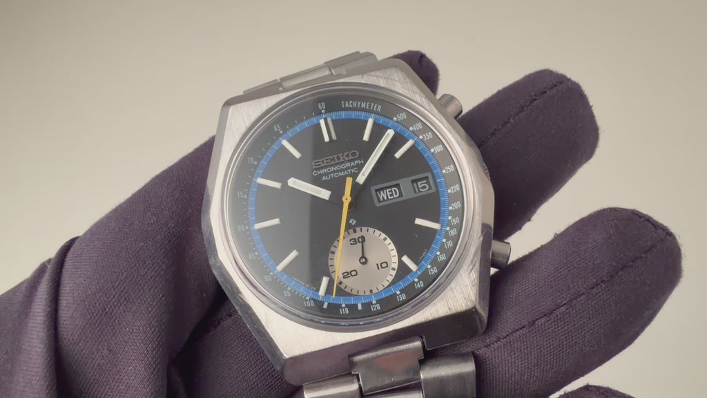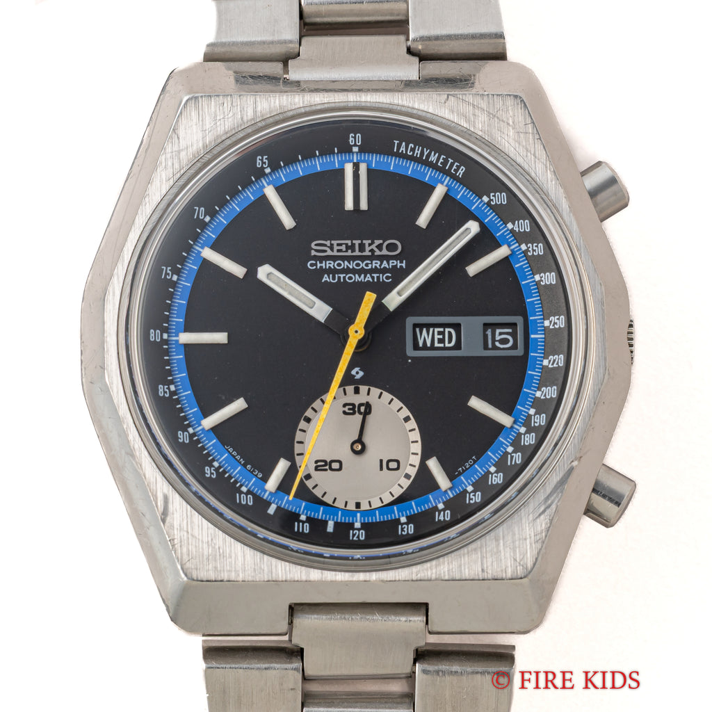セイコー 自動巻きクロノグラフ Cal.6139B ヘキサゴンケース 1974年製 純正ブレスです。一つ目のクロノグラフで、マットブラックダイヤルとブルーのミニッツの組み合わせです。八角形にも見えますが海外輸出モデルでヘキサゴンケースと呼ばれていて国内ではあまり見かけないモデルです。曜日は英語とフランス語の二か国表示の輸出用モデルです。ベルトは純正ブレスが付いています。カレンダー早送りや針回し、クロノグラフ操作はスムーズです。こちらは分解掃除済みです。