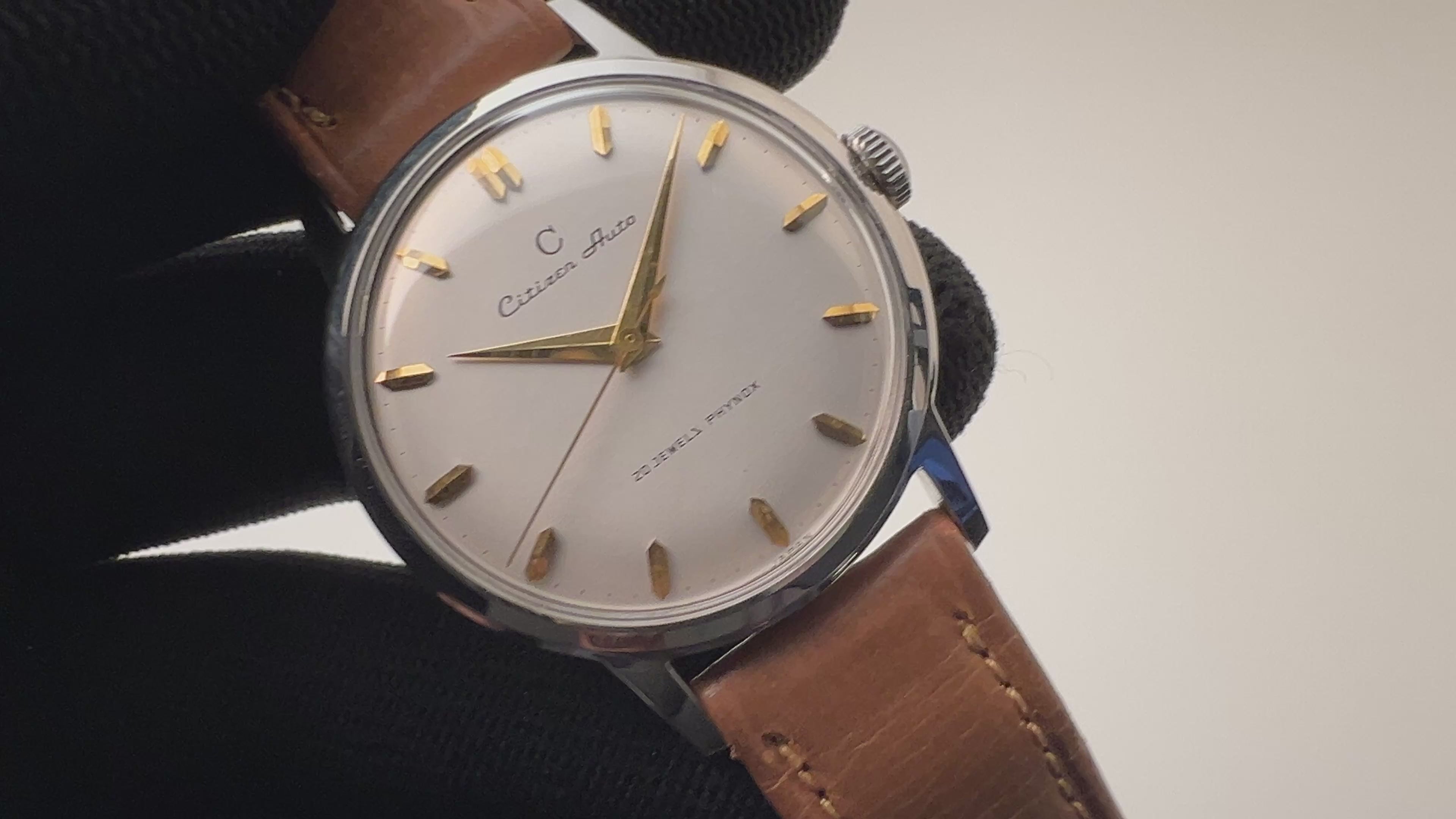 シチズン オート 1958年製 未使用品 箱、タグ付き 純正革ベルト、尾錠付きです。1958年発売でシチズン初の自動巻モデルで先進的な両方向巻上げになります。未使用品の素晴らしいコンディションです。多角形インデックスに尖った針でヴィンテージ感がありカッコいい時計です。手巻きや針回しはスムーズです。オリジナル革ベルトに尾錠も付いています。こちらは箱、タグが付属します。