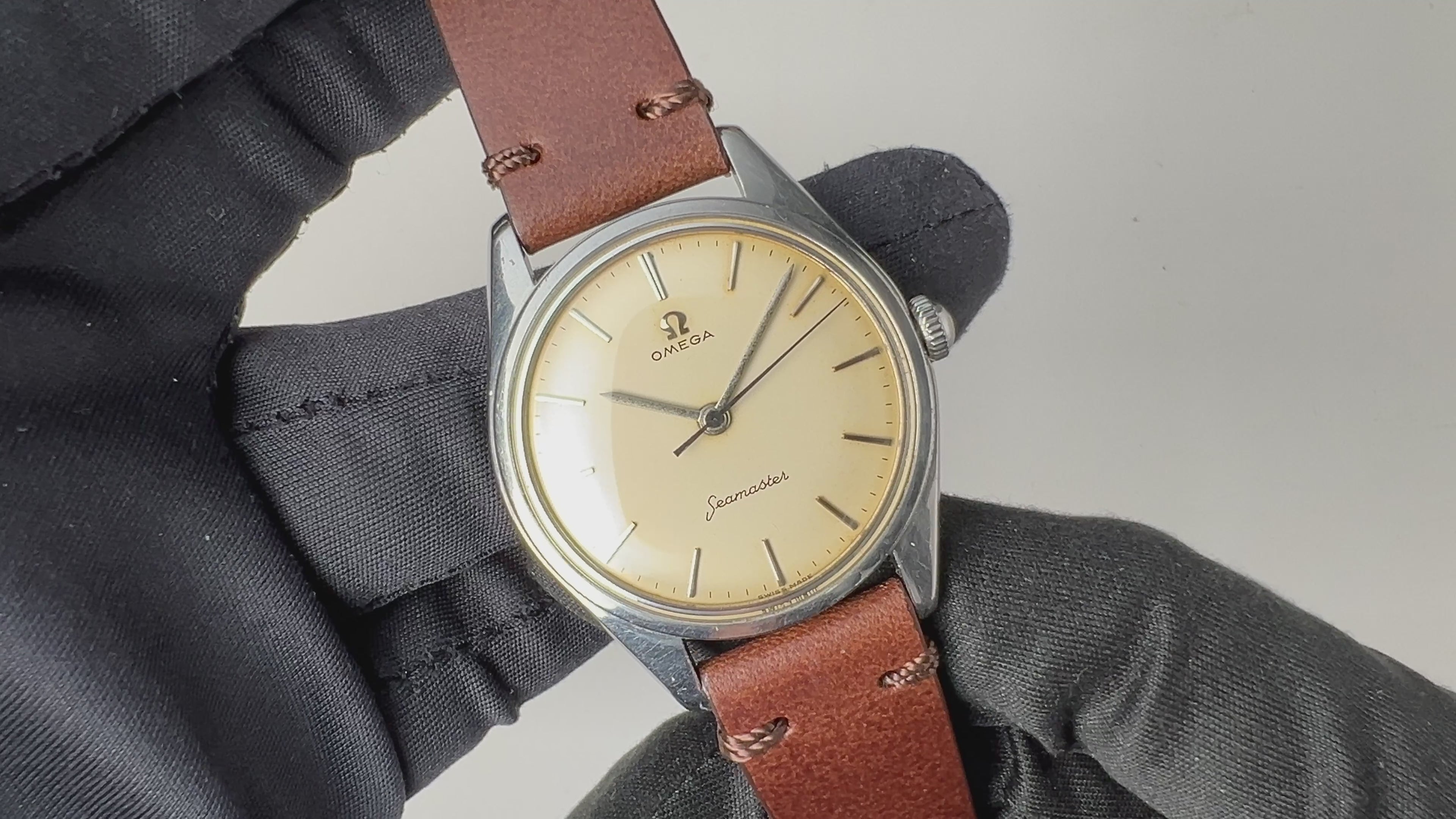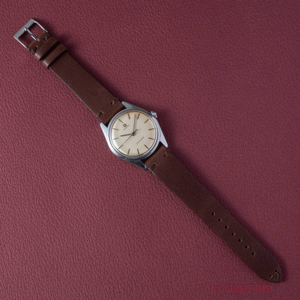 オメガの30㎜キャリバー搭載シーマスター1960年製です。あまり見る機会がないランチェロと同一の型番で同じケース、ムーブメントを搭載したシーマスターです。シンプルなバーインデックスですが長さがあり良い感じです。ケースは小傷がありますが大きなダメージはありません。文字盤は全体的に変色して良い雰囲気になっています。手巻きや針回しの操作はスムースです。ベルトは社外の革ベルトを合わせています。