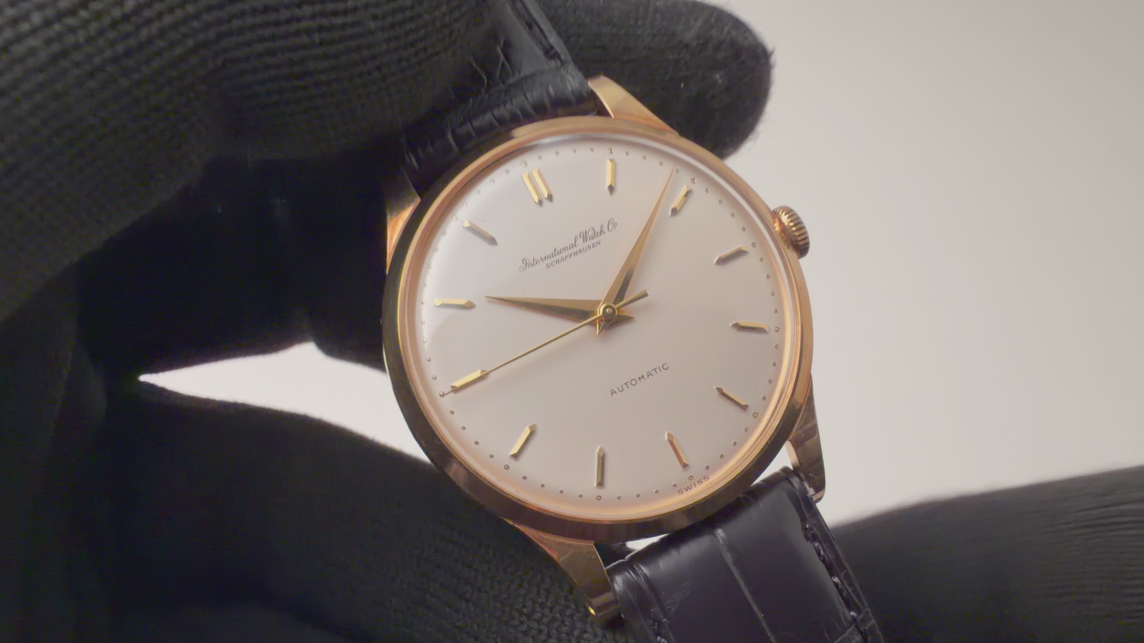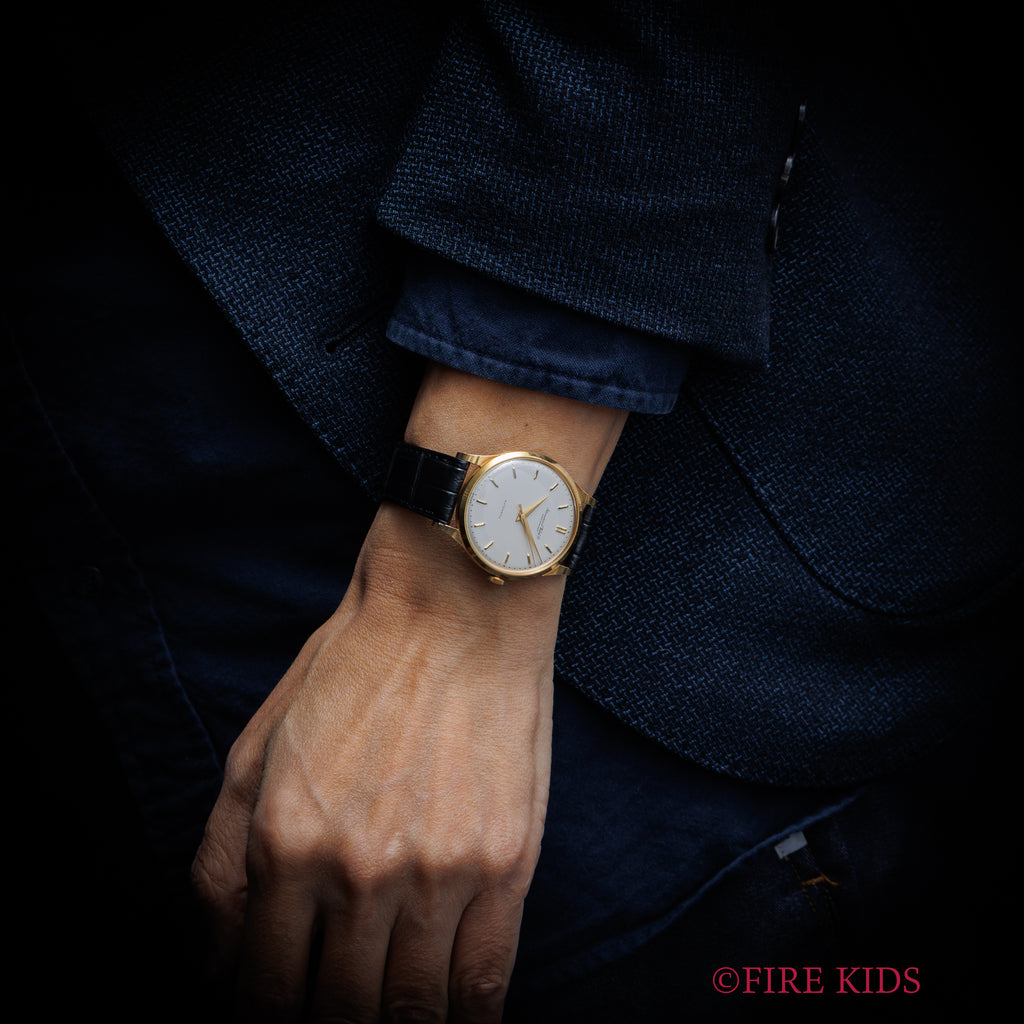 IWC ラウンドケース 1961年製 18金無垢イエローゴールド Cal.853 ノンデイト自動巻きです。クリアコーティングが施されたホワイトダイヤルは大きなダメージ無く良好なコンディションです。ケースも金無垢ケースとしては小傷程度で裏蓋にスポットでへこみがありますがそこまで目立ちません。エッジはあります。ベルトはファイアーキッズオリジナルクロコダイル革ベルトを合わせています。こちらは分解掃除済みです。