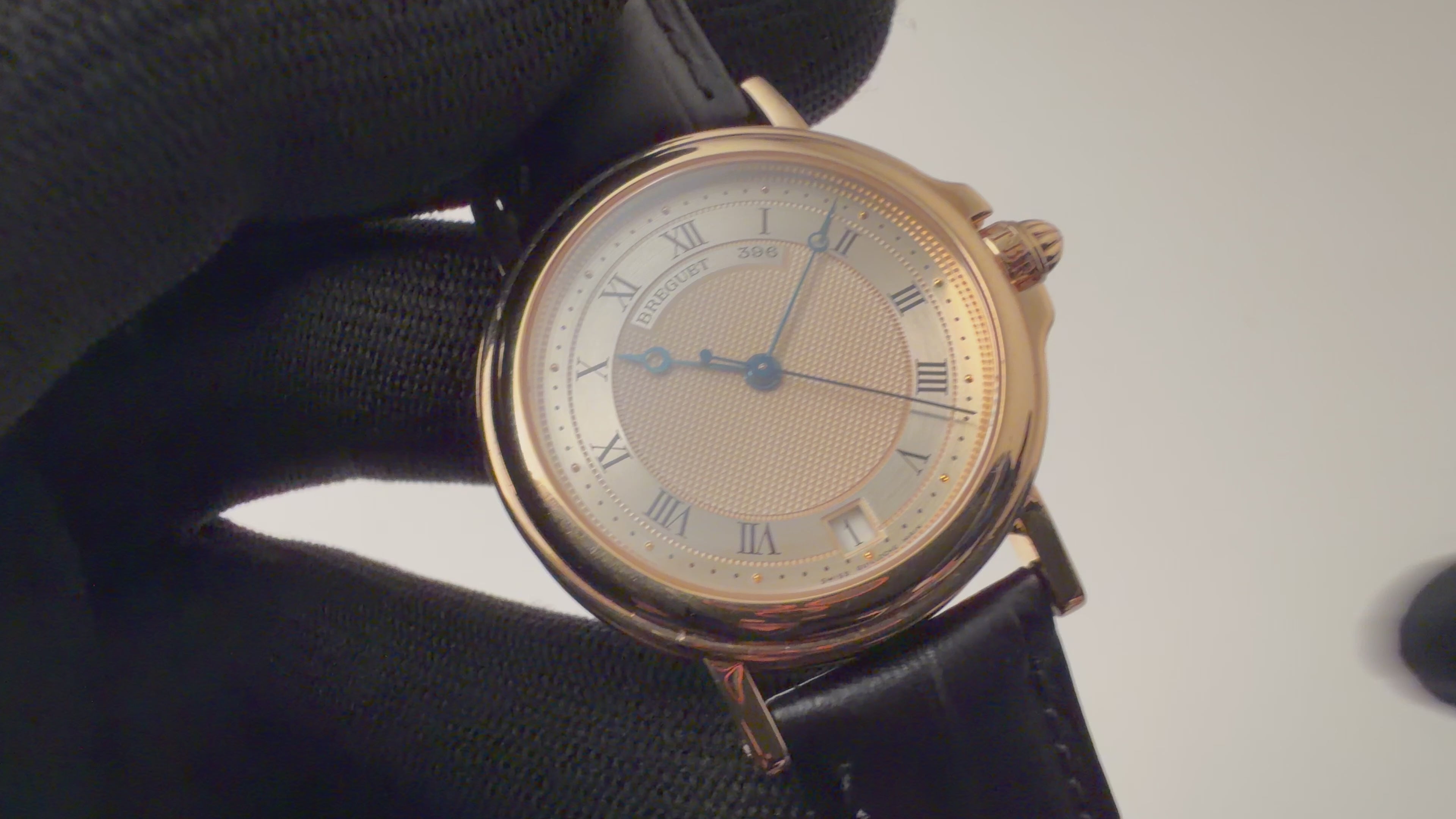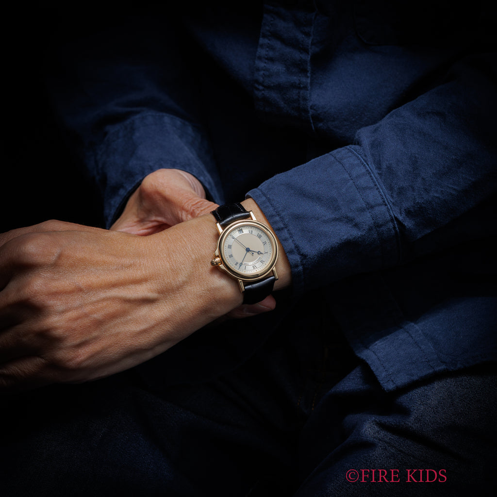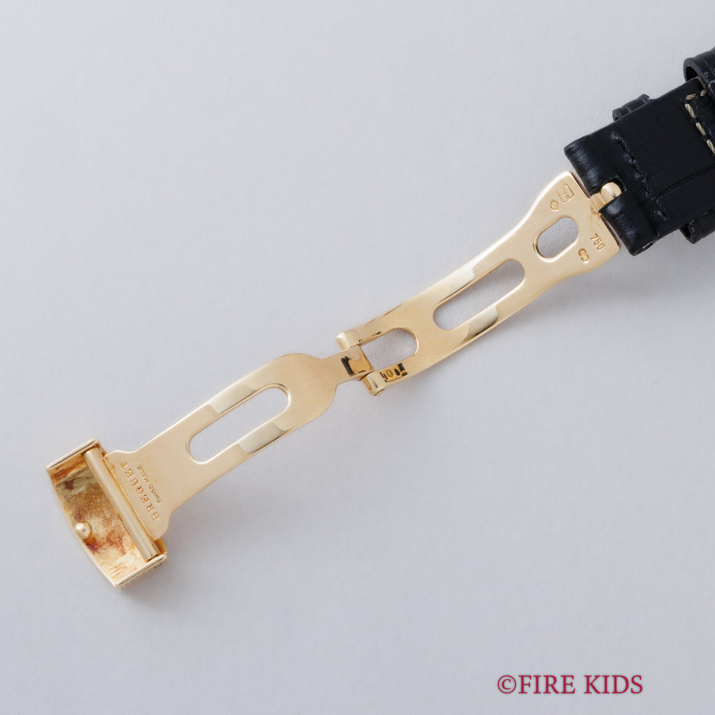 ブレゲ 18金無垢マリーン 1990年代製 Ref.3400BA/12/996 自動巻 純正金無垢Dバックルの入荷になります。ヴァシュロンコンスタンタンの222のデザインで有名なヨルグ・イゼック氏のデザインで1990年代に登場したマリーンです。ブレゲらしい彫が施されたローマンダイヤルにブレゲ針の組合せと上品な32㎜(リューズ別)サイズのコインエッジが施されたケースで防水仕様になっています。文字盤はシミ等無く綺麗です。ケースは小傷が見られますが大きなダメージはありません。ムーブメントはフレデリックピゲベースの自動巻cal.517を搭載しています。ベルトは社外の革ベルトに純正18金無垢Dバックルが取り付けられています。こちらの時計は分解掃除済みです。