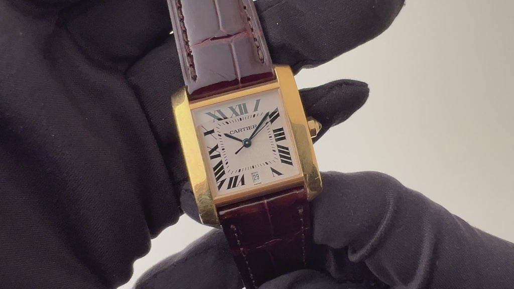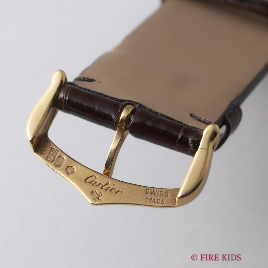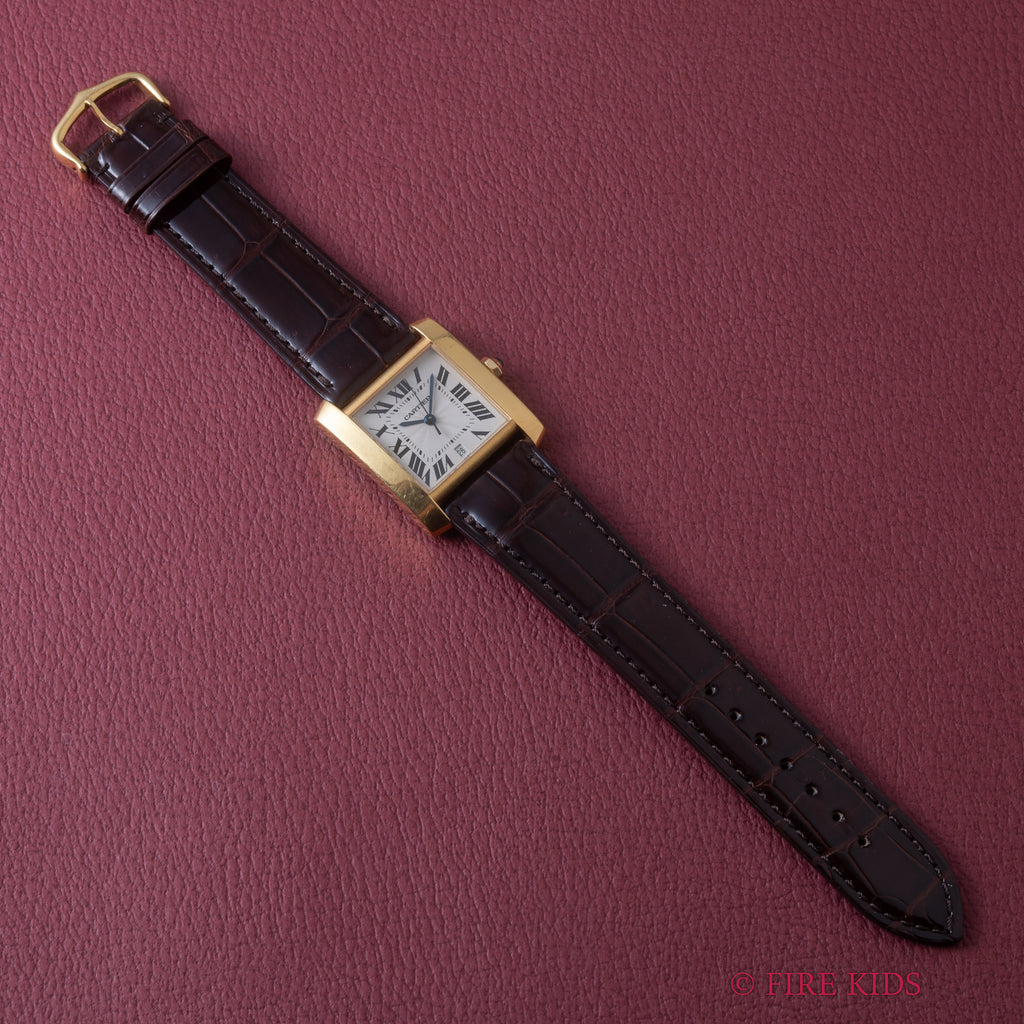 カルティエ 18金無垢イエローゴールド タンクフランセーズ LMサイズ 1990年代製 ギョーシェダイヤル 純正金無垢尾錠付きです。長い歴史のあるタンクシリーズの中でも比較的新しい1997年に発表されたモデルです。ギョウシェダイヤルは高級感があり、腕にのせた時に大き過ぎず小さ過ぎず上品なサイズで、重量感もあり気品があります。18KYGケースには若干の小傷がありますが、大きなダメージはありません。手巻きや針回しの操作はスムースです。ベルトは社外の艶有クロコダイル革ベルトに18KYGの純正尾錠が取り付けられています。箱、冊子が付属します。