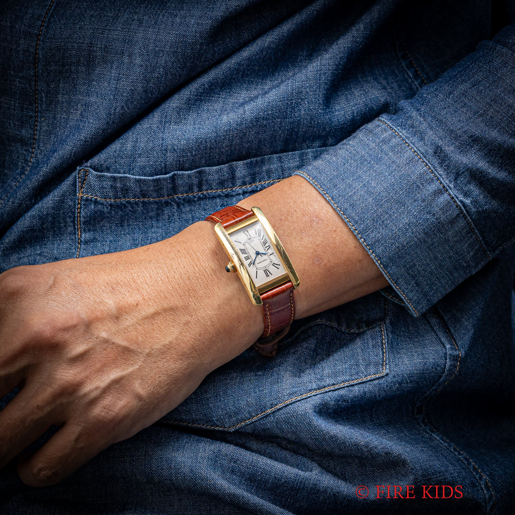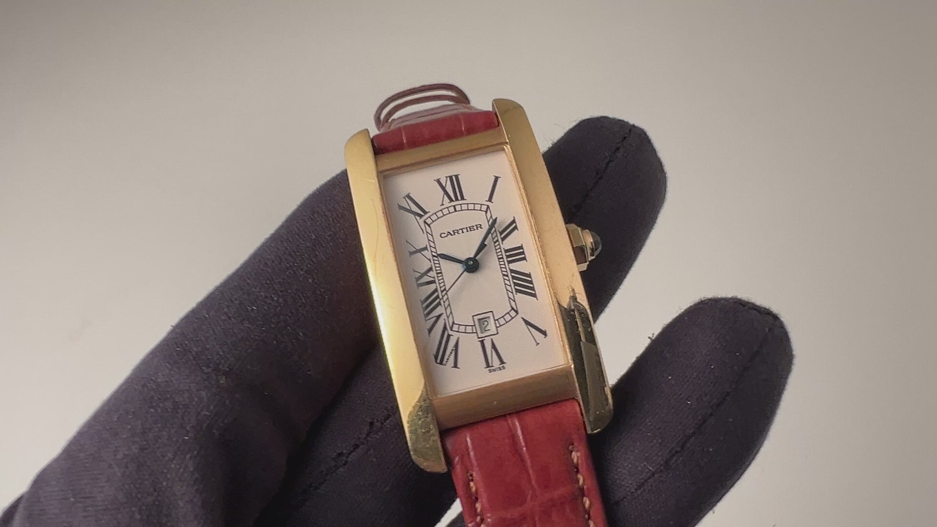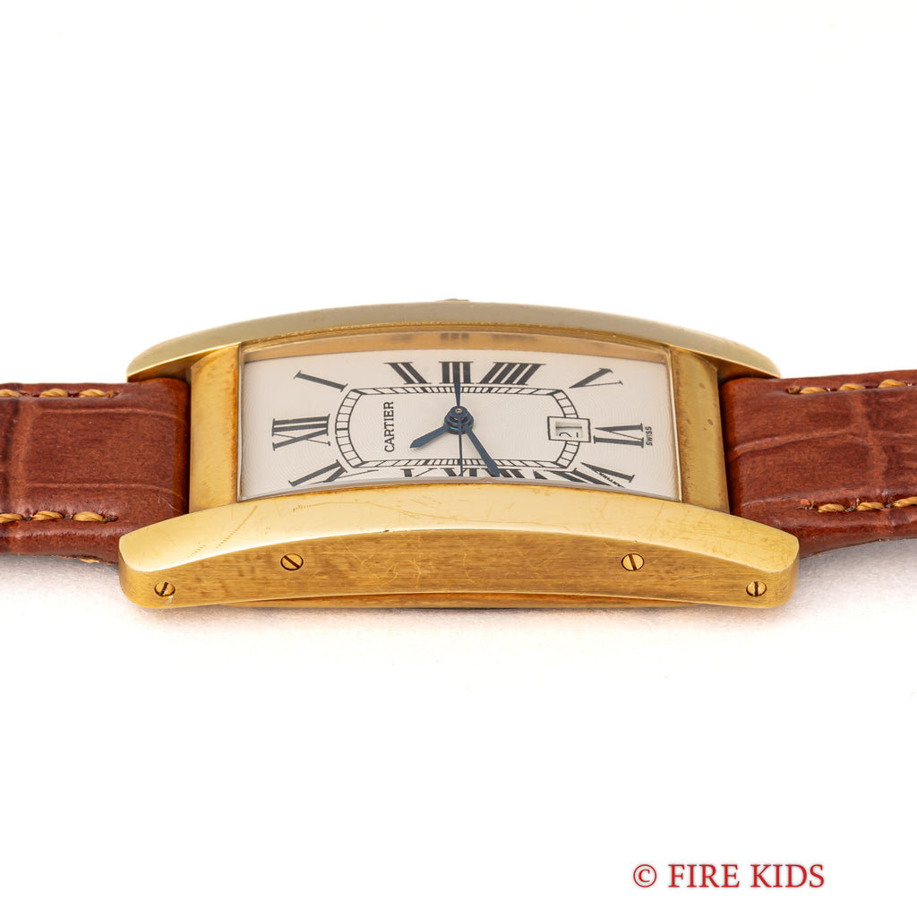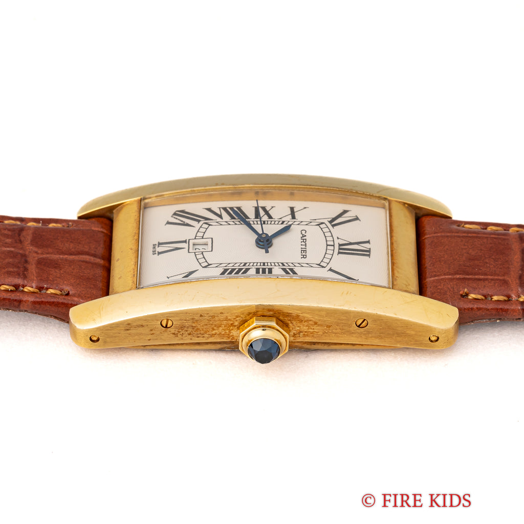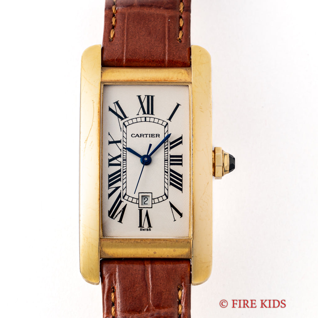 カルティエ 18金無垢タンク アメリカン MMサイズ 2002年発行ギャラ ギョーシェダイヤル 純正金無垢尾錠付 箱付きの入荷になります。幅約22.5㎜(リューズ別)サイズのユニセックスモデルです。美しいカーブを描く縦長のケースが特徴のタンクアメリカンは販売数が少なく特に自動巻は希少です。文字盤はギョウシェ彫は施されたダイヤルでシミ等無く綺麗です。ケースは小傷が見られますが大きなダメージはありません。ベルトは社外の革ベルトに純正の金無垢尾錠が取り付けられています。2002年販売のギャランティー、箱が付属します。