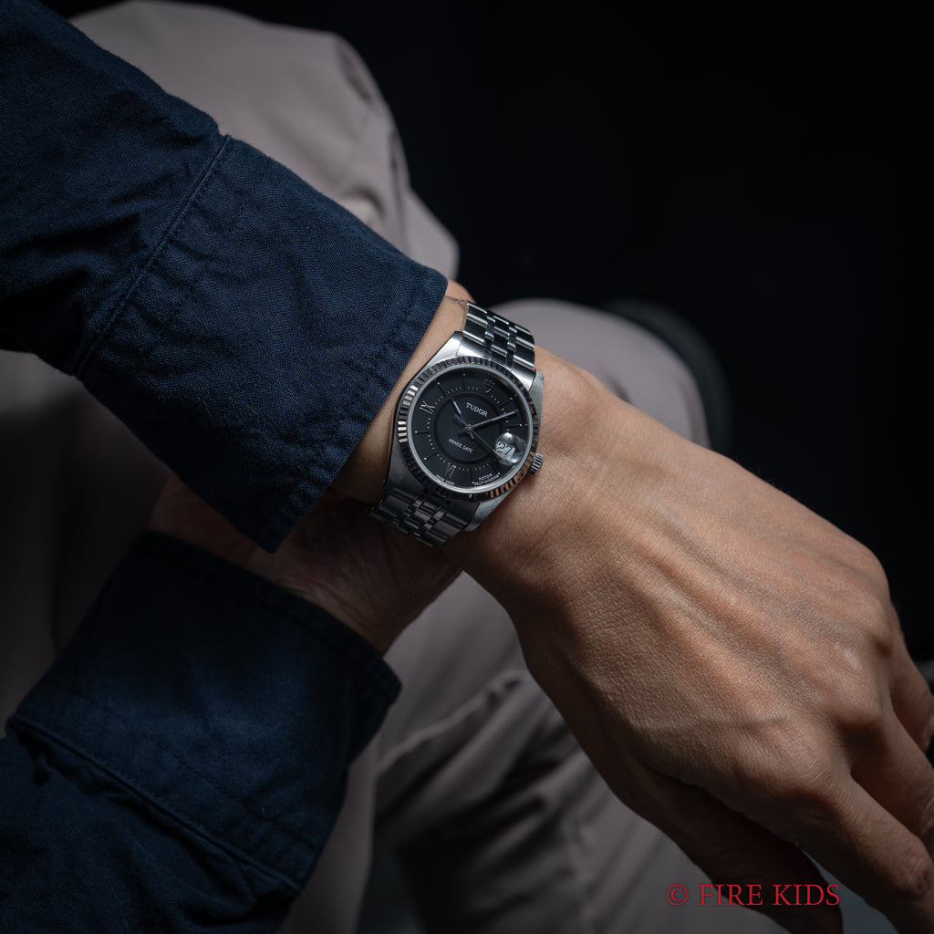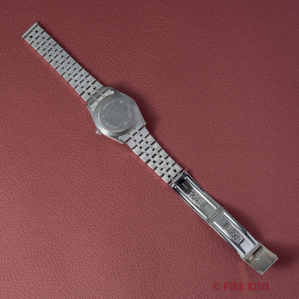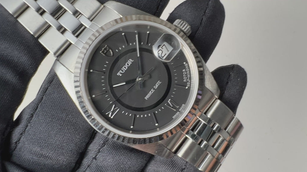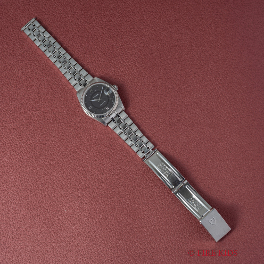 チューダー プリンスデイト 2002年製 Ref.74034 ブラックローマンダイヤル 自動巻 WGベゼル 純正ブレスの入荷になります。ロレックスのデイトジャストを思わせるチューラーのプリンスデイトです。ブラックダイヤルに飛びのローマンダイヤルツートンの仕上げ等ロレックスに無いデザインが魅力になっています。文字盤はシミ等無く綺麗です。ケースは小傷が見られますが大きなダメージはありません。手巻きや針回しの操作はスムースです。ベルトは純正の5連ブレスが取り付けられています。