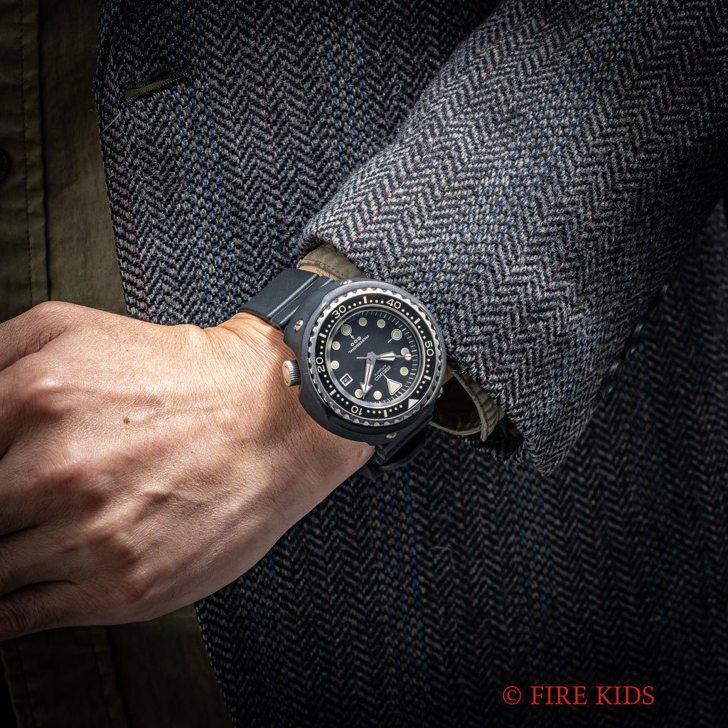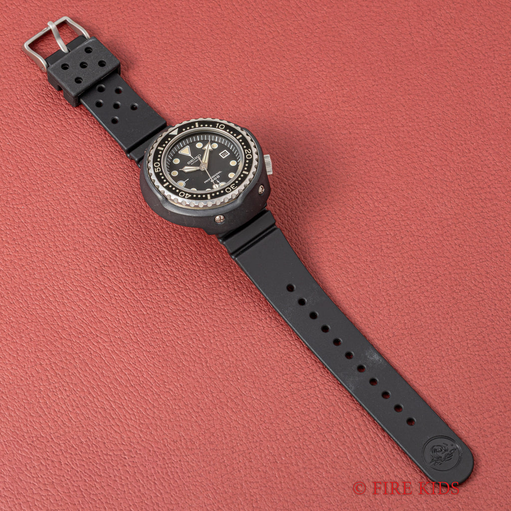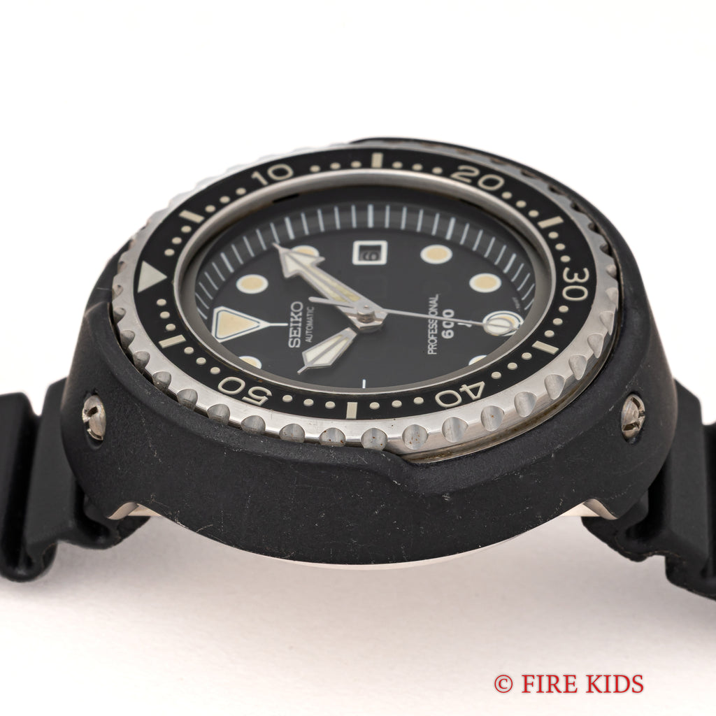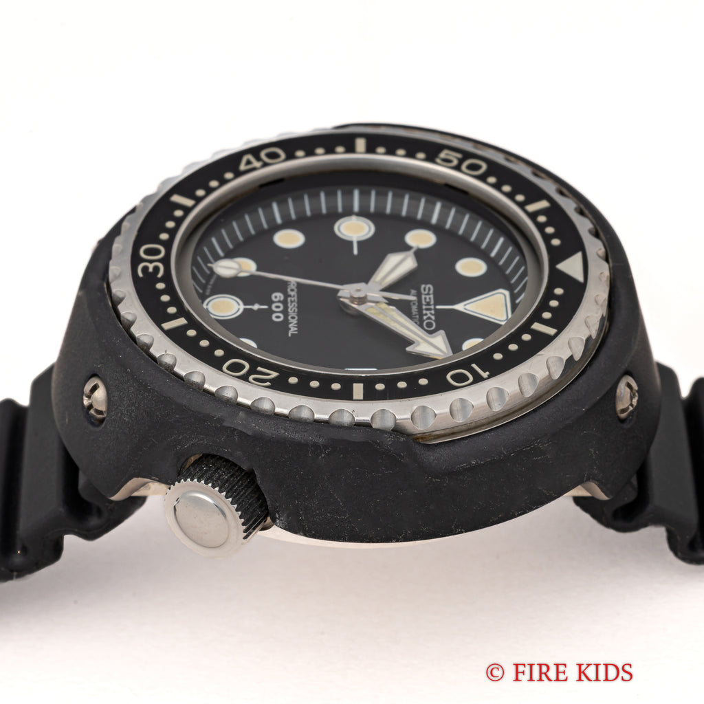 セイコー 600mプロフェショナルダイバー初期型 1975年製 Ref.6159-7010 元祖 ツナ缶 10振動自動巻の入荷になります。世界初のチタンケースを採用した本格ダイバーズRef.6159-7010でm表記が入っていない初期型です。50㎜の大型ケースは存在感がございます。ラグ足が無くケースにバンドが直接付いている為大型ケースではございますが、腕のおさまりの良い時計です。文字盤、針は夜光の変色が見られますが良い雰囲気になっています。針回し、ベゼル、リューズのねじ込みの操作はスムーズです。ケース、ベゼルは小傷が見られますが大きなダメージはありません。ベルトは純正のラバーベルトに純正尾錠が取り付けられています。こちらの時計は分解掃除済みです。