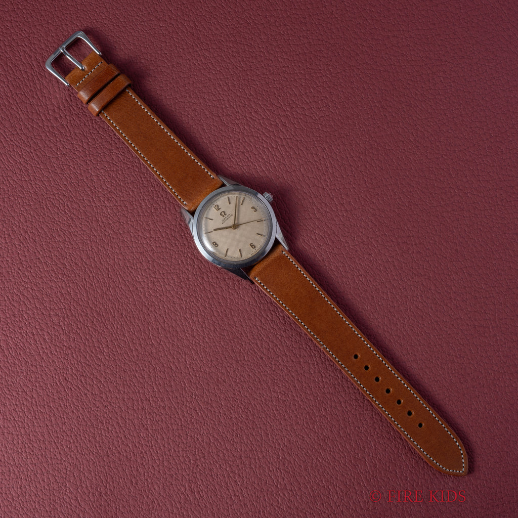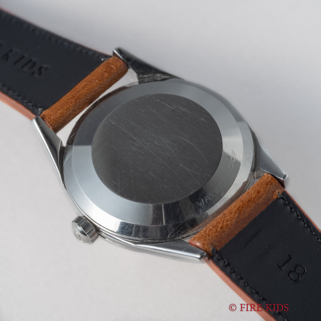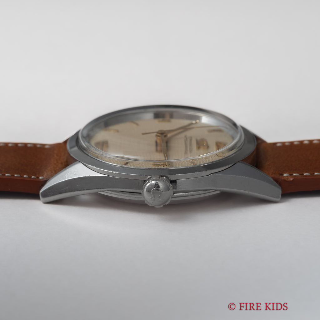 オメガ シーマスター ギョーシェダイヤル 1954年製 全回転自動巻 Cal.471の入荷になります。ギョーシェダイヤルに金色の針、飛びアラビアインデックスの組み合わせは魅力的です。オリジナルの文字盤は多少荒れが確認できますが年代を考慮するとキレイで艶感がしっかりと残り良好な状態です。ムーブメントは全回転自動巻きのCal.471を搭載、状態も綺麗です。ケースは小傷程度で大きなダメージはございません。ベルトはファイアーキッズオリジナルのブッテーロレザーが取り付けられています。