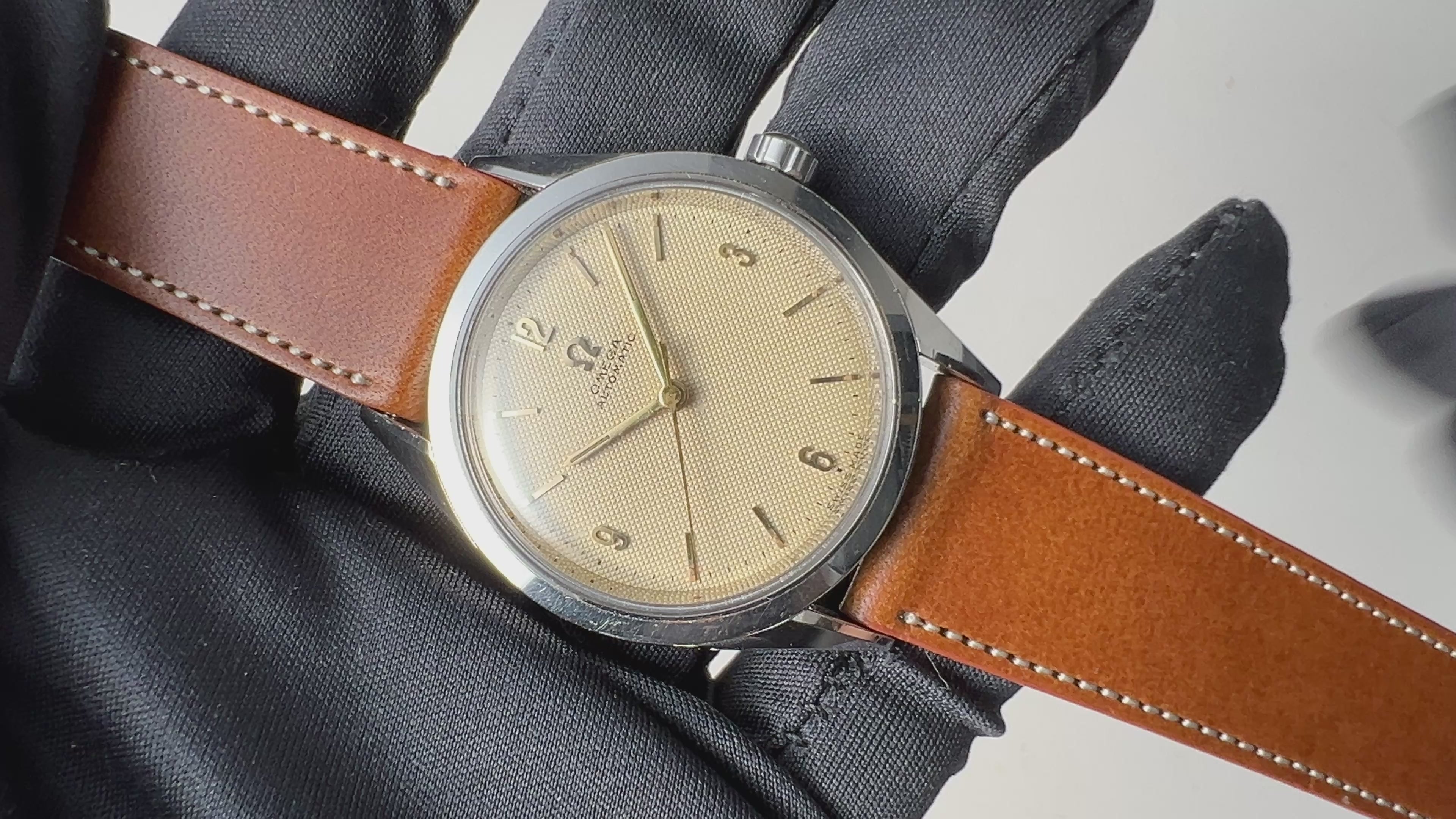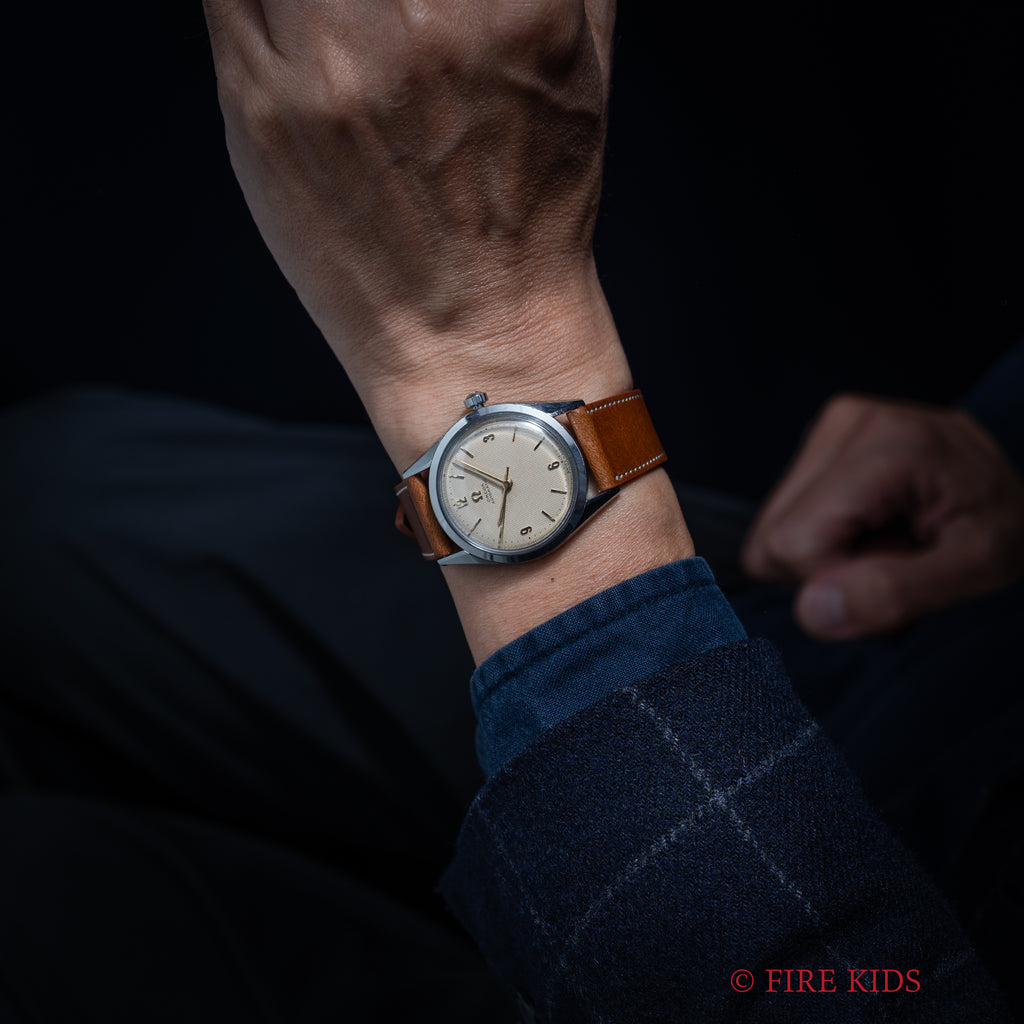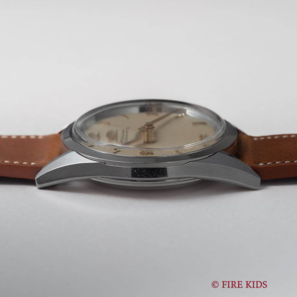 オメガ シーマスター ギョーシェダイヤル 1954年製 全回転自動巻 Cal.471の入荷になります。ギョーシェダイヤルに金色の針、飛びアラビアインデックスの組み合わせは魅力的です。オリジナルの文字盤は多少荒れが確認できますが年代を考慮するとキレイで艶感がしっかりと残り良好な状態です。ムーブメントは全回転自動巻きのCal.471を搭載、状態も綺麗です。ケースは小傷程度で大きなダメージはございません。ベルトはファイアーキッズオリジナルのブッテーロレザーが取り付けられています。