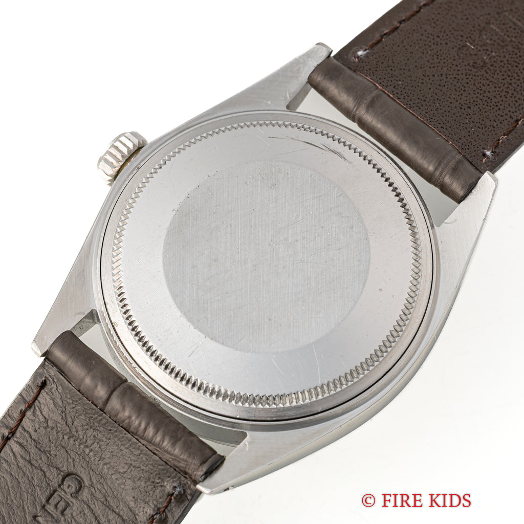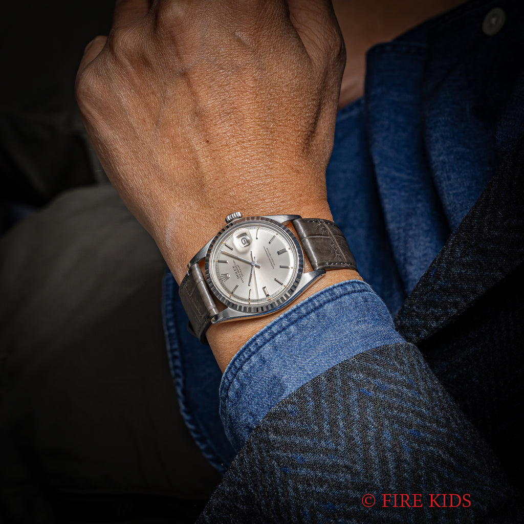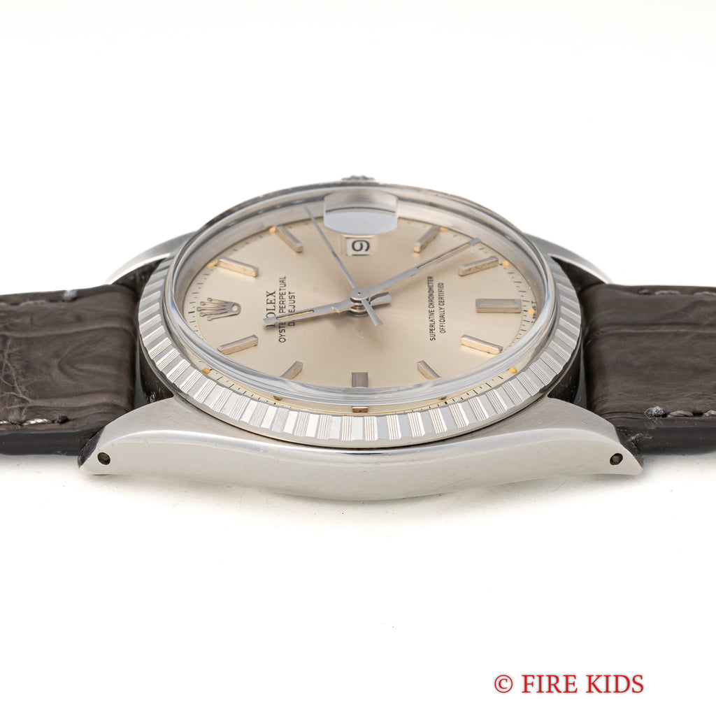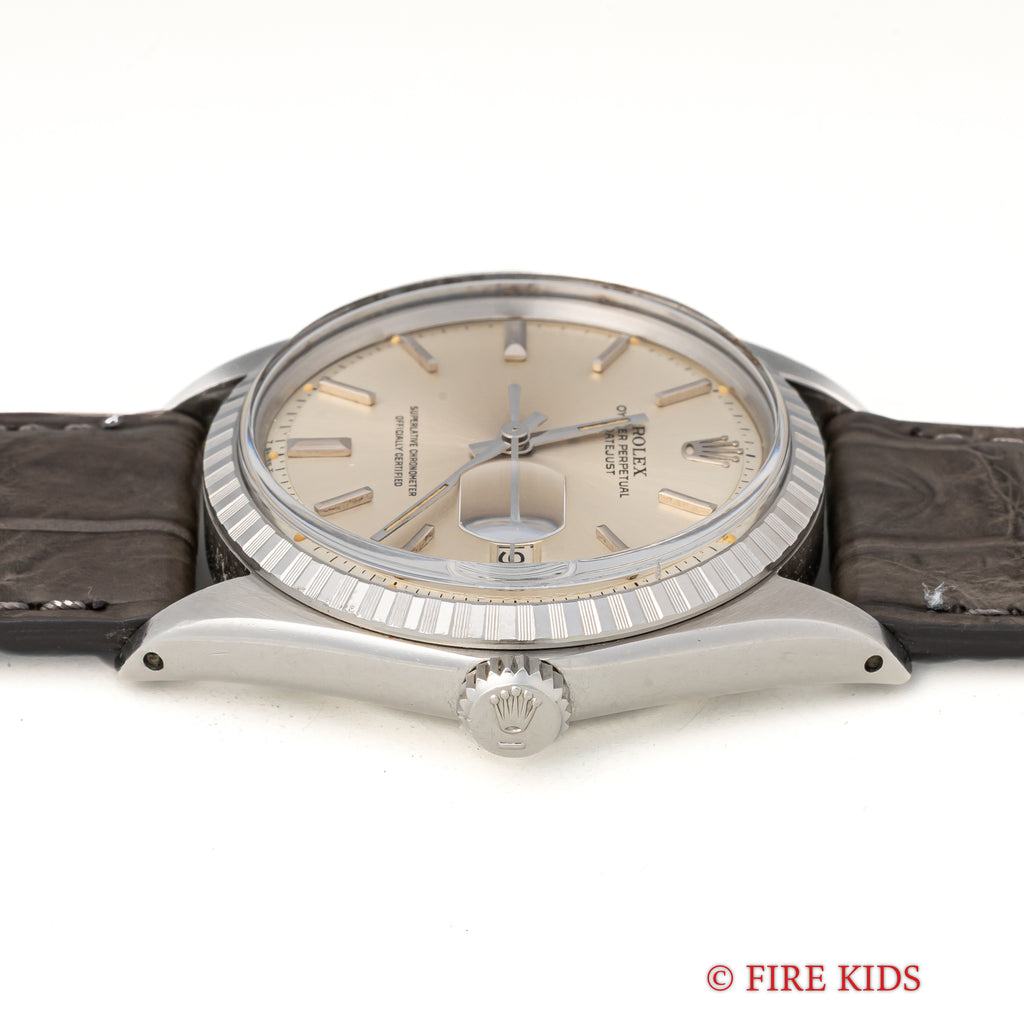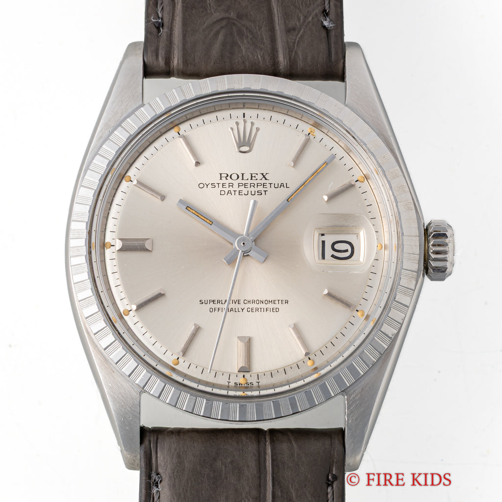 ロレックス デイトジャスト 1970年製 Ref.1603 シルバーダイヤル エングレーブドベゼルの入荷になります。シンプルなシルバーダイヤルにエングレーブドベゼルが印象的な1本です。ベゼルは凹凸がある仕上げですが、山にはなっていないため控えめでより上品な印象を与えます。文字盤は肉眼で目立つシミ等なく良好なコンディションです。ケースは小傷が見られますが大きなダメージはありません。手巻きや針回し、リューズのねじ込みの操作はスムースです。ベルトはファイアーキッズオリジナル革ベルトが装着されています。こちらは分解掃除済みになります。