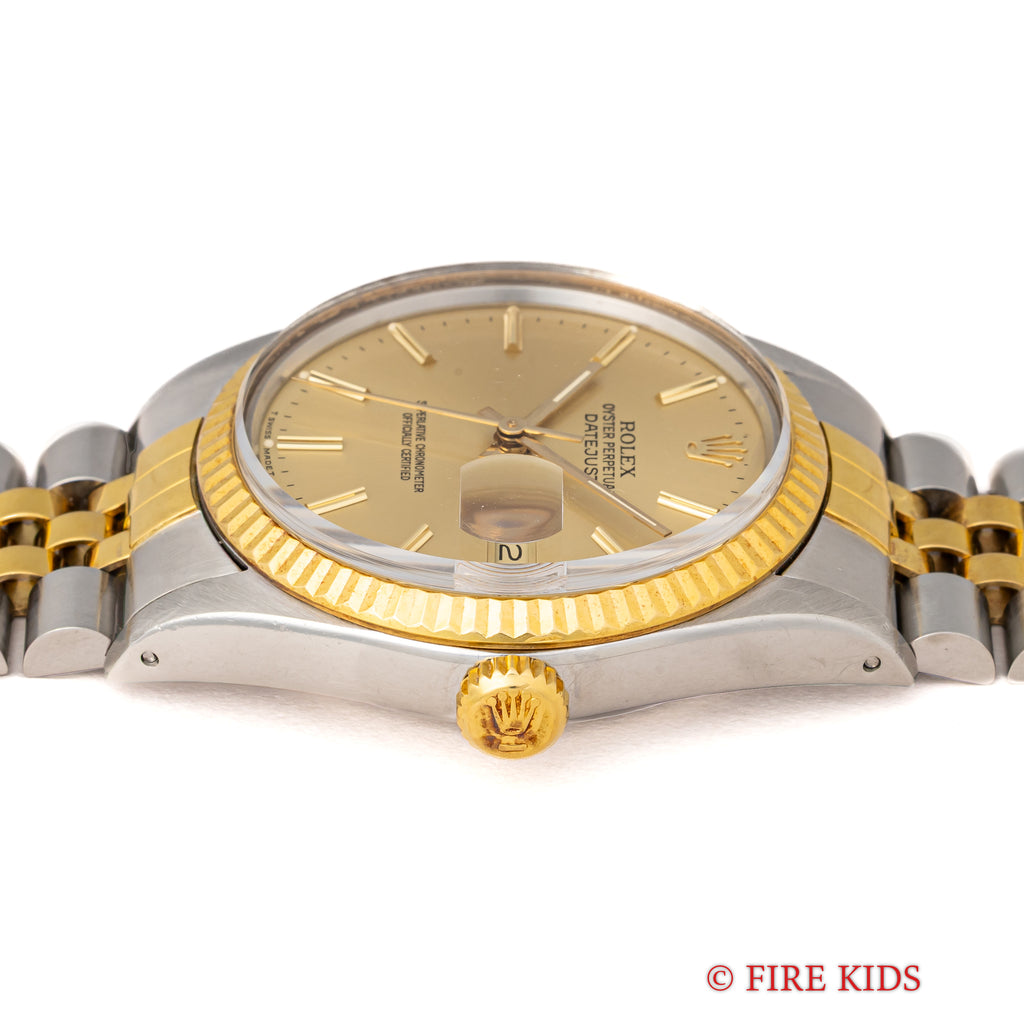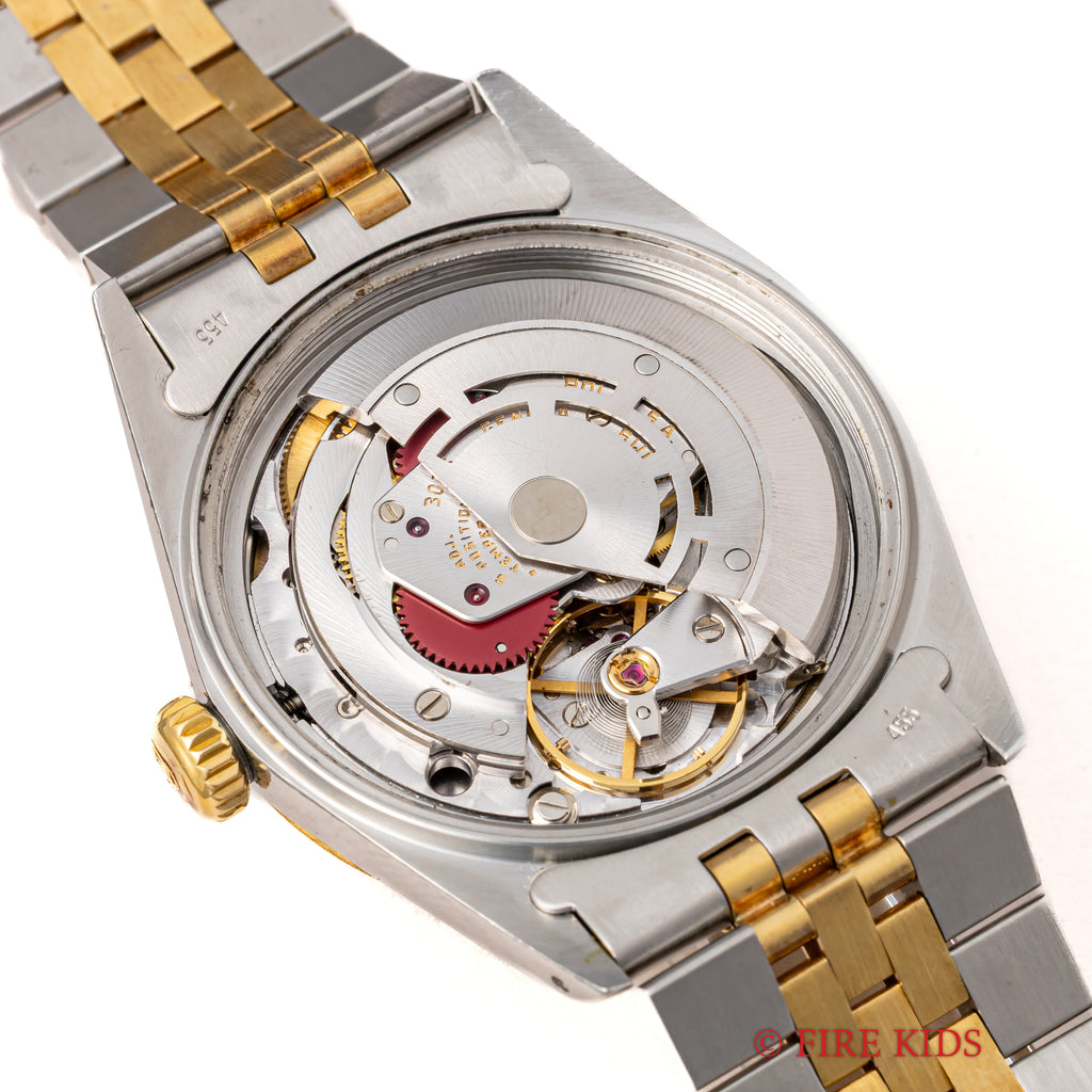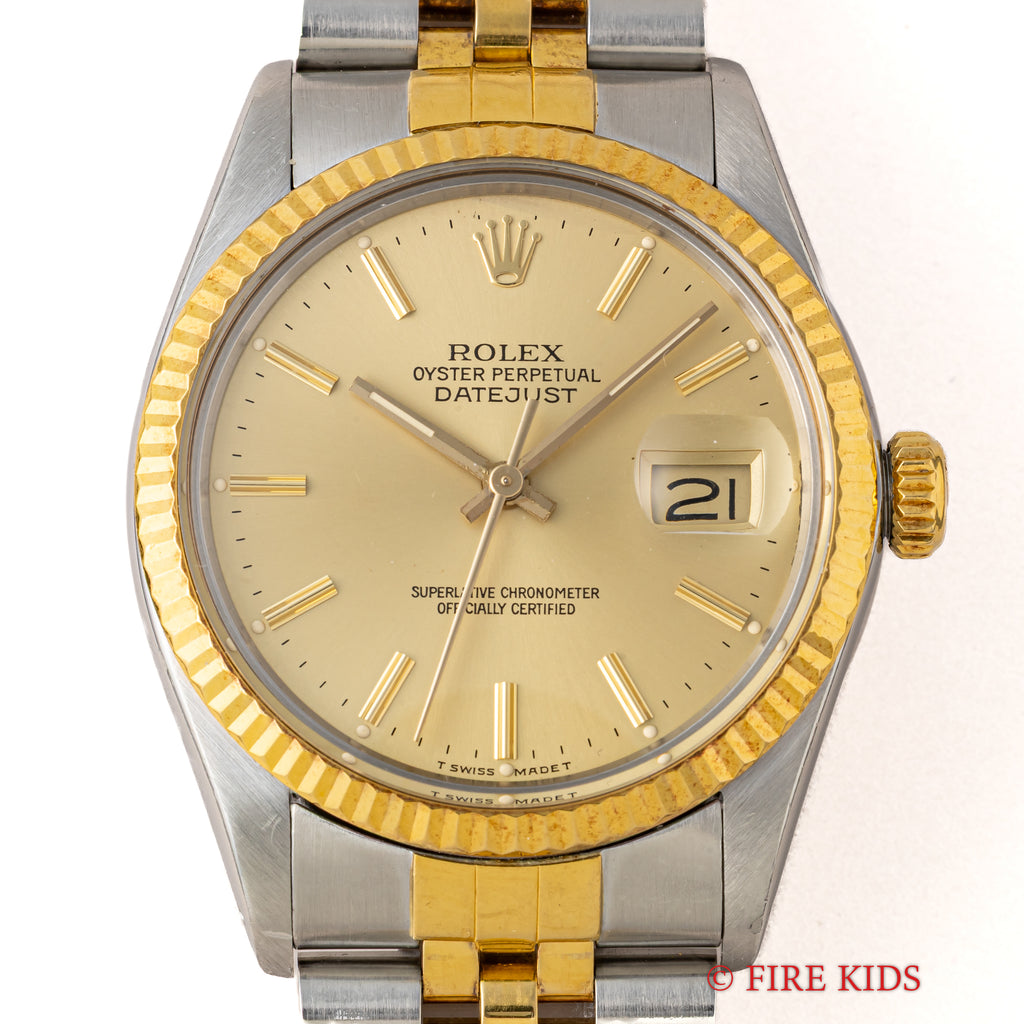 ロレックス デイトジャスト コンビ 1987~88年製 Ref.16013 トリチウム夜光 箱タグ付きの入荷になります。ケース素材はステンレスとイエローゴールドのコンビに文字盤はシャンパンゴールドダイヤルで大人な雰囲気を感じる組み合わせです。ムーブメントは前モデルのCal.1570からハイビートのCal.3035を搭載。ケースは小キズが見られますが大きなダメージはありません。ベルトは純正コンビジュビリーが取り付けてあります。リューズのねじ込みや手巻き針回しの操作もスムースです。こちらの時計は分解掃除済みです。