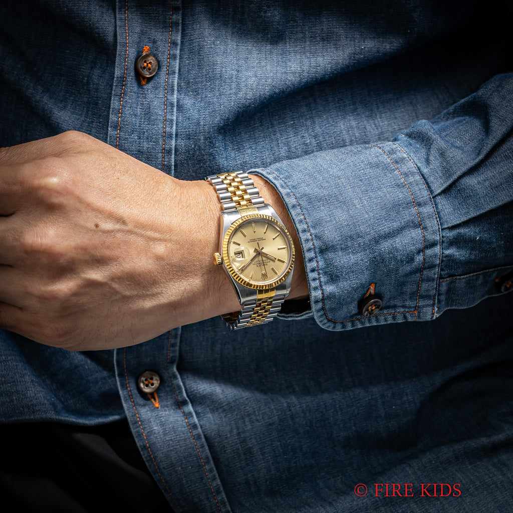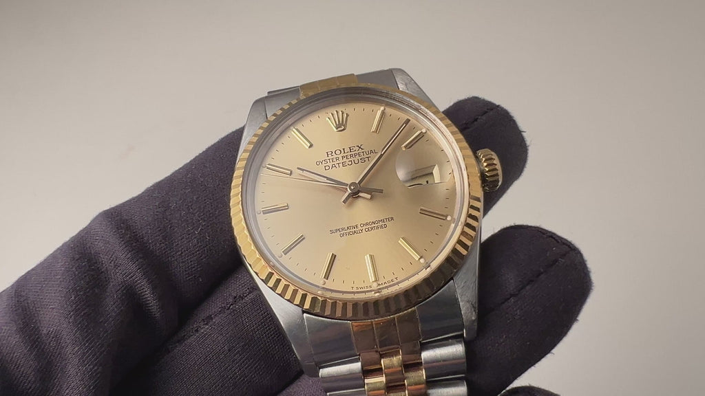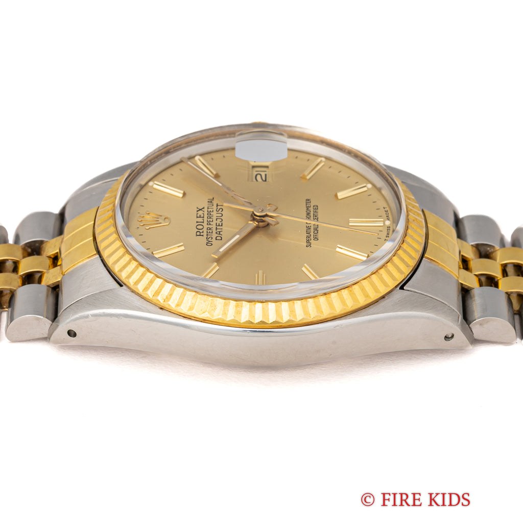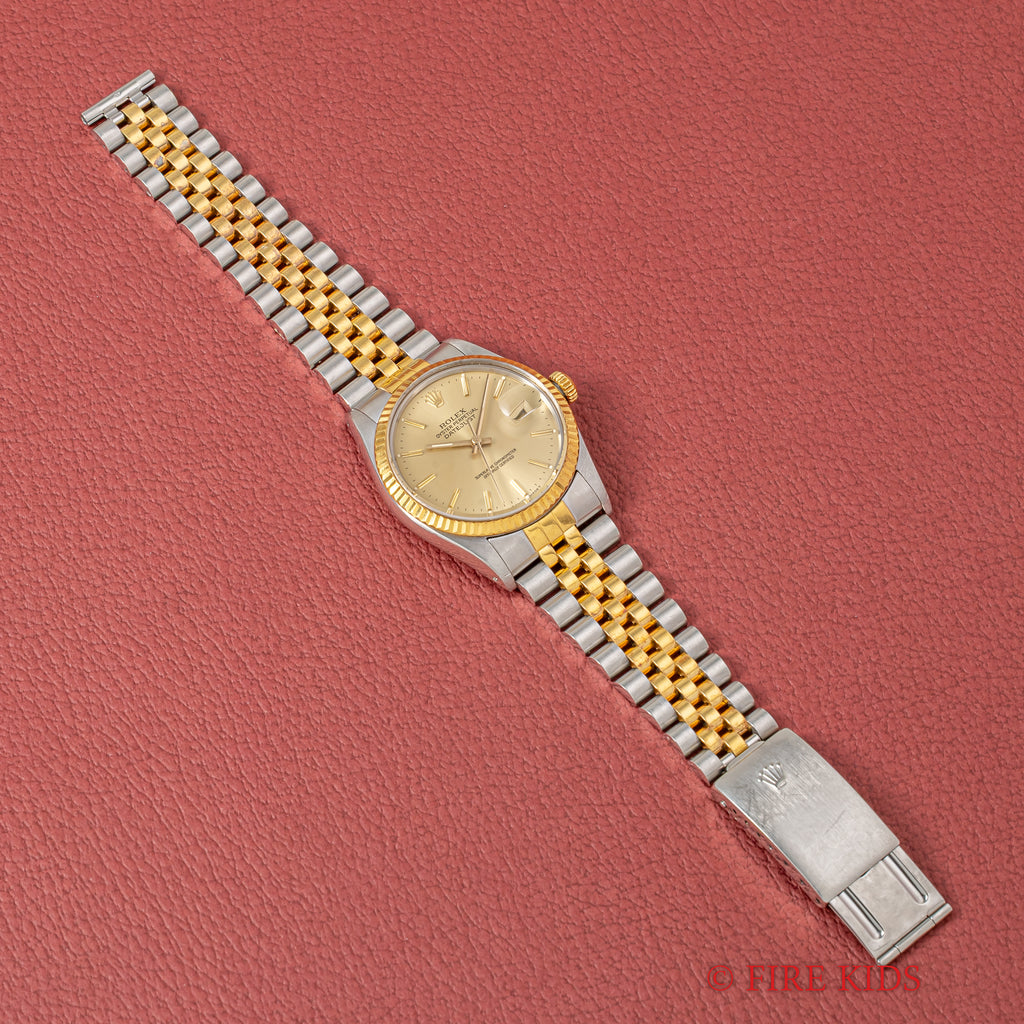 ロレックス デイトジャスト コンビ 1987~88年製 Ref.16013 トリチウム夜光 箱タグ付きの入荷になります。ケース素材はステンレスとイエローゴールドのコンビに文字盤はシャンパンゴールドダイヤルで大人な雰囲気を感じる組み合わせです。ムーブメントは前モデルのCal.1570からハイビートのCal.3035を搭載。ケースは小キズが見られますが大きなダメージはありません。ベルトは純正コンビジュビリーが取り付けてあります。リューズのねじ込みや手巻き針回しの操作もスムースです。こちらの時計は分解掃除済みです。