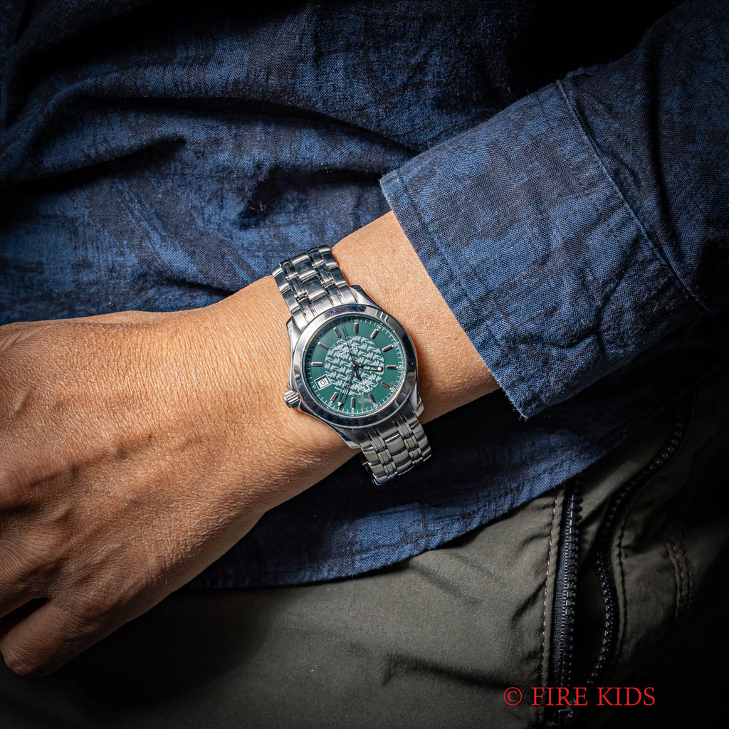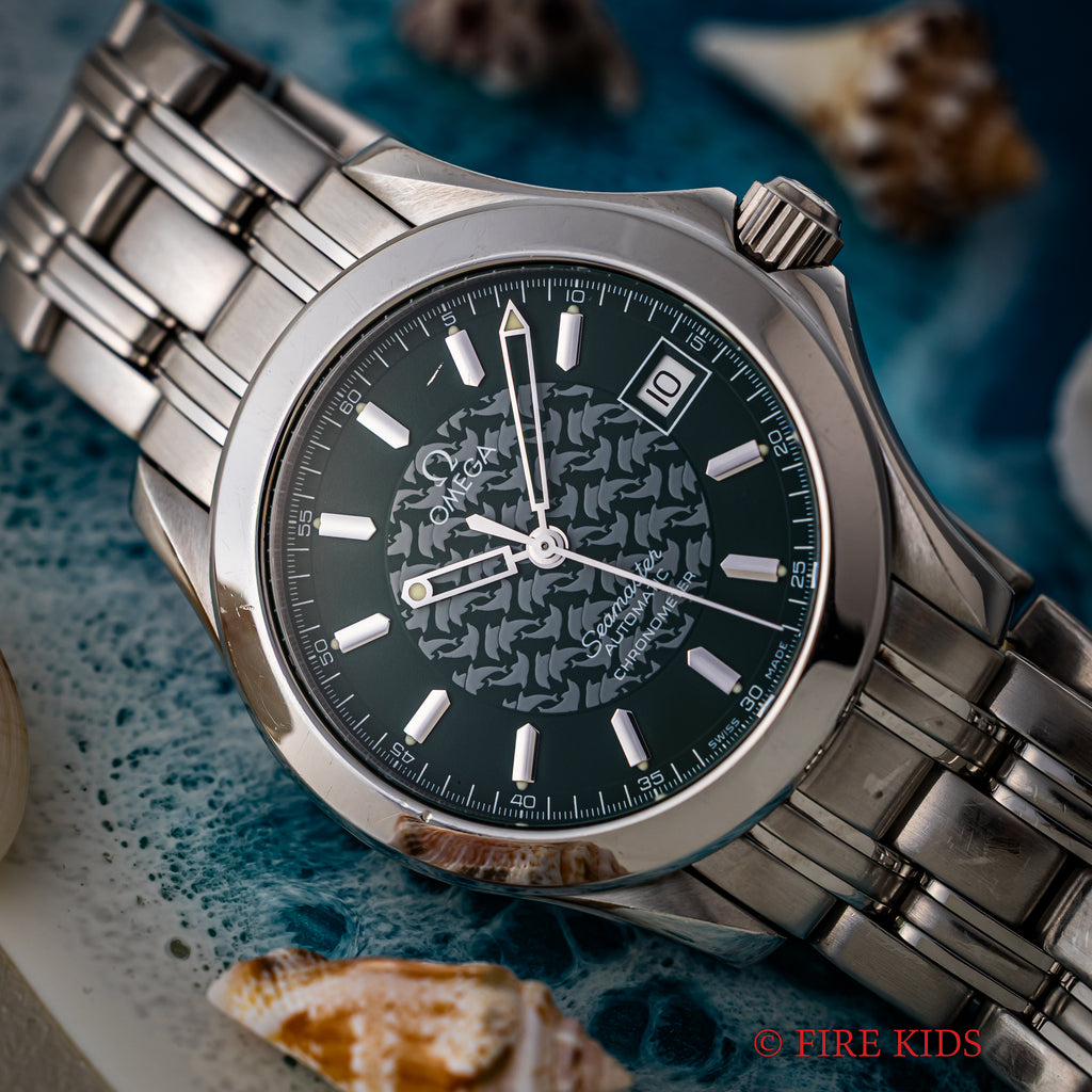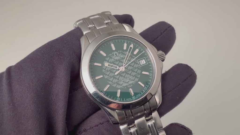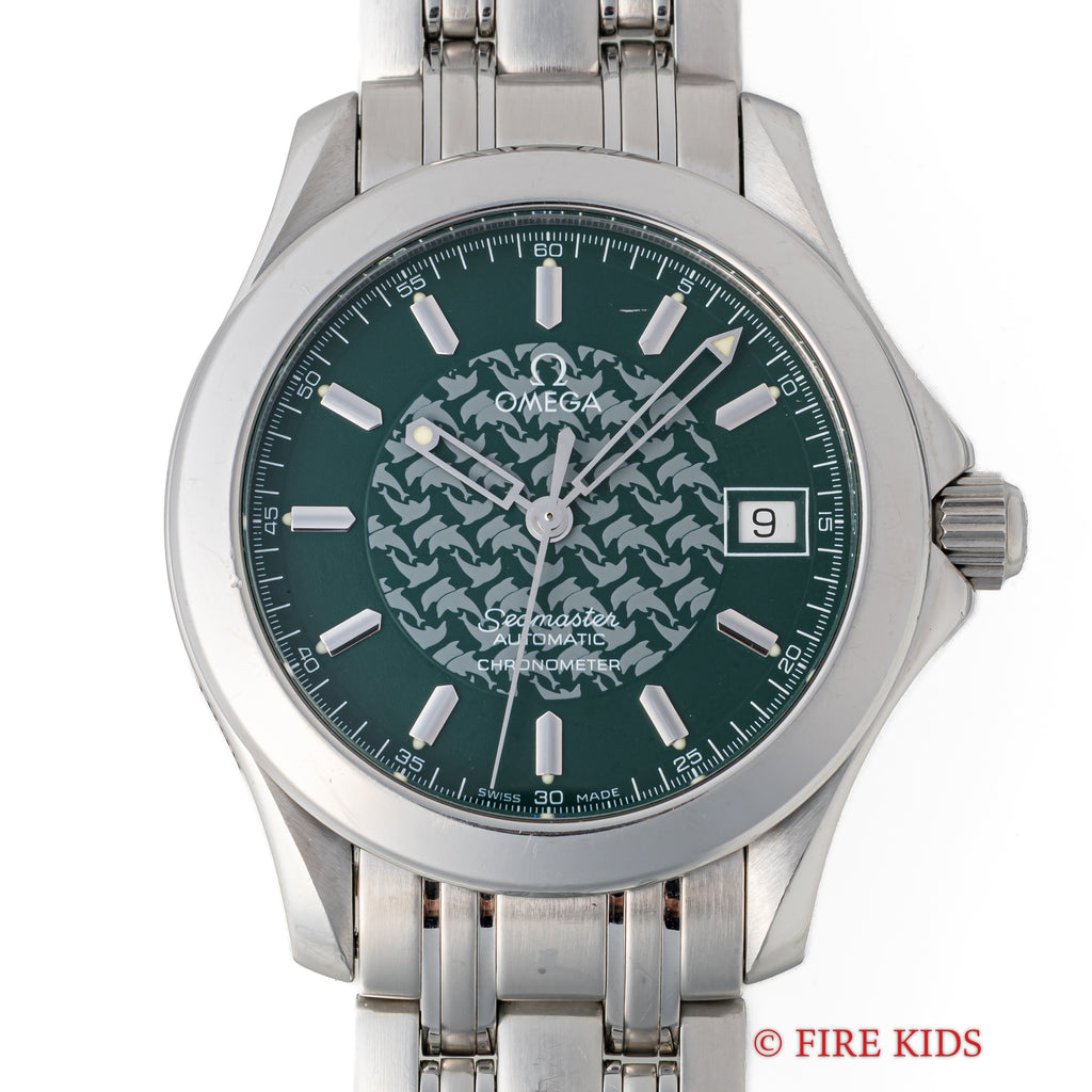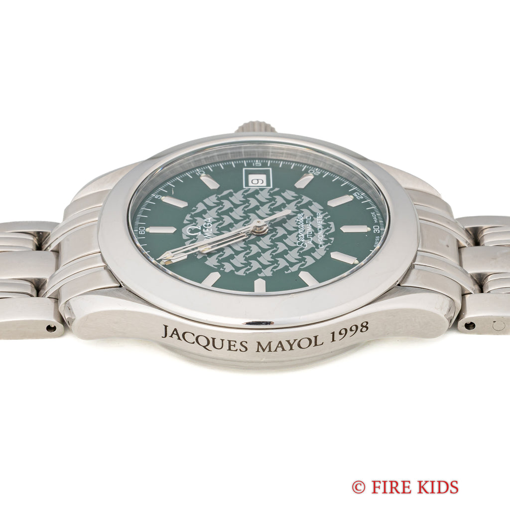 オメガ シーマスター120 ジャック・マイヨール 1998年製 限定モデル 自動巻き Ref.2506.70168.1614 Cal.1120です。世界で初めて素潜りで100mを超えたジャックマイヨールの冠したモデルで、ケース側面には「JACQUES MAYOL 1998」の刻印と文字盤中央にはイルカのパターンがプリントされています。ムーブメントは自動巻きのCal.1120を搭載。ケースは小傷程度で大きなダメージはございません。ベルトは純正のステンレスベルトが付いています。手巻きや針回し、ねじ込みリューズの操作はスムースです。こちらはギャラ付です。