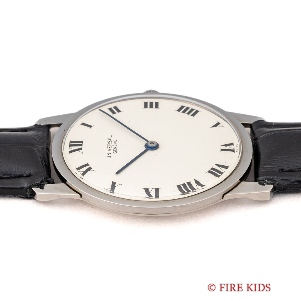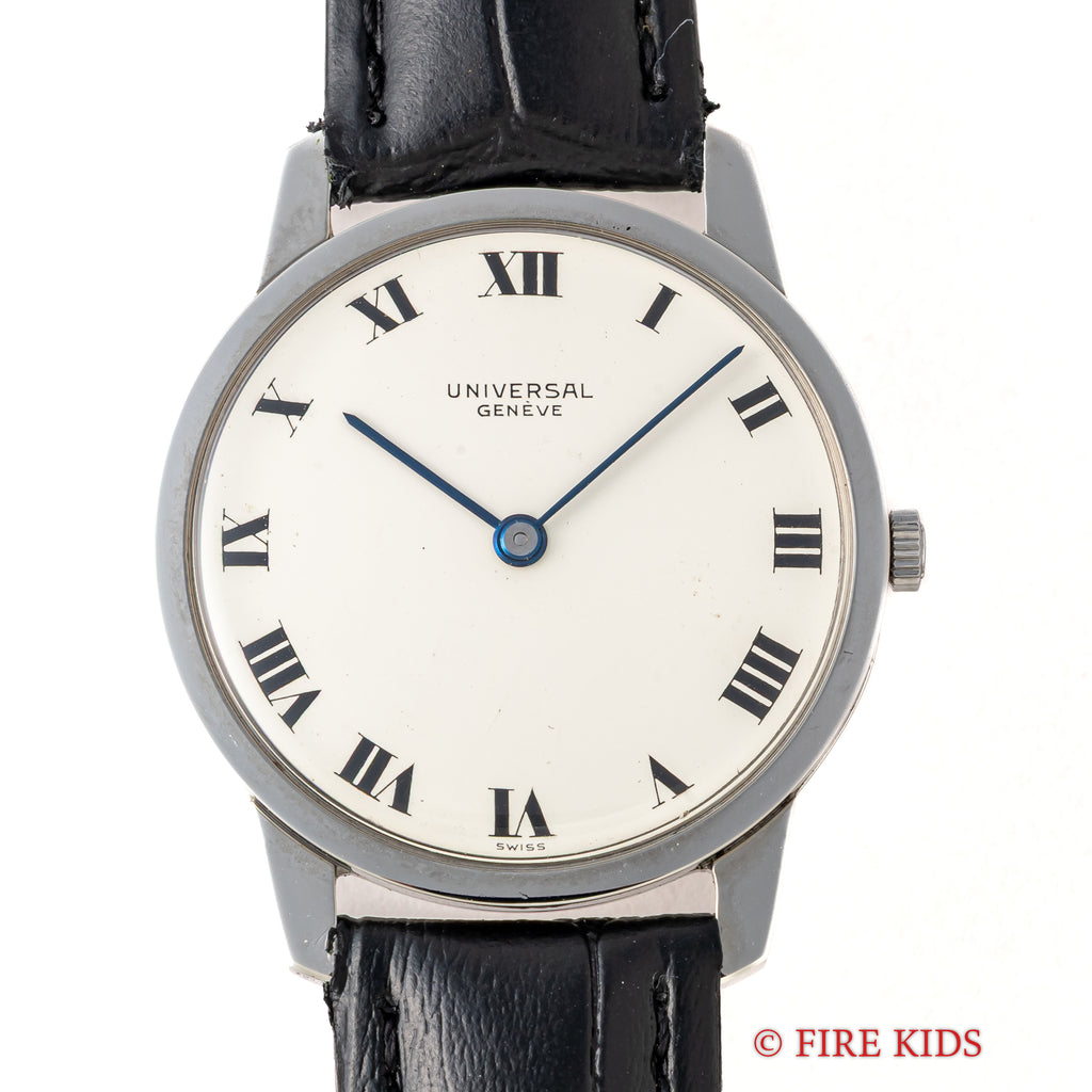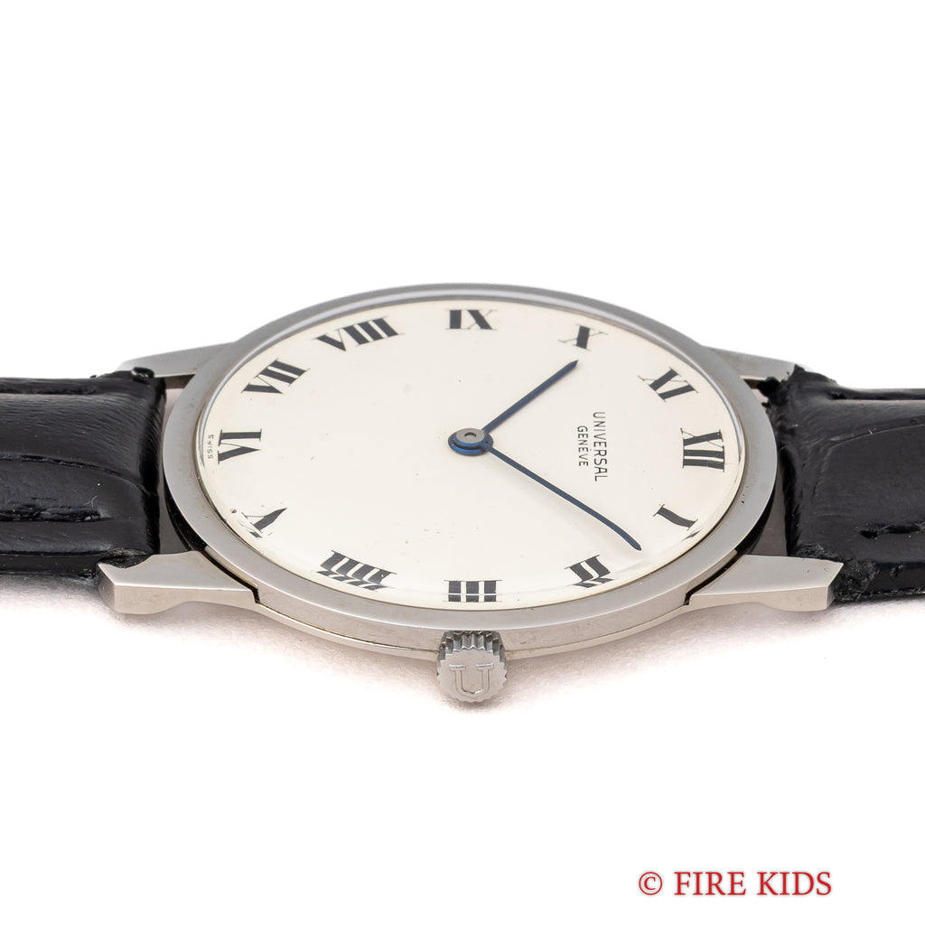 1970年代製ユニバーサルジュネーブ アルテッセ ホワイトローマンダイヤルです。約6.5㎜の薄型手巻き式で当時のタグには65000円となっている高級モデルです。文字盤、ケースともに大きなダメージはありません。ベルトは社外の革ベルトに純正尾錠を合わせています。手巻きや針回しの操作はスムースです。