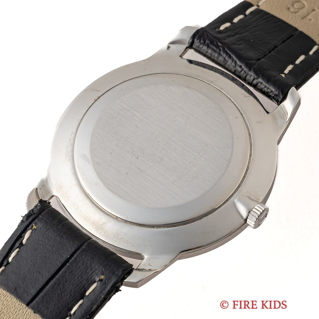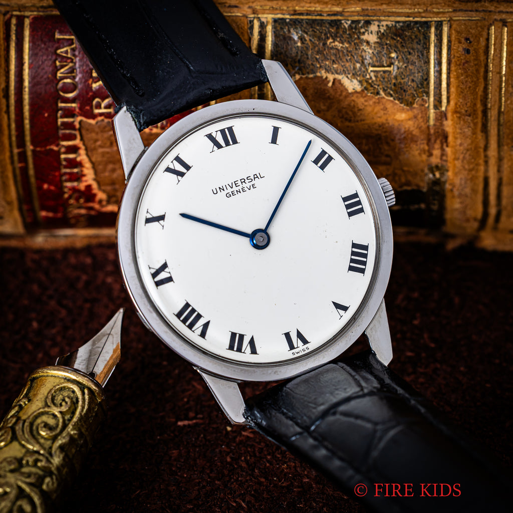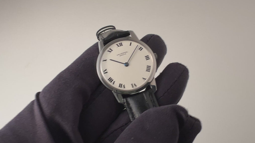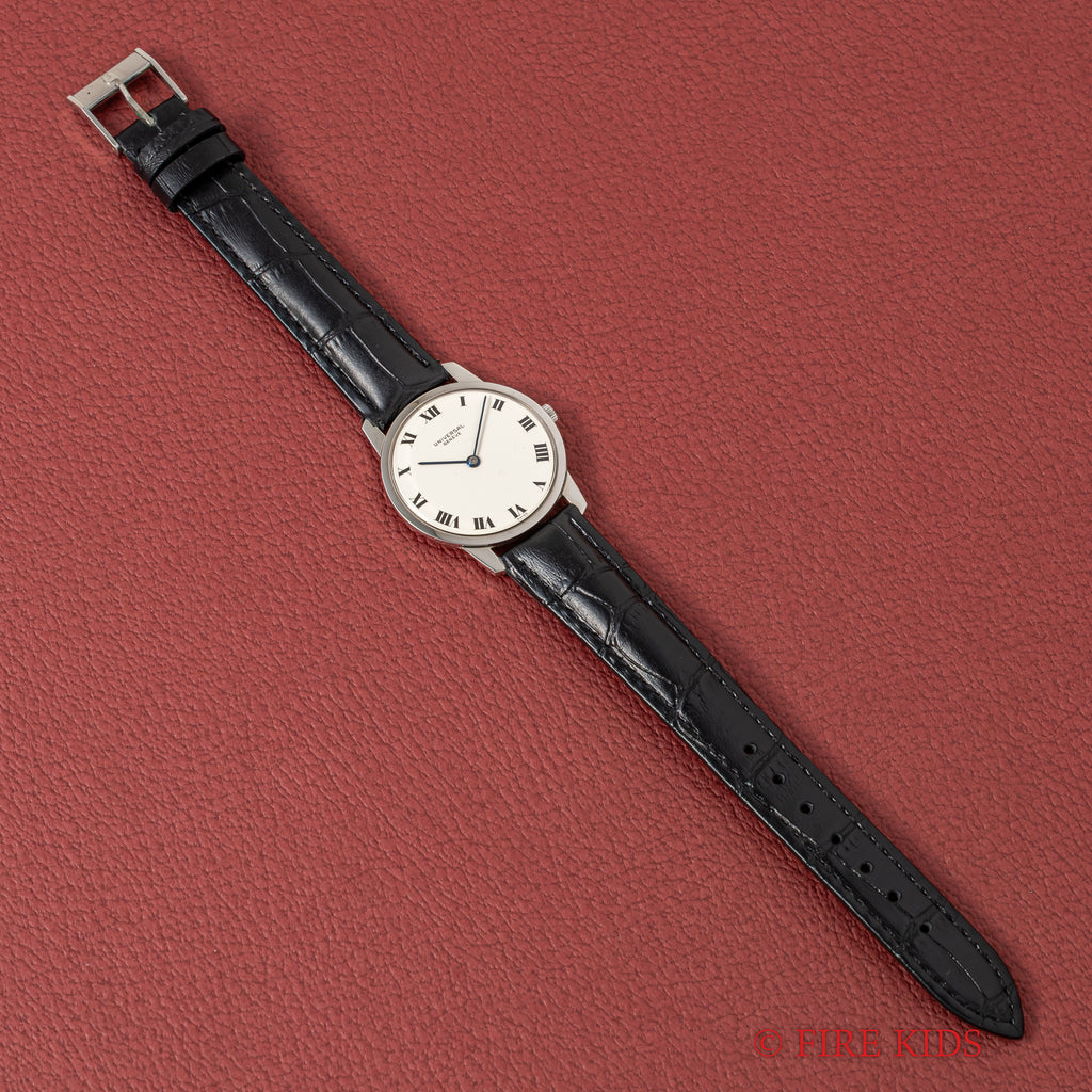 1970年代製ユニバーサルジュネーブ アルテッセ ホワイトローマンダイヤルです。約6.5㎜の薄型手巻き式で当時のタグには65000円となっている高級モデルです。文字盤、ケースともに大きなダメージはありません。ベルトは社外の革ベルトに純正尾錠を合わせています。手巻きや針回しの操作はスムースです。