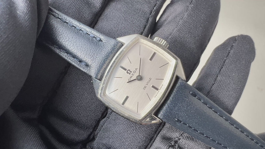 1970年のオメガ デヴィル レディースモデルです。オクタゴン角型ケースに文字盤はシンプルなデザイン性の高いモデルです。ムーブメントは手巻き式になります。裏蓋には保護シールが残るミントコンディションです。ケースは保管時とみられる小傷はございますが大きなダメージはございません。手巻きや針回しの操作はスムースです。ベルトはオメガ純正の純正の尾錠が取り付けてあります。
