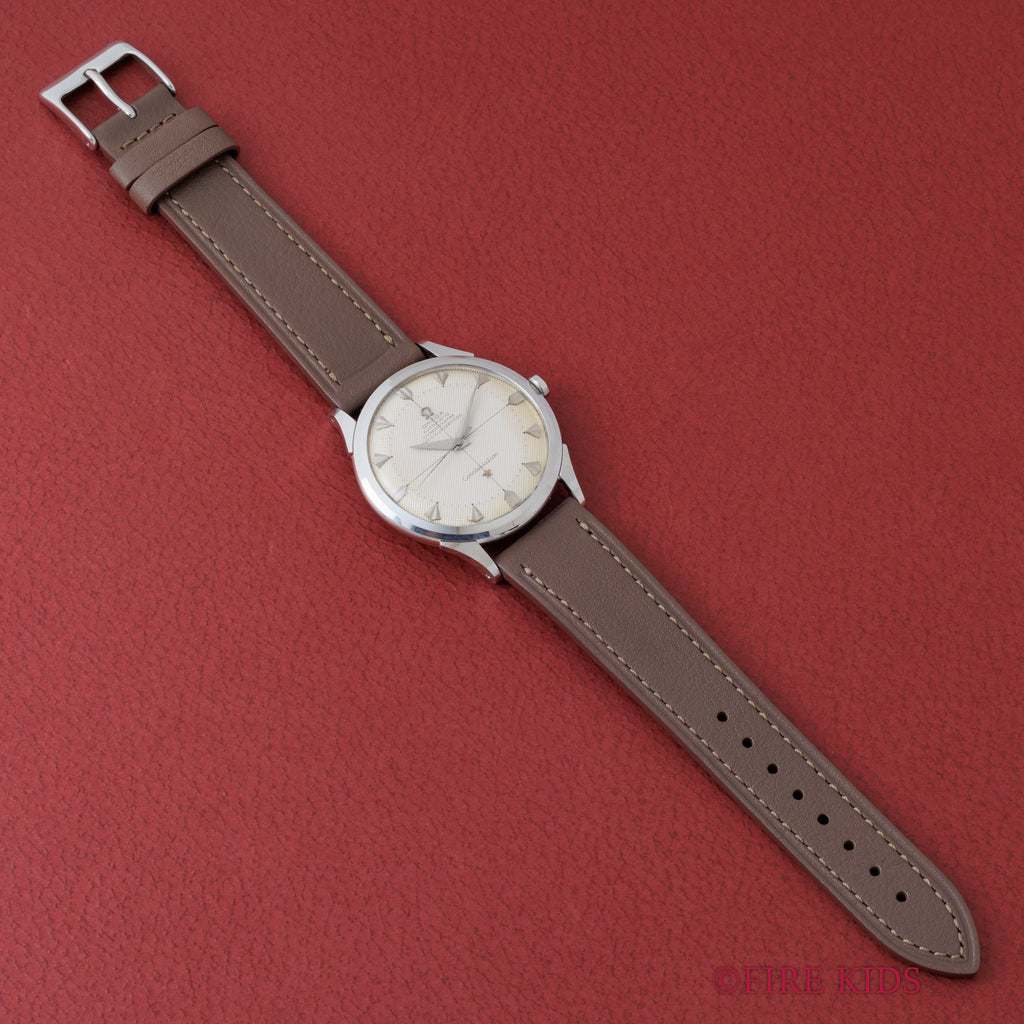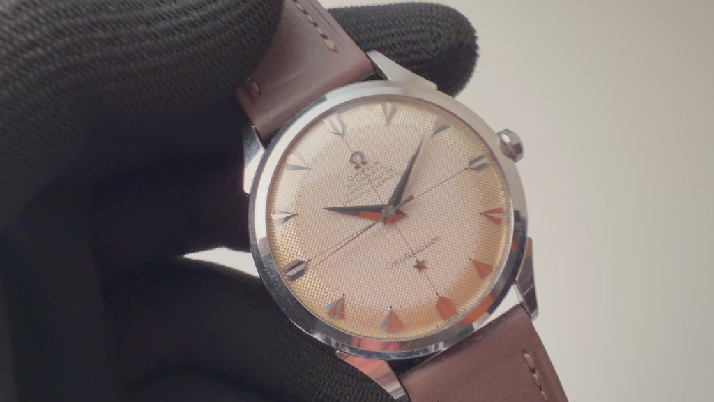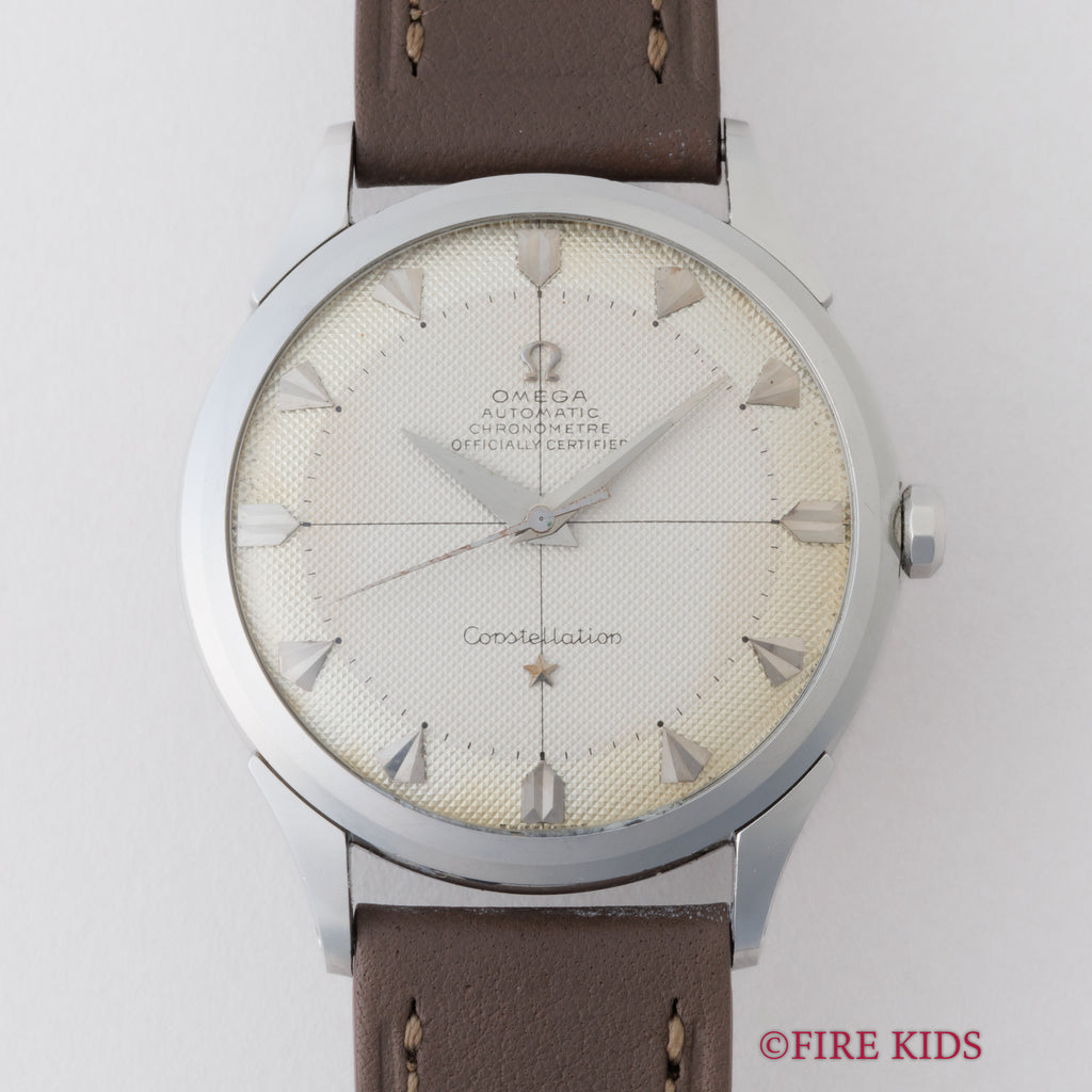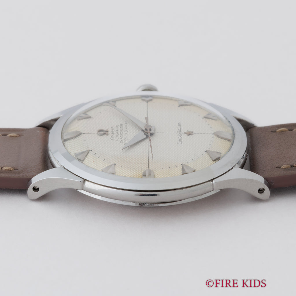 オメガ コンステレーション初期型 1952年製 ハートインデックス バンパー式オートマチック Cal.354 Ref.2648‐2の入荷になります。1952年発売のコンステレーションの初期型です。バンパー式オートマチックのクロノメーターCal.354を搭載しています。文字盤は外周がギョウシェ彫が施されたツートンダイヤルでハートインデックスが目を惹きます。外周に変色が見られますがシミ等無く綺麗です。ケースは小傷が見られますが大きなダメージはありません。ベルトは社外のカーフが取り付けられています。