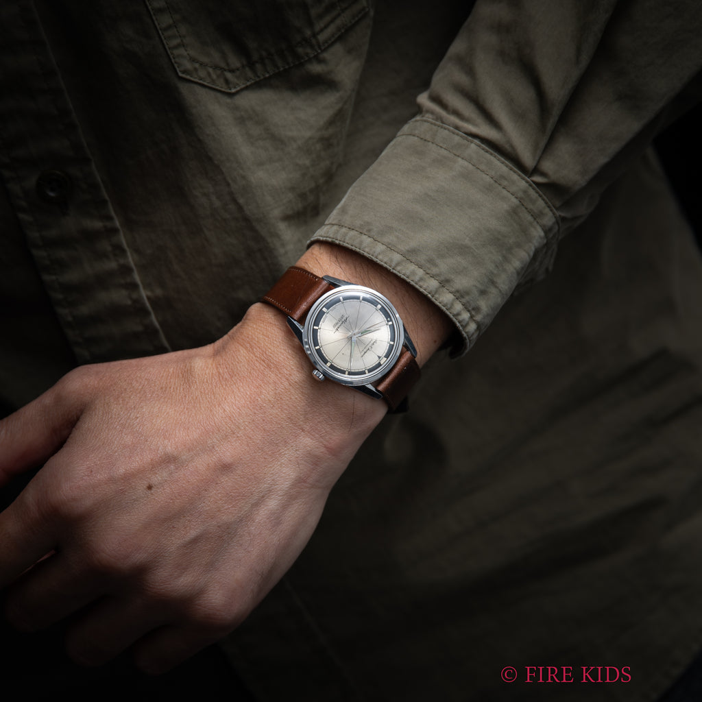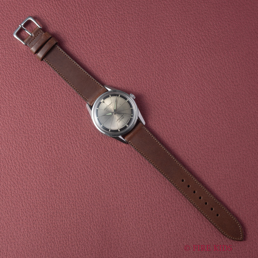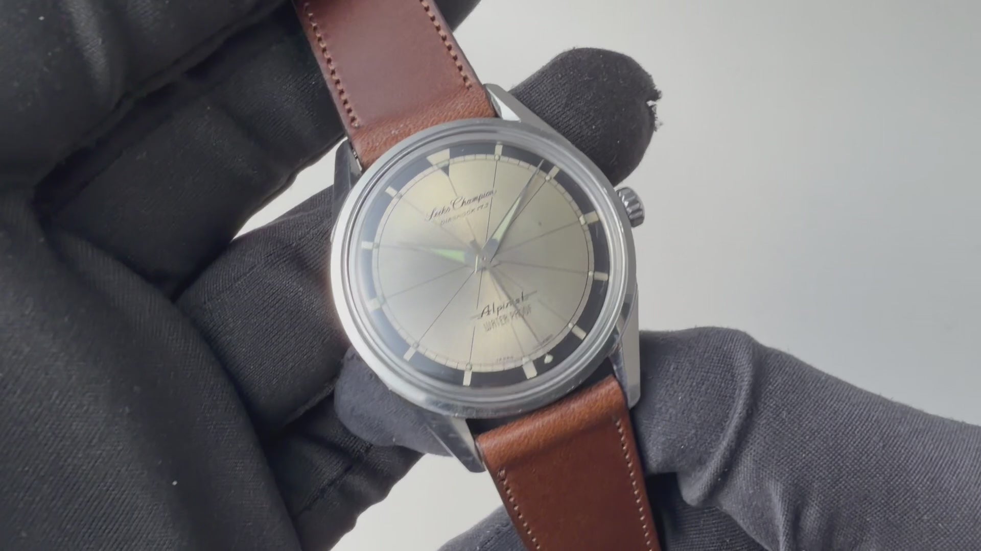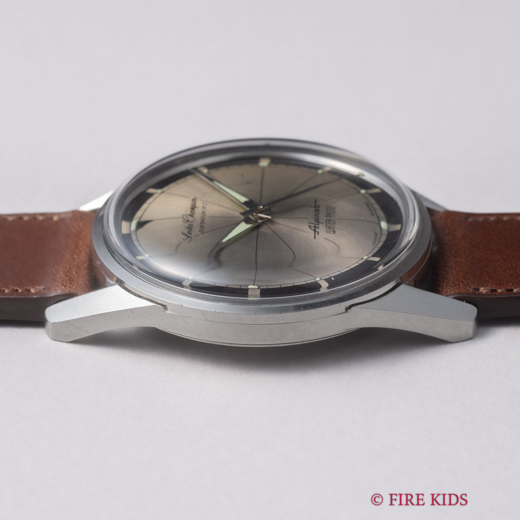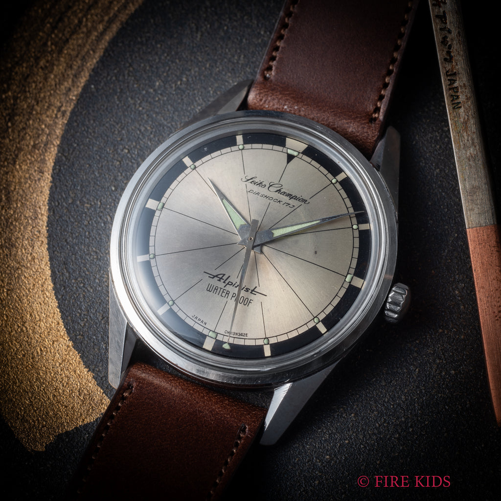 セイコー チャンピオン アルピニスト Ref.J13043です。人気モデルのアルピニストのセカンドモデルでセイコーのフィールドウォッチとして販売されたスポーティなモデルです。特徴的な12分割のラインや夜光が入った文字盤が格好良い時計です。ケースは小傷がありますが、磨きを感じない自然な状態です。ファイアーキッズオリジナルブッテーロカーフレザーを合わせています。こちらは分解掃除済みです。