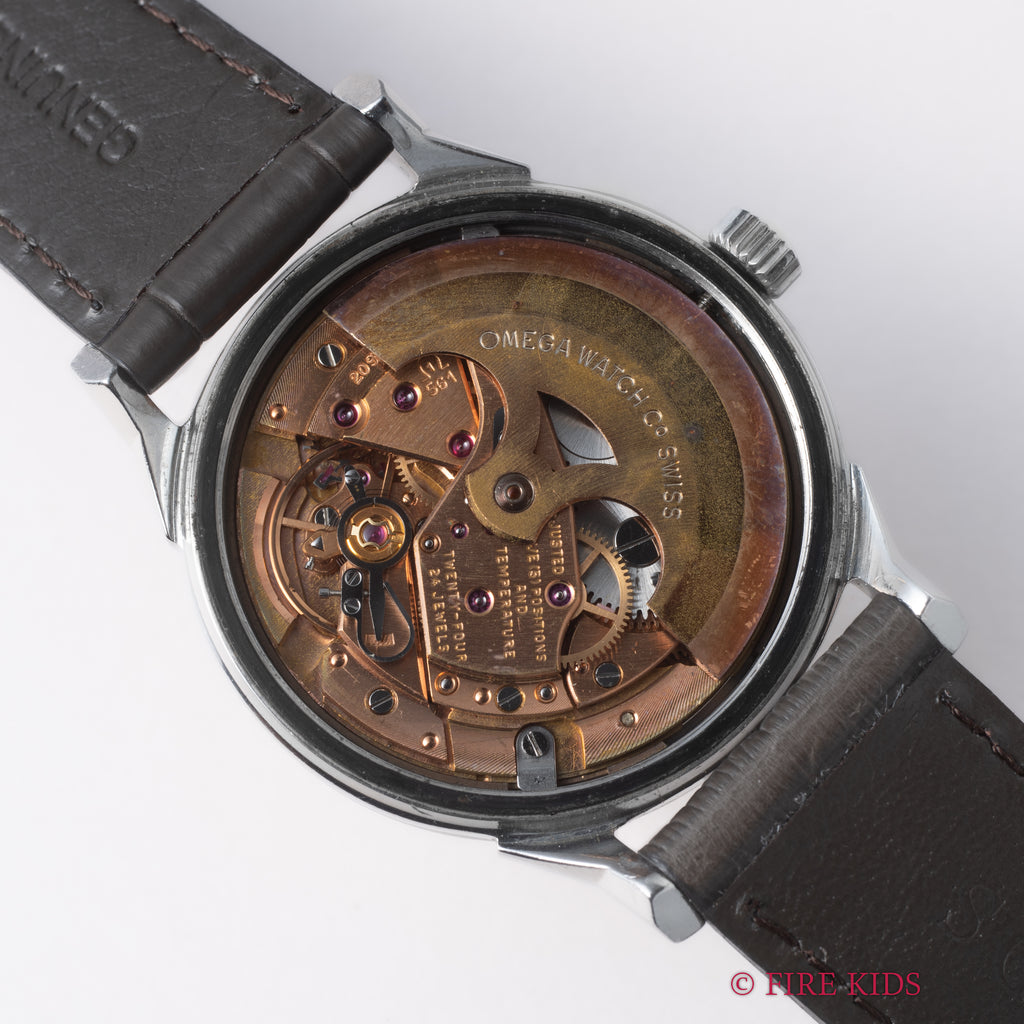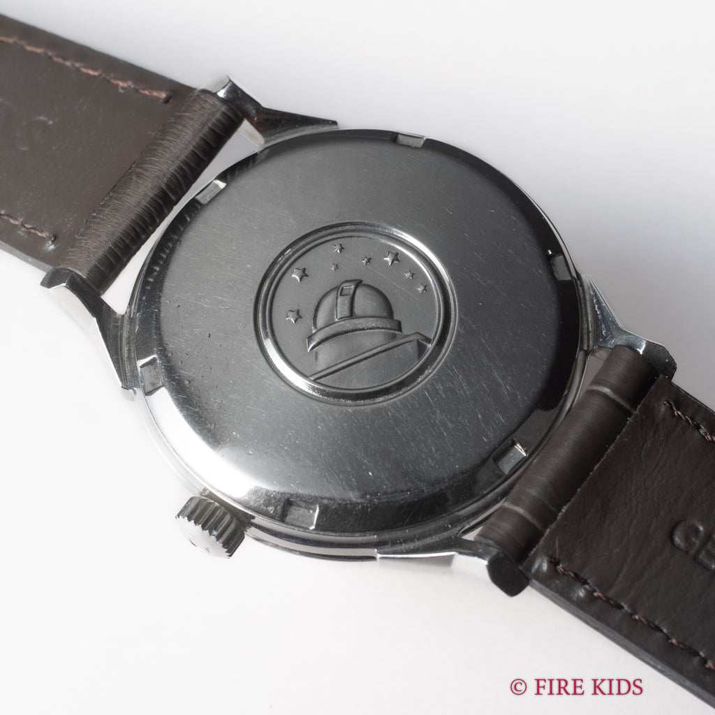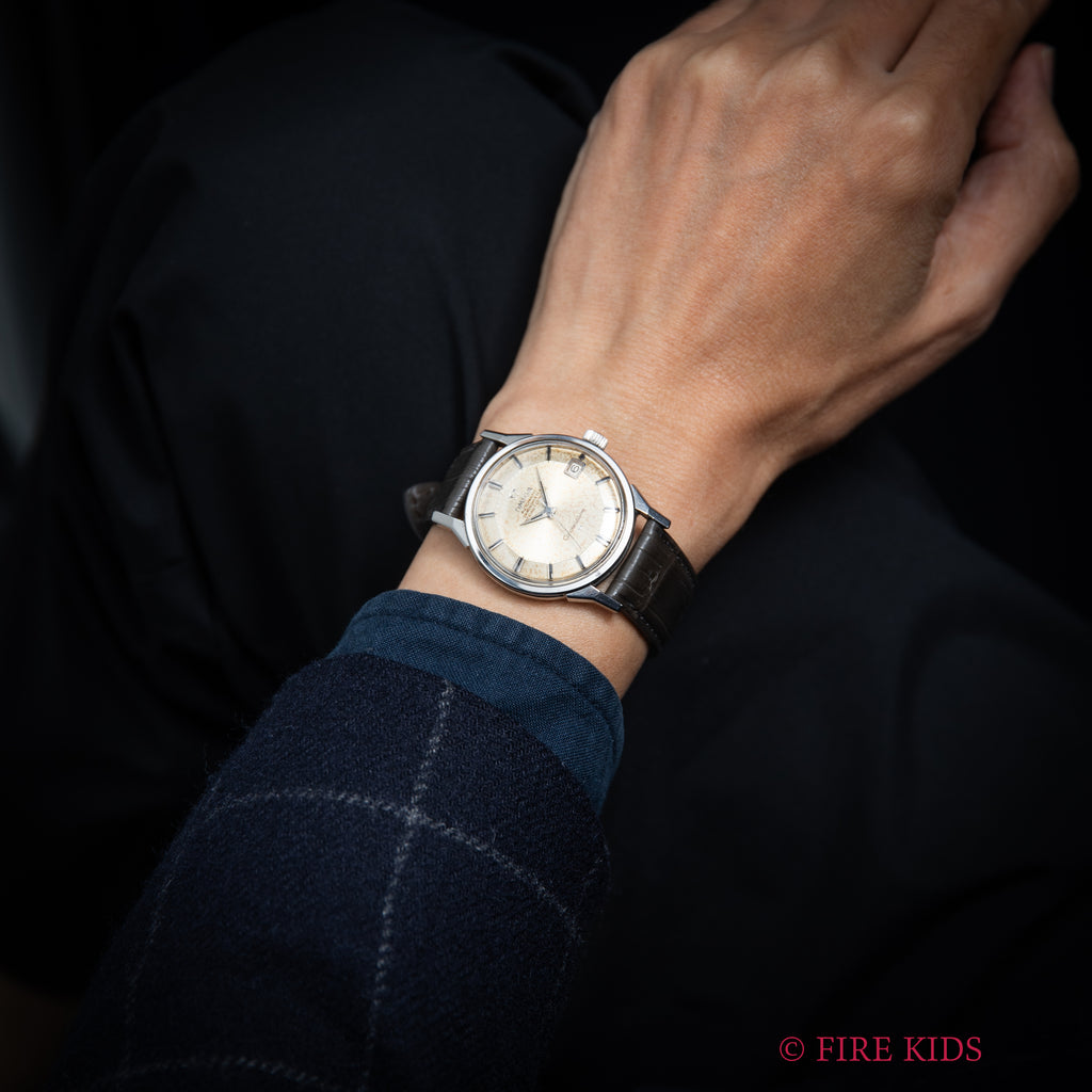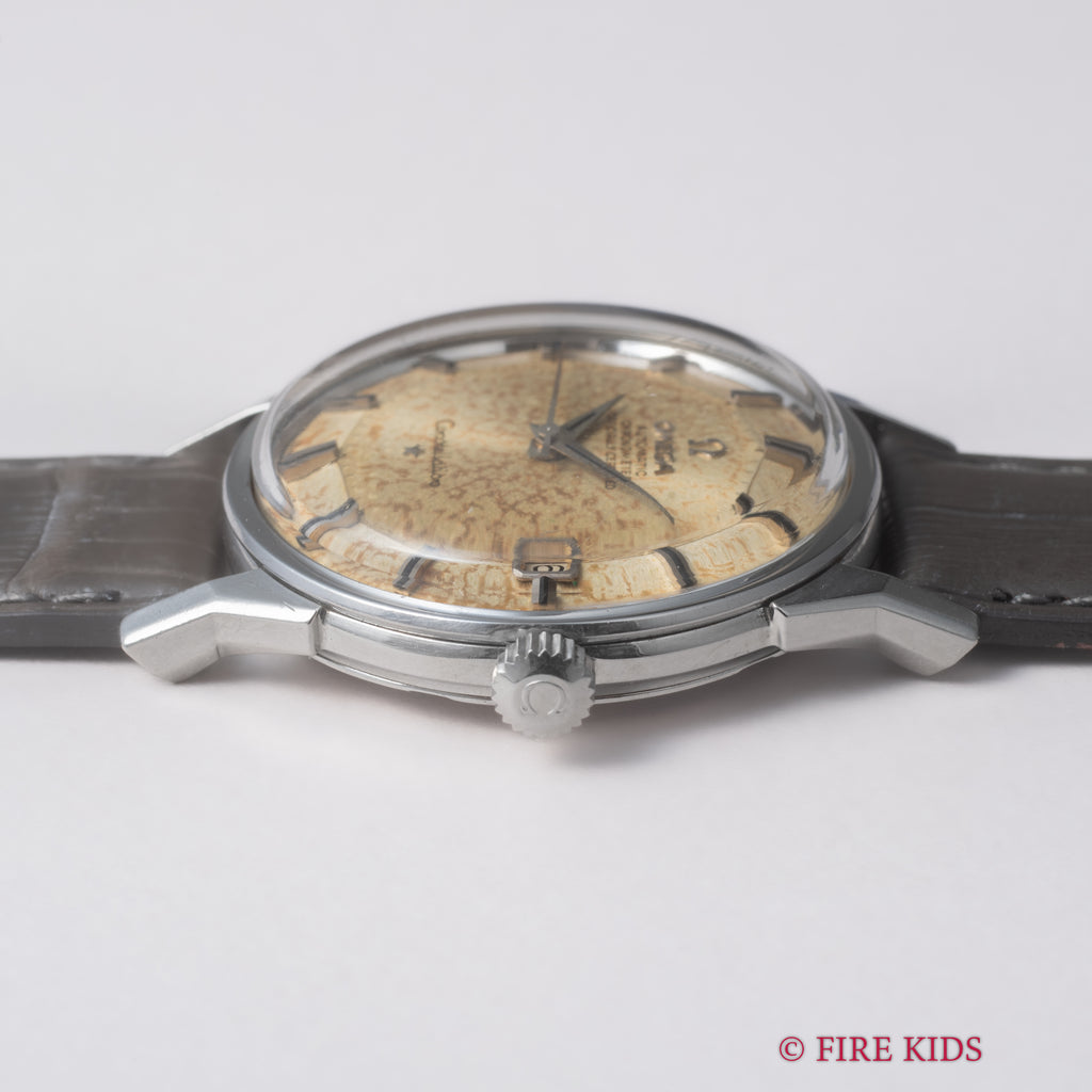 1960年代後半、スイス時計産業が黄金時代を迎える中で、オメガはその技術力と精度を誇示するためのフラッグシップモデル「コンステレーション」を次々と発表していました。本品はその中でも高い人気を誇る、通称“12角ダイヤル”を備えたRef.168.005 SP、1963年製の一本です。このモデルの最大の特徴は、視認性と光の反射を美しく演出する12角の立体的なダイヤル。経年はありますが、良い雰囲気になっています。Cal.561は、当時のオメガ最高峰の自動巻きムーブメントの一つで、二段引きで日付のクイックチェンジ機能を備えた最終進化型。堅牢性とメンテナンス性に優れ、現在も高く評価されています。ケースバックにはコンステレーション伝統の天文台のメダリオンがしっかりと残っております。ベルトはファイアーキッズオリジナルのクロコダイル革ベルトを合わせています。手巻きや針回しはスムーズです。