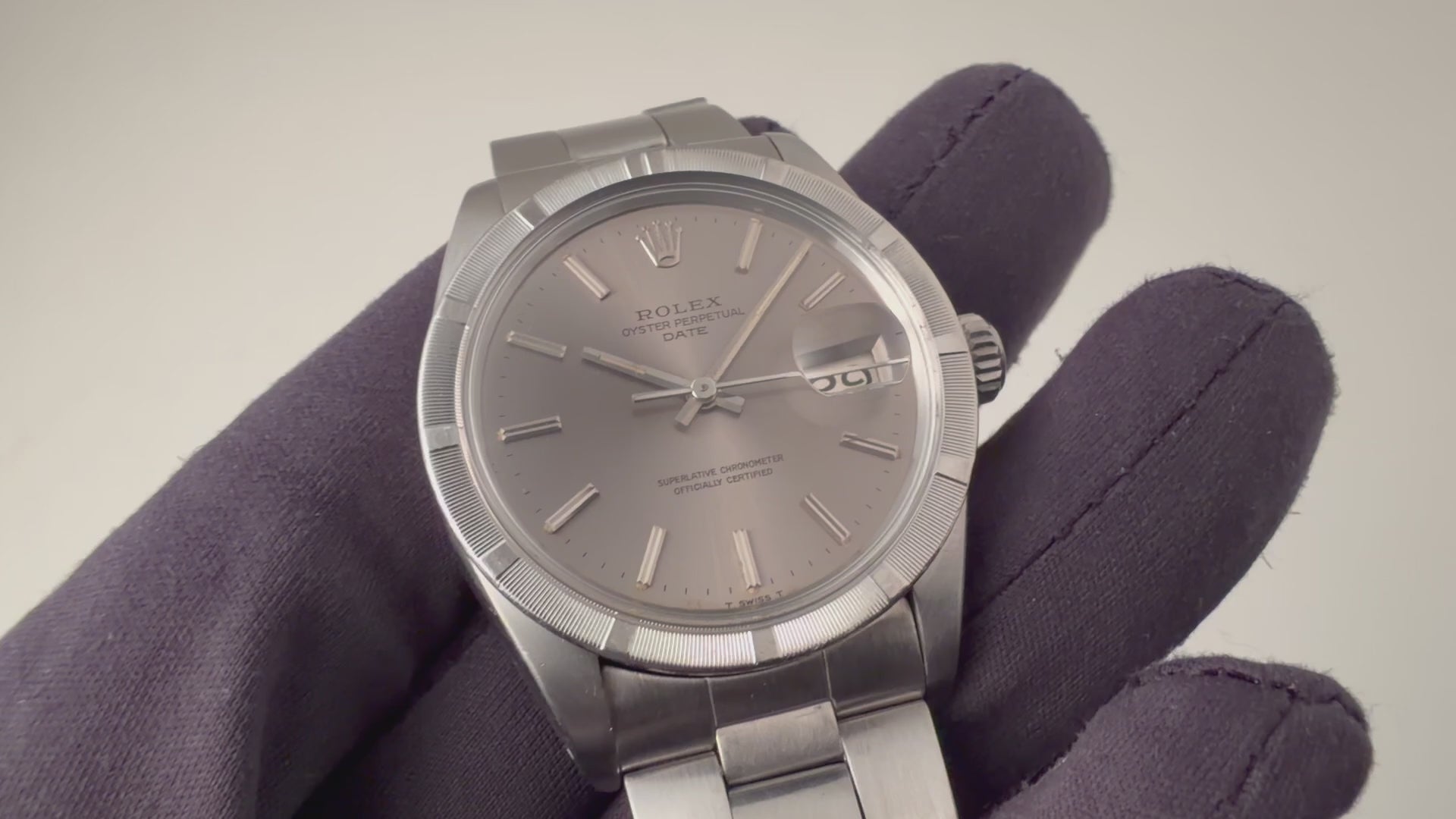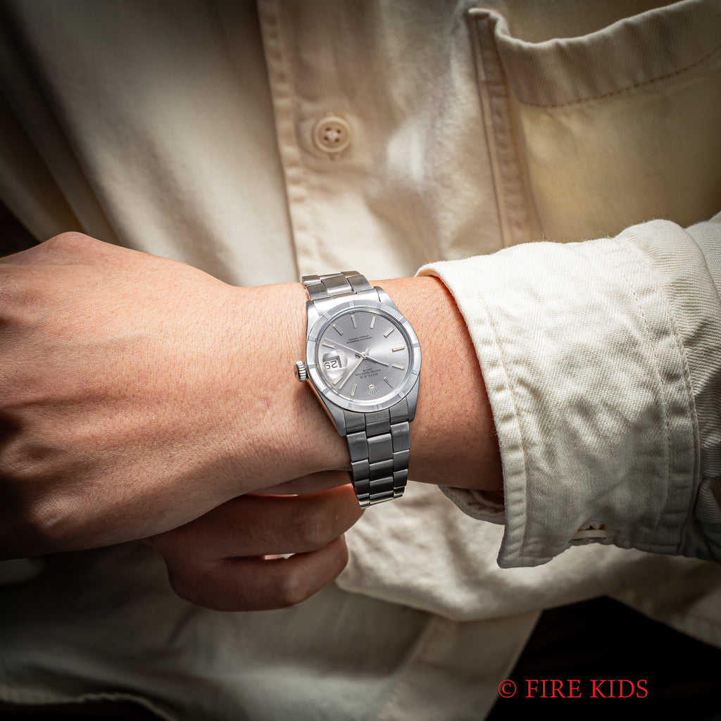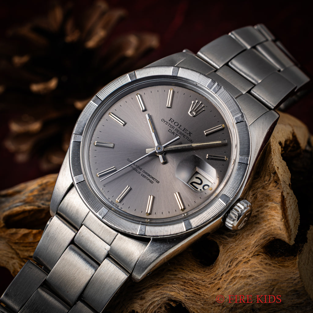 ロレックス オイスターパーペチュアルデイト 1971年製 パープルグレーダイヤル エンジンターンドベゼル Ref.1501 純正ブレス付き