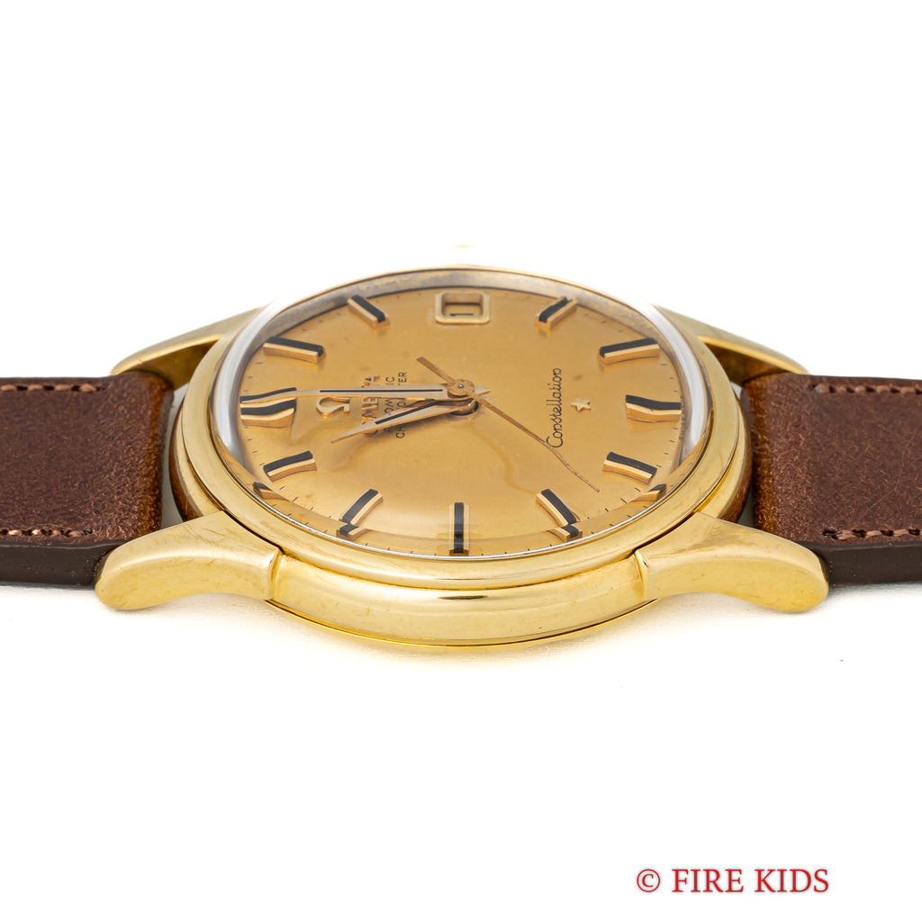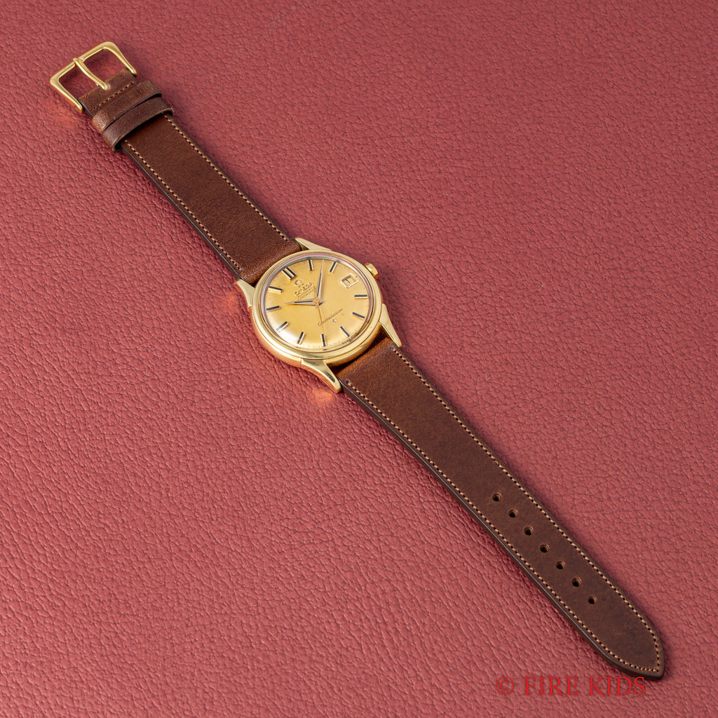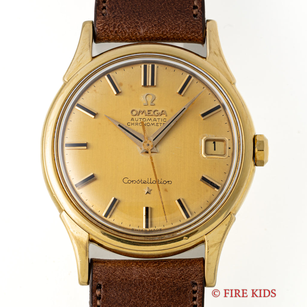 オメガ 18金無垢コンステレーション 1961年製 クロノメーター自動巻き Cal.561の入荷になります。オメガの最高級ラインであるコンステレーションの中でも高級感のある18金無垢ケース、オニキスインデックス、シャンパンダイヤルです。裏ブタの天文台メダリオンもしっかり残っています。ムーブメントはクロノメーターのCal.561を搭載。ケースは小傷はありますが大きなダメージはありません。手巻きや針回しの操作はスムースです。ベルトはファイアーキッズオリジナルイタリアンレザーのブッテーロ(裏面ラバー)が取り付けられています。こちらの時計は分解掃除済みです。