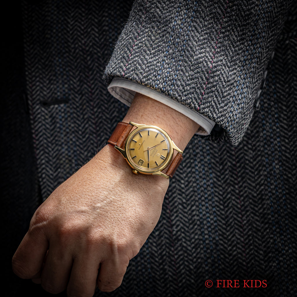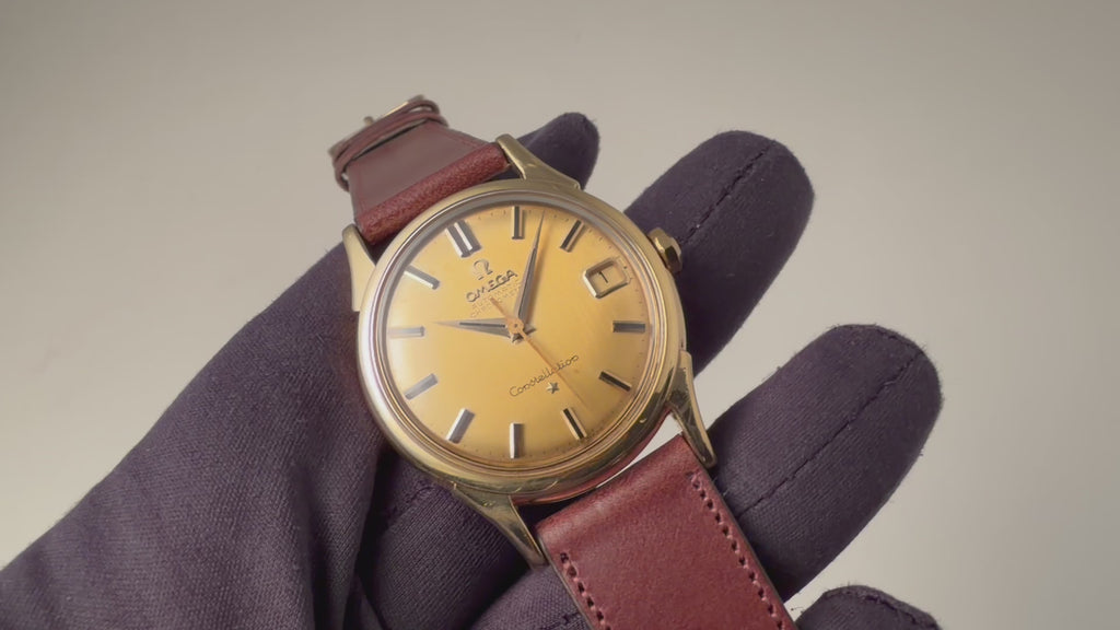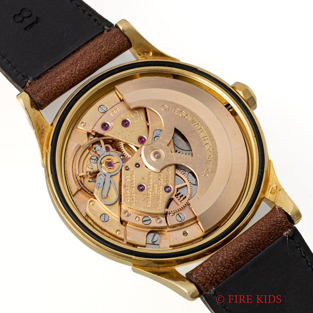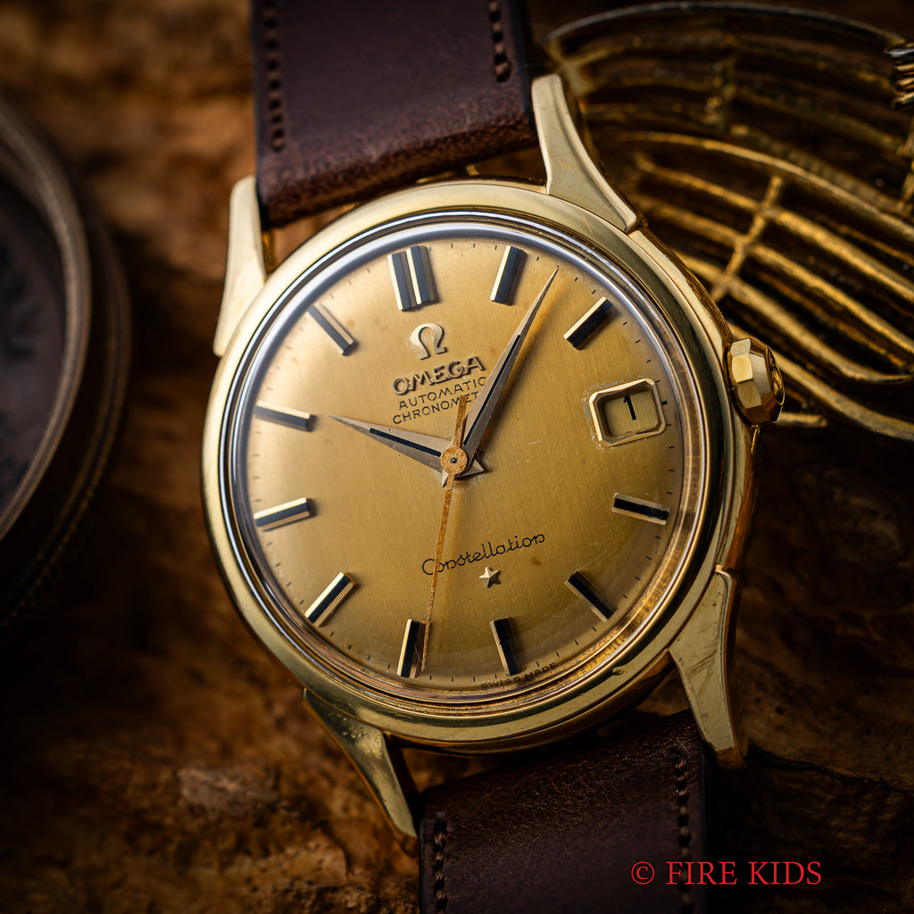 オメガ 18金無垢コンステレーション 1961年製 クロノメーター自動巻き Cal.561の入荷になります。オメガの最高級ラインであるコンステレーションの中でも高級感のある18金無垢ケース、オニキスインデックス、シャンパンダイヤルです。裏ブタの天文台メダリオンもしっかり残っています。ムーブメントはクロノメーターのCal.561を搭載。ケースは小傷はありますが大きなダメージはありません。手巻きや針回しの操作はスムースです。ベルトはファイアーキッズオリジナルイタリアンレザーのブッテーロ(裏面ラバー)が取り付けられています。こちらの時計は分解掃除済みです。