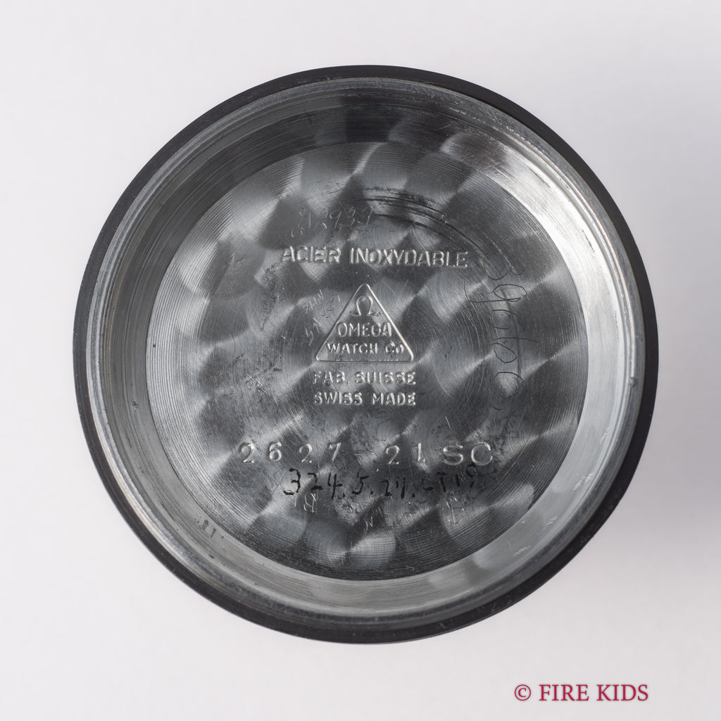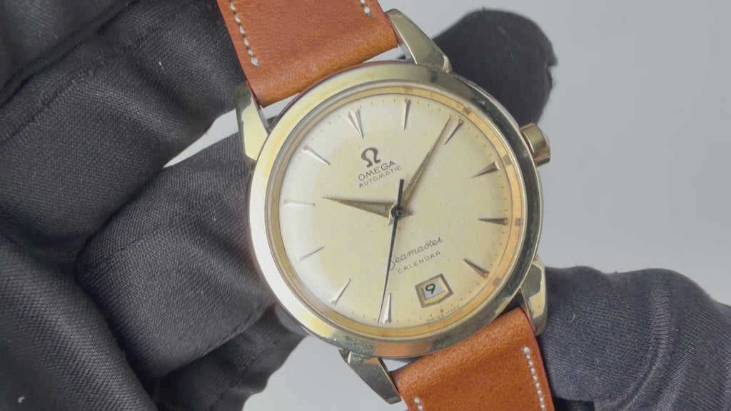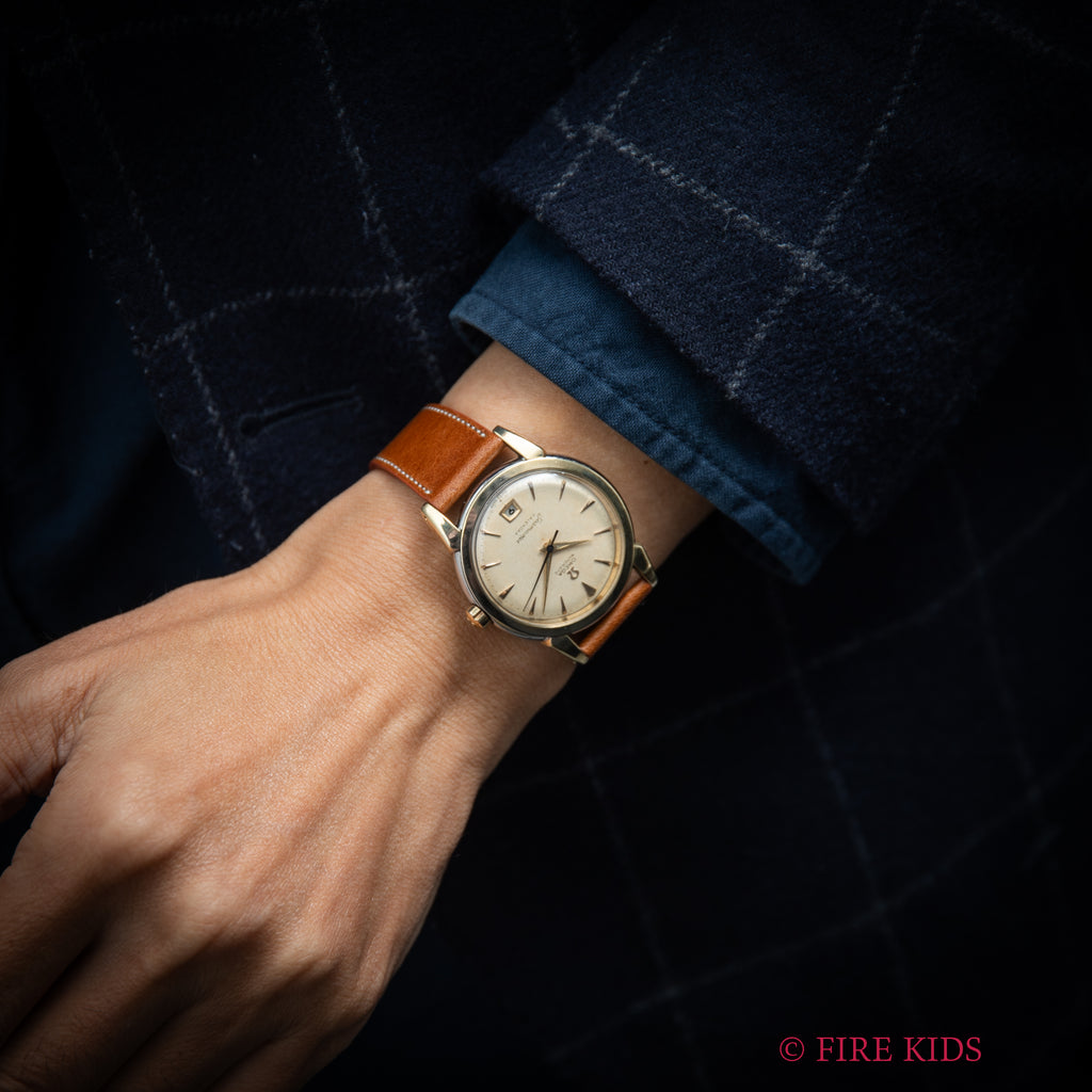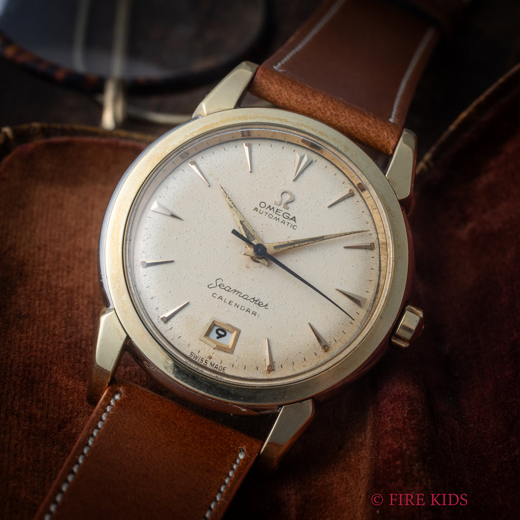1950年製のオメガ シーマスターカレンダー トップゴールドです。初期のシーマスターらしい太くガッシリしたラグに厚みのあるスナップ防水ケースは存在感があります。文字盤も50年代らしくクサビインデックスの組み合わせで、エイジングしたアイボリーダイヤルが堪りません。ハーフローターのCal.353を搭載し、独特の感触が魅力的です。巻き上げ効率は劣る部分がありますので、ある程度手巻きをしてからご使用いただくのがおススメです。ベルトはファイアーキッズオリジナルのブッテーロレザーが取り付けてあります。
