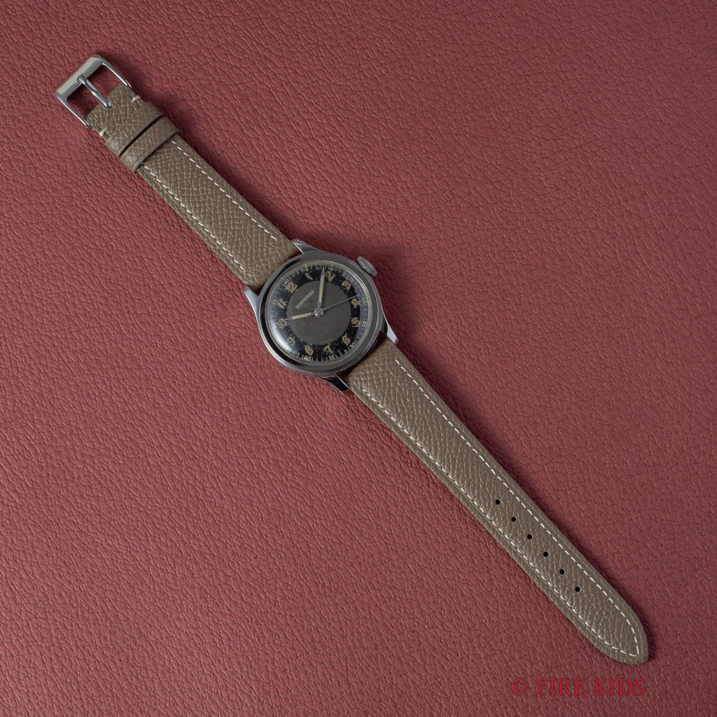 ロンジン セイタケ Ref.22133 ブルズアイ Cal.12.68N 1945年製です。ロンジンの名作セイタケ(六つ詰めのスクリューバックケース)ステップベゼルです。ブルズアイデザインもカッコいいです。針夜光は修正してありますが雰囲気は良いです。ベルトは社外の革ベルトを合わせています。手巻きや針回しはスムーズです。