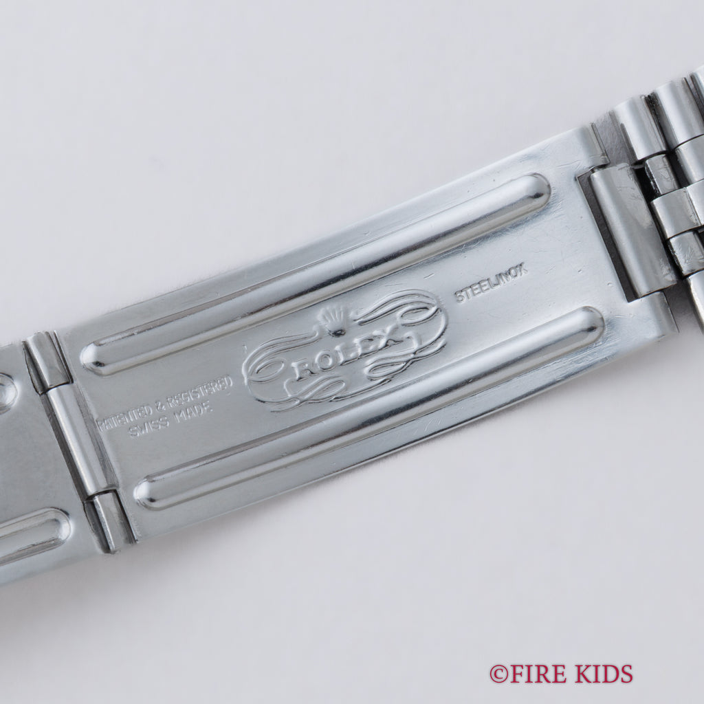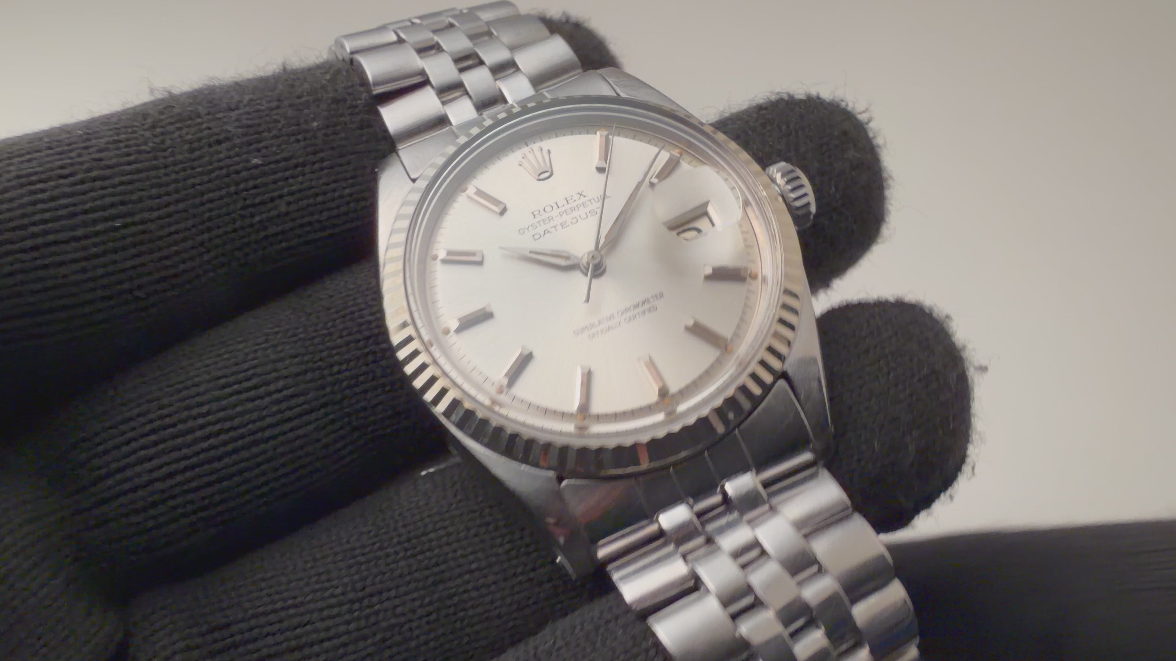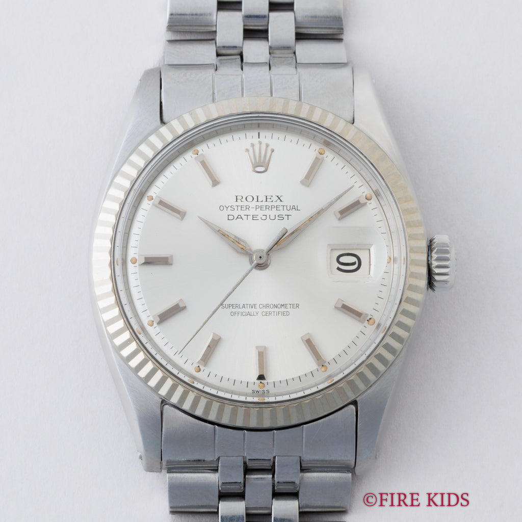 ロレックス デイトジャスト アルファハンド 自動巻き 1963年製 Ref.1601 Cal.1560 ホワイトゴールドベゼルの入荷になります。ロングセラーのデイトジャストRef.1601でもヴィンテージの雰囲気を感じる剣針(アルファハンド)、バーインデックスと60年代らしい雰囲気です。ムーブメントは自動巻きのCal.1560を搭載。ケースは小キズが見られますが大きなダメージはありません。手巻きや針回し、リューズのねじ込みの操作はスムースです。ベルトは純正のステンレスブレスが取り付けられています。こちらは分解掃除済みです。
