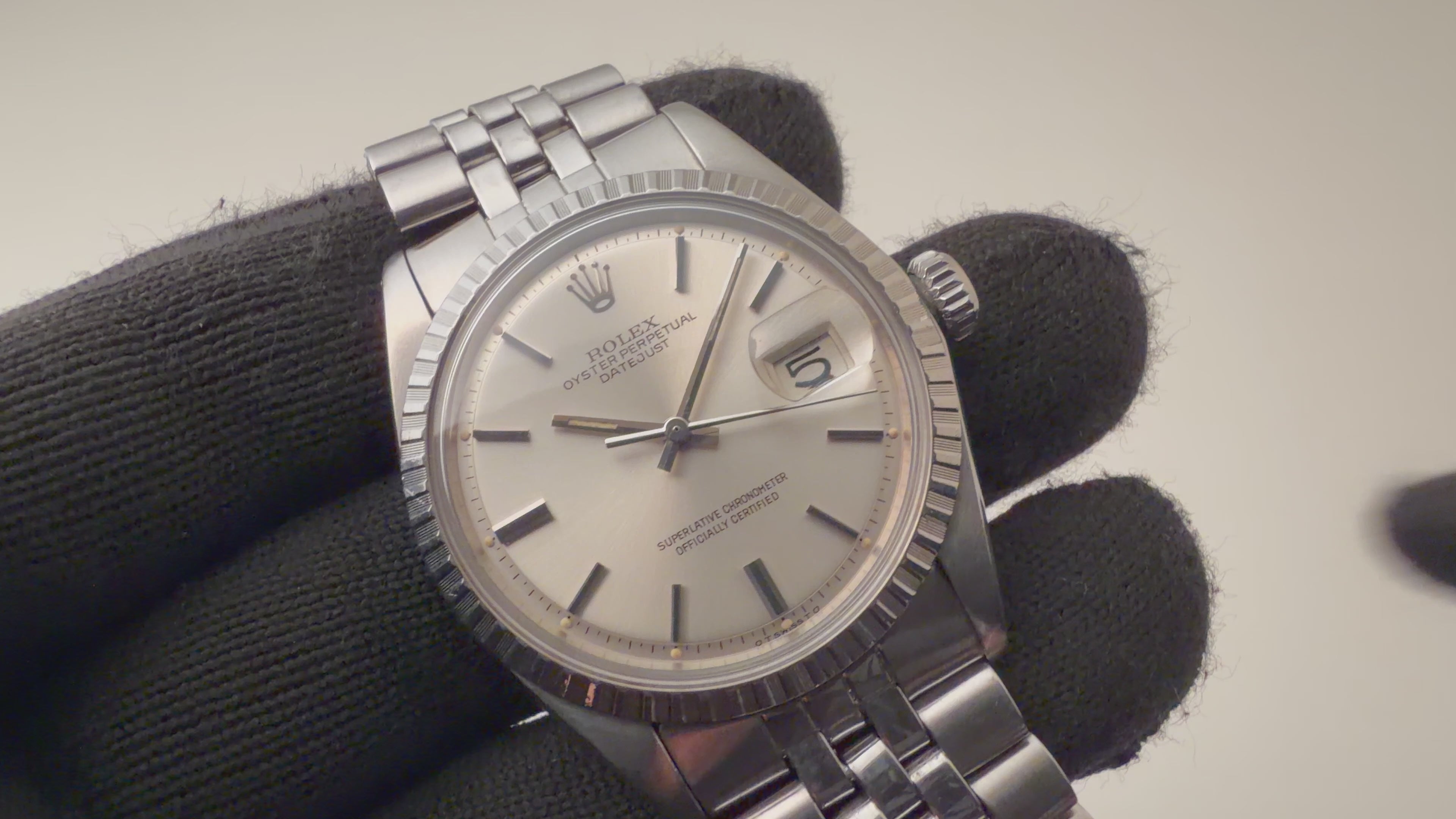 ロレックス デイトジャスト1972年製 Ref.1603 シルバーダイヤル 純正ジュビリーブレスの入荷になります。シンプルなシルバーダイヤルにエングレーブドベゼルが印象的な1本です。文字盤は肉眼で目立つシミ等なく良好なコンディションです。ケースは小傷が見られますが大きなダメージはありません。手巻きや針回し、リューズのねじ込みの操作はスムースです。純正のステンレスジュビリーブレスが取り付けられています。