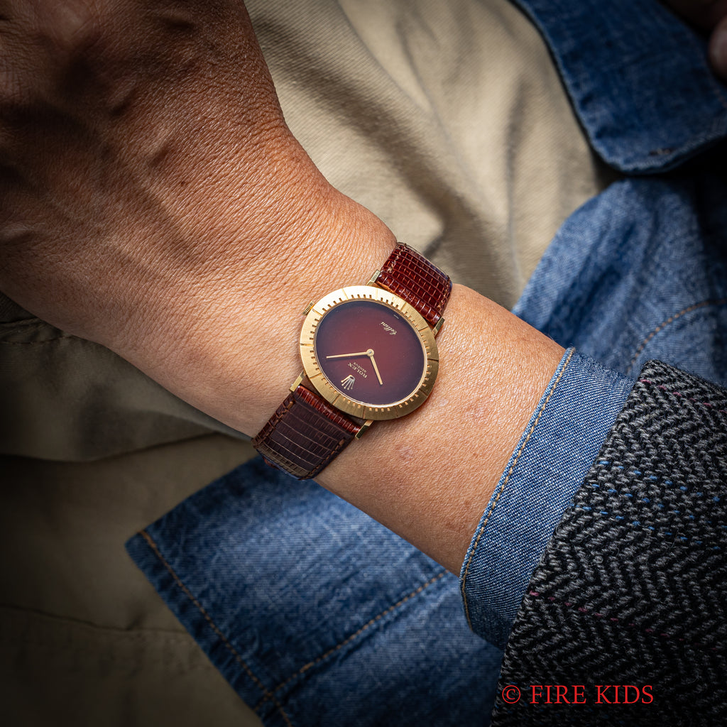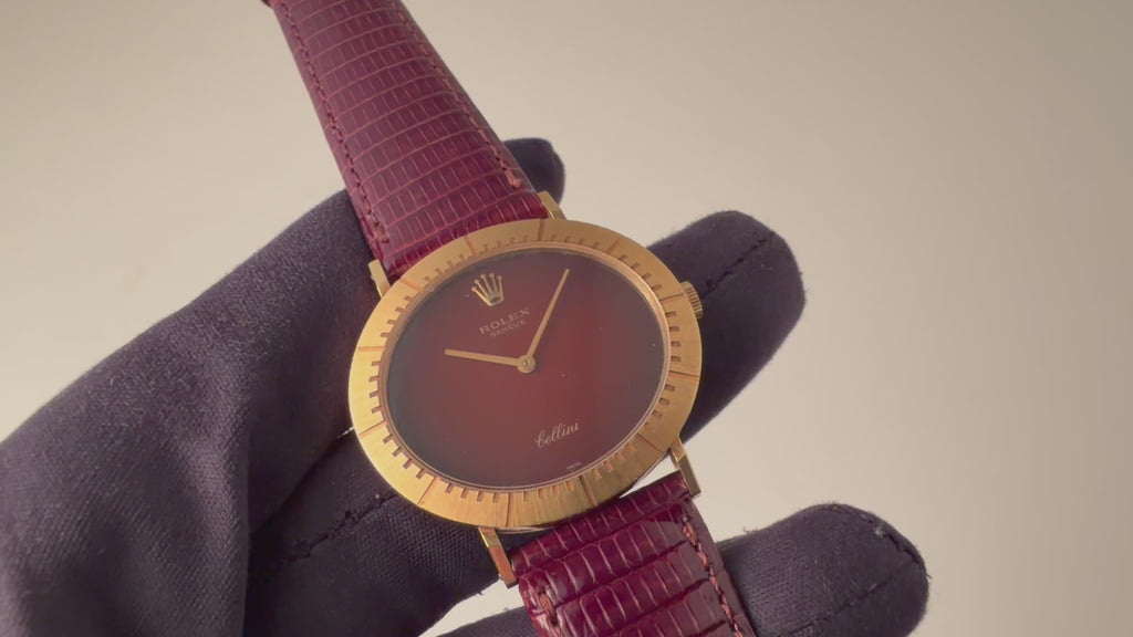ロレックス チェリーニ レッドグラデーションダイヤル 18金無垢 1972年製 オーバル型 手巻き Ref.4083 王冠GP尾錠の入荷になります。18金無垢製のオーバルケースに赤いグラデーションダイヤルが魅力的です。新品時の裏蓋シールが残る使用感の少ない美品になります。ムーブメントは手巻きのCal.1600を搭載。ケースは小傷はございますが大きなダメージはございません。手巻きや針回しの操作はスムースです。ベルトは社外のリザード革ベルトに純正の尾錠が付いています。